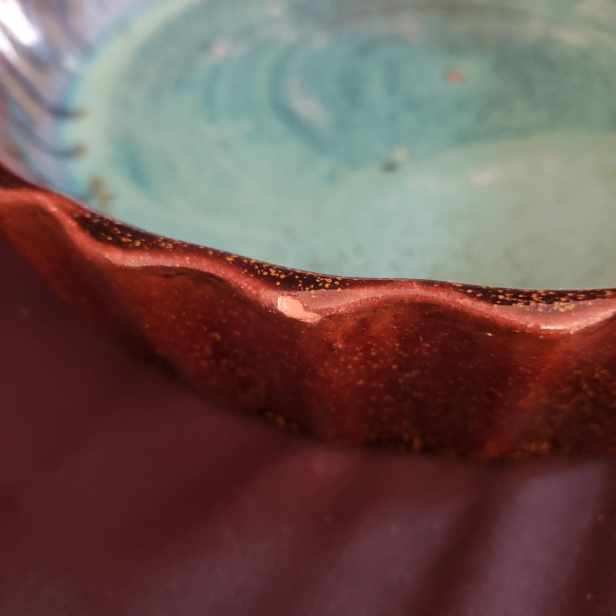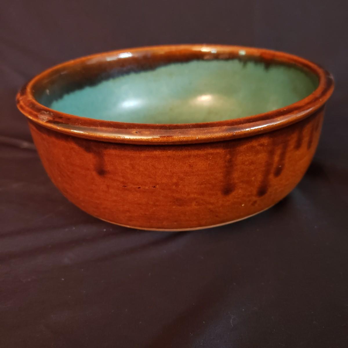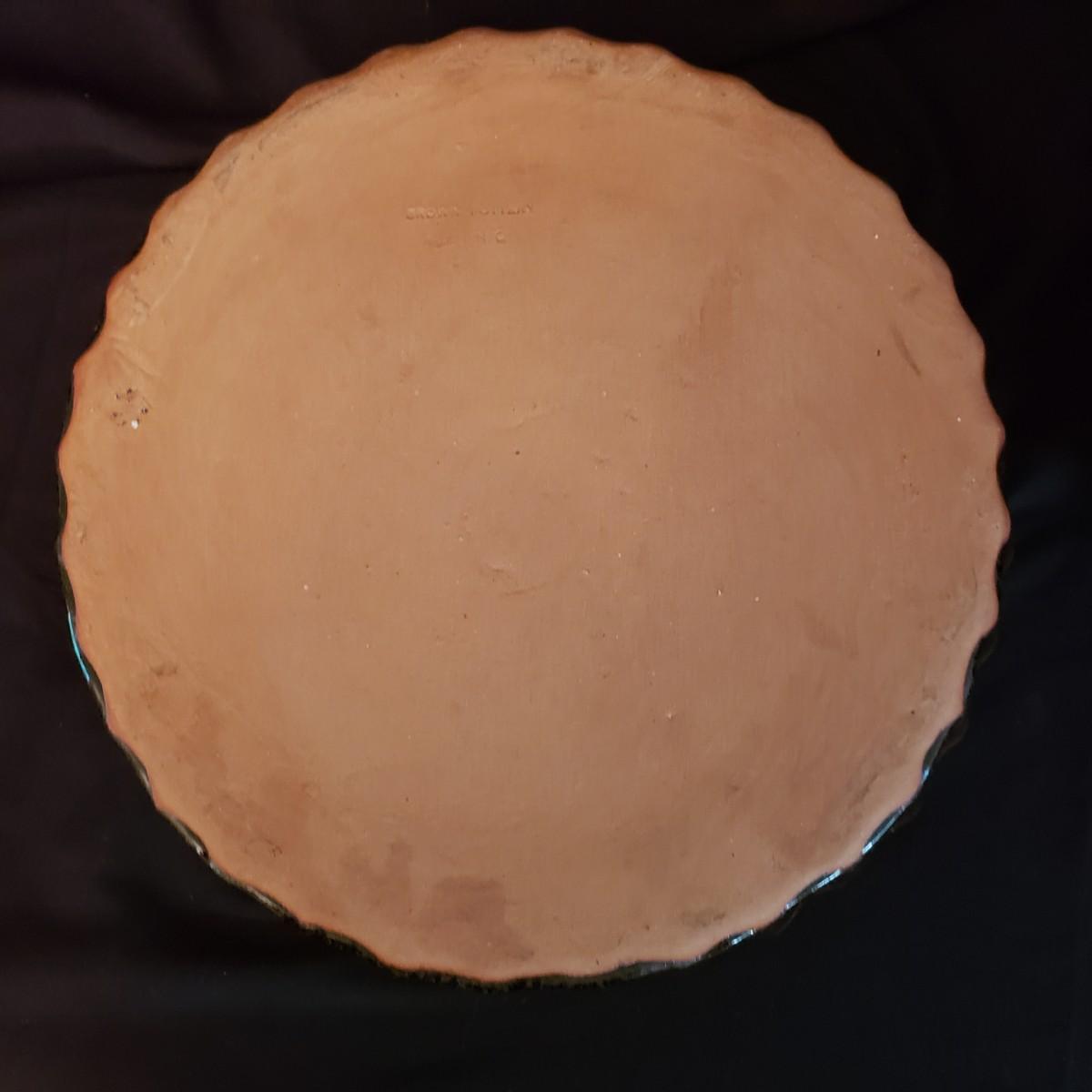 These two pieces were made by Brown's Pottery located in Arden, North Carolina. The brown and green glazed bowl measures approximately 9" x 4"H. The pie pan also features brown and green glaze and measures approximately 11" x 2"H. There is a small chip on the rim of the pie pan, see pictures. The bowl has a discoloration on the side, see picture.
