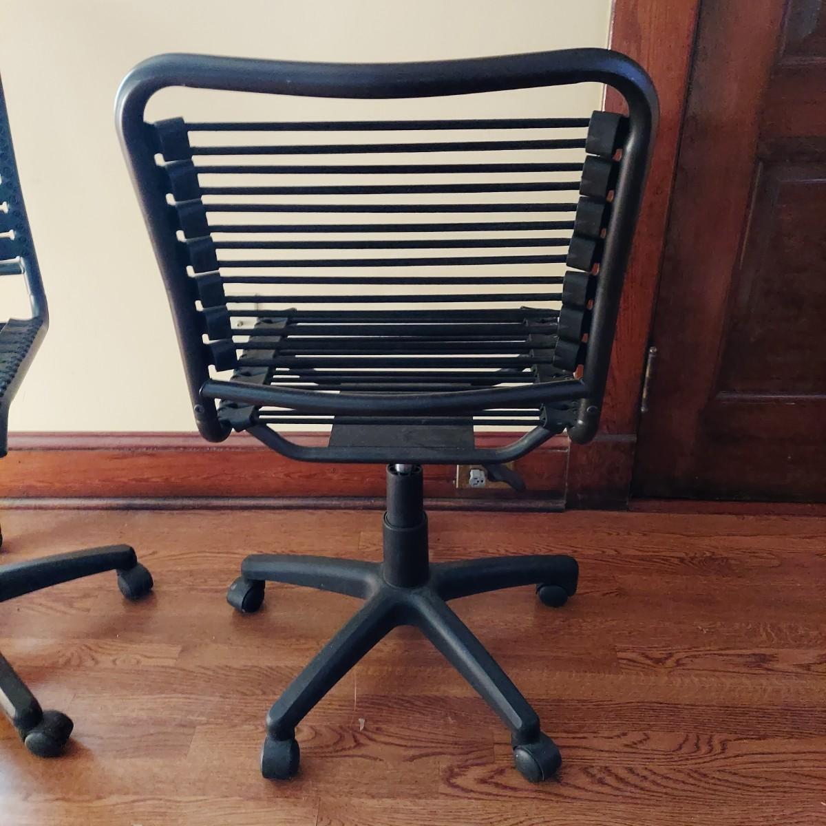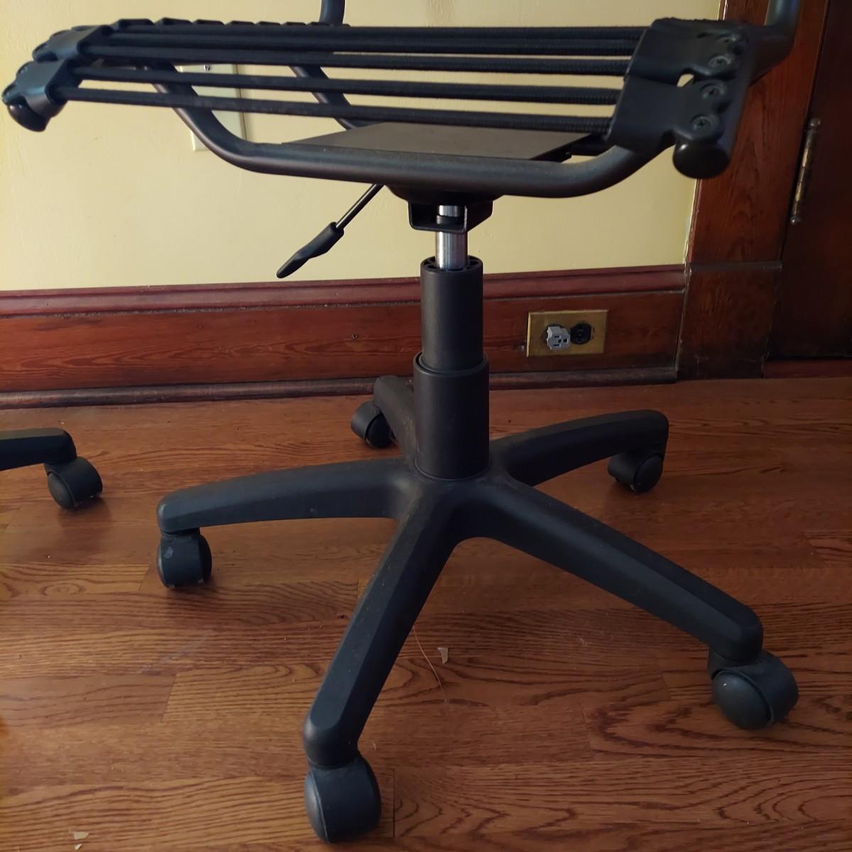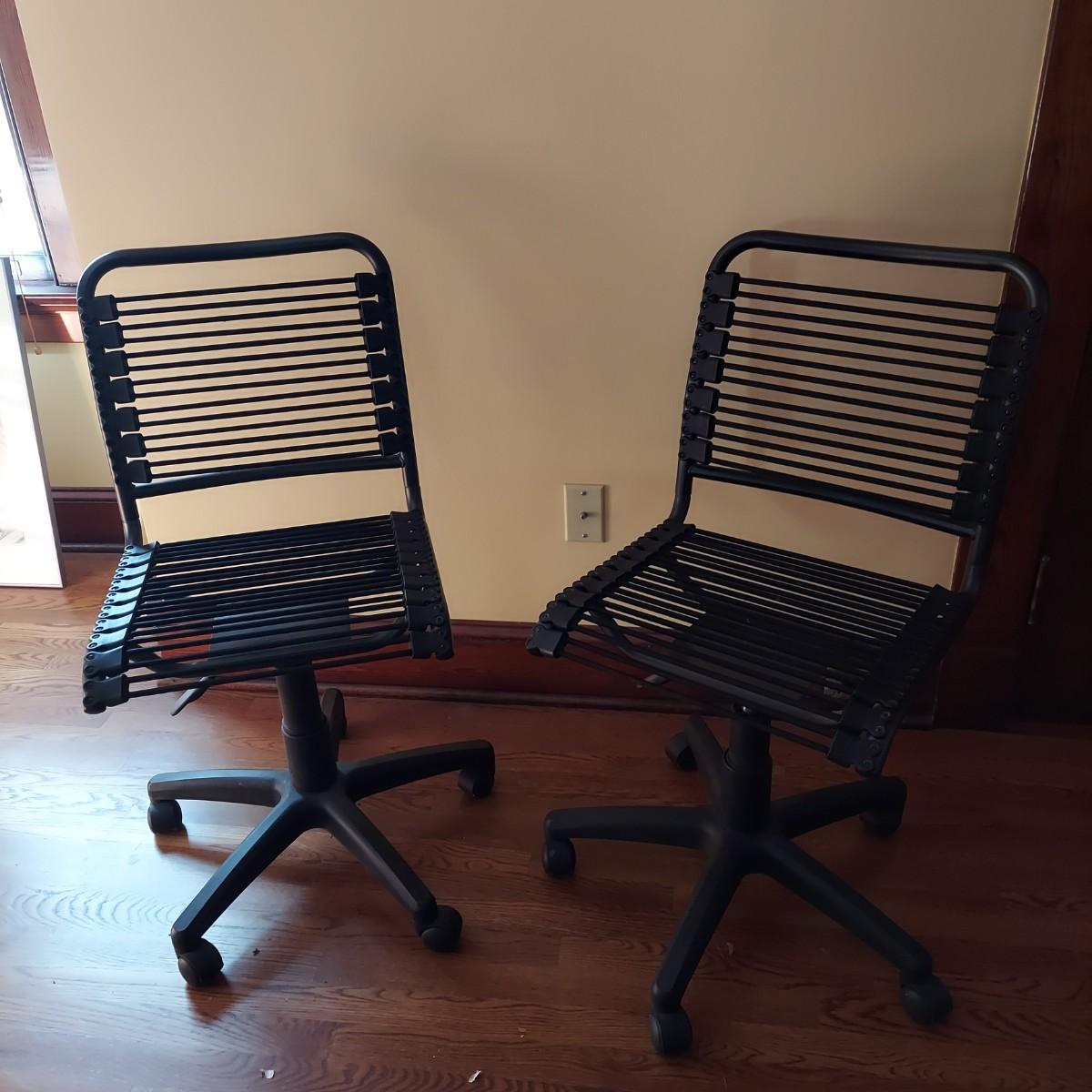 Two black rolling office chairs with stretch support. Label shows that they are Euro Style Inc. brand. Each chair is adjustable and measures 18” x 24” x 36"H with a 21"H seat height at its highest and a 16”H seat height at its lowest. Please see photos for details. Local Pickup Only
