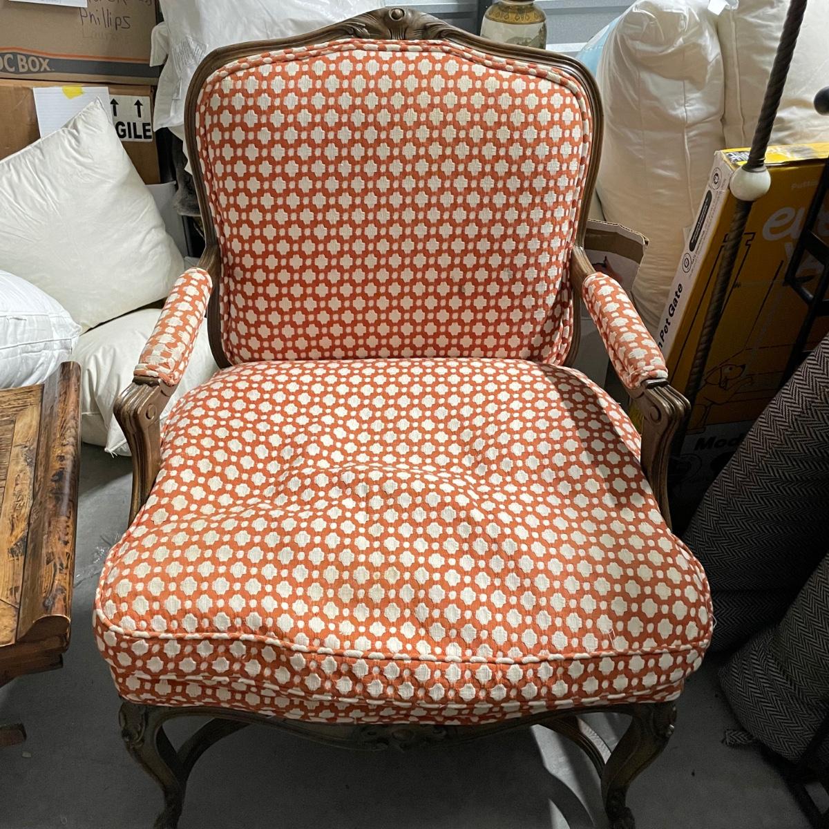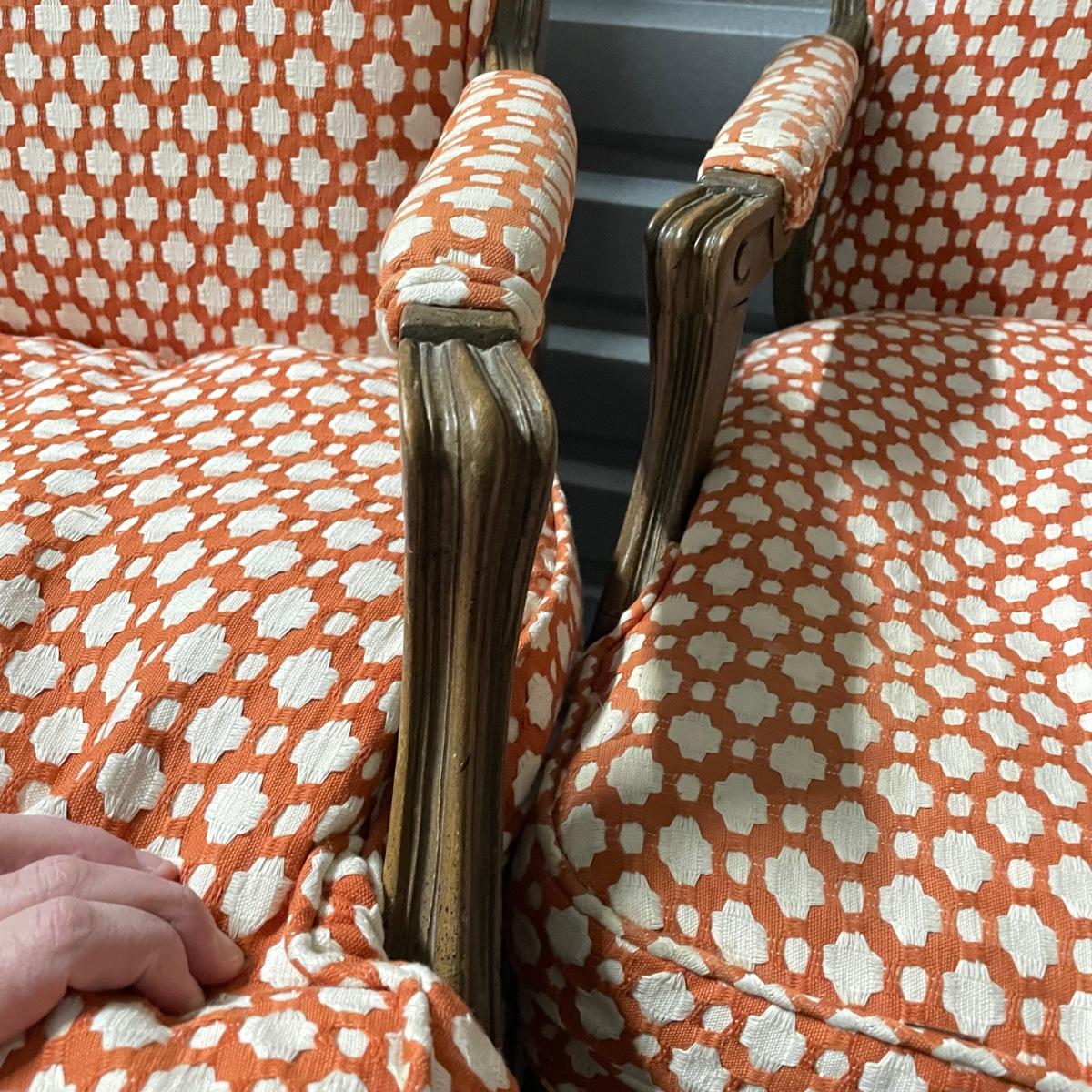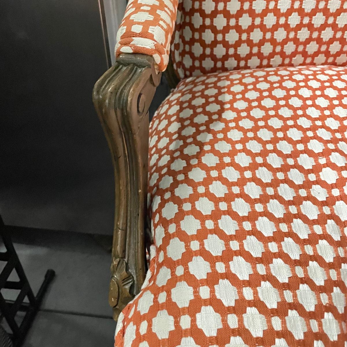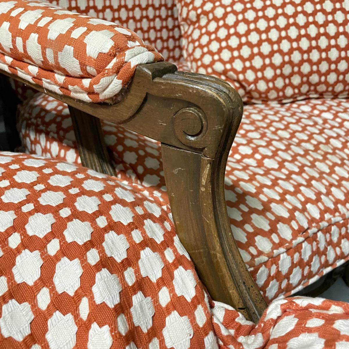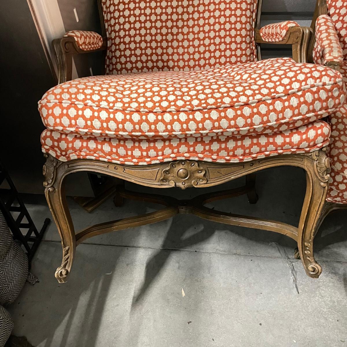 A matching pair of vintage, upholstered wood framed armchairs in a French Fauteuils style. There is one extra matching accent pillow. The seller states that the chairs are covered in Schumacher Betwixt fabric by Celerie Kemble. Seat cushions are a little lumpy, almost as if they are down feathers. Wood is ornately carved with hidden adornments on the seat and around the frame. Chairs show normal wear with a few blemishes on the right chair’s armrests. Chairs measure 26” x 29” x 37”H with a seat height around 18.5”H. Please see photos for details. Local pick up only.