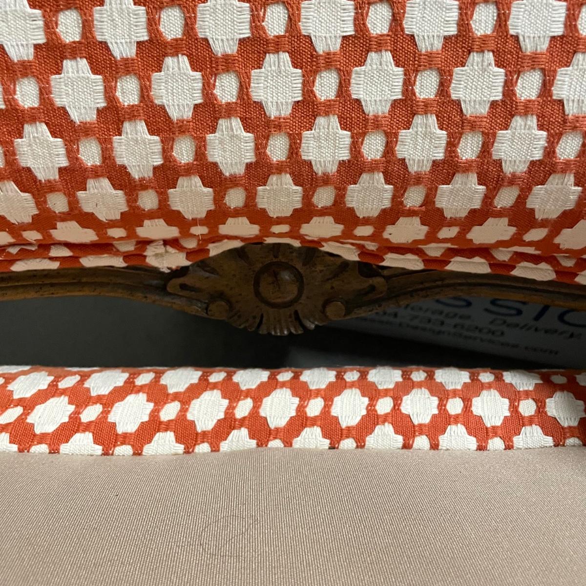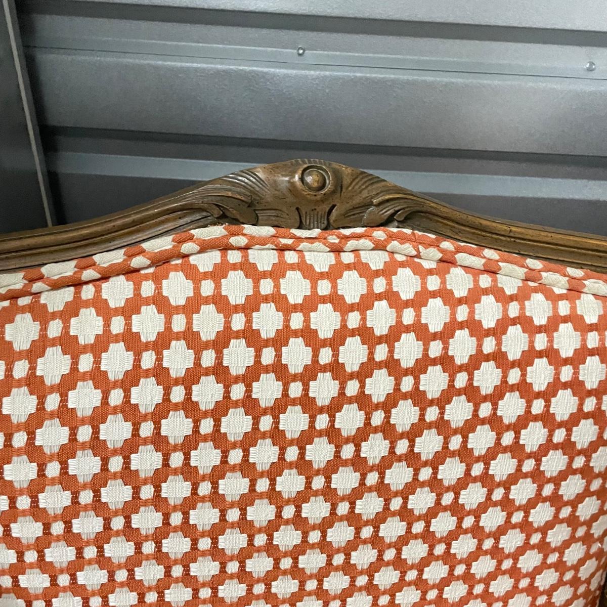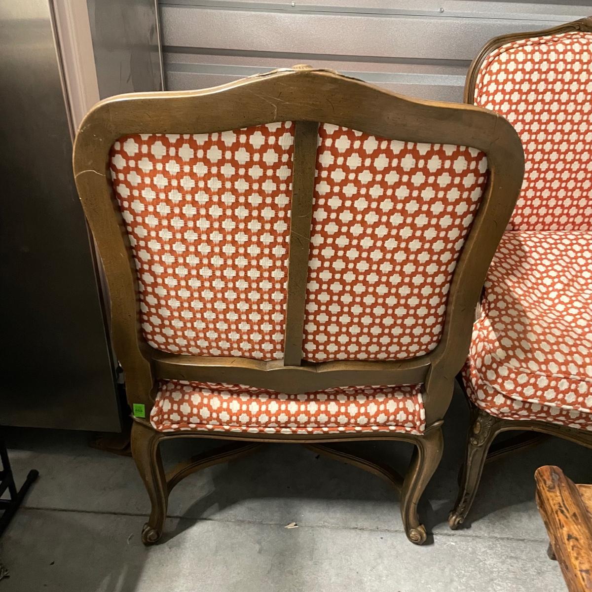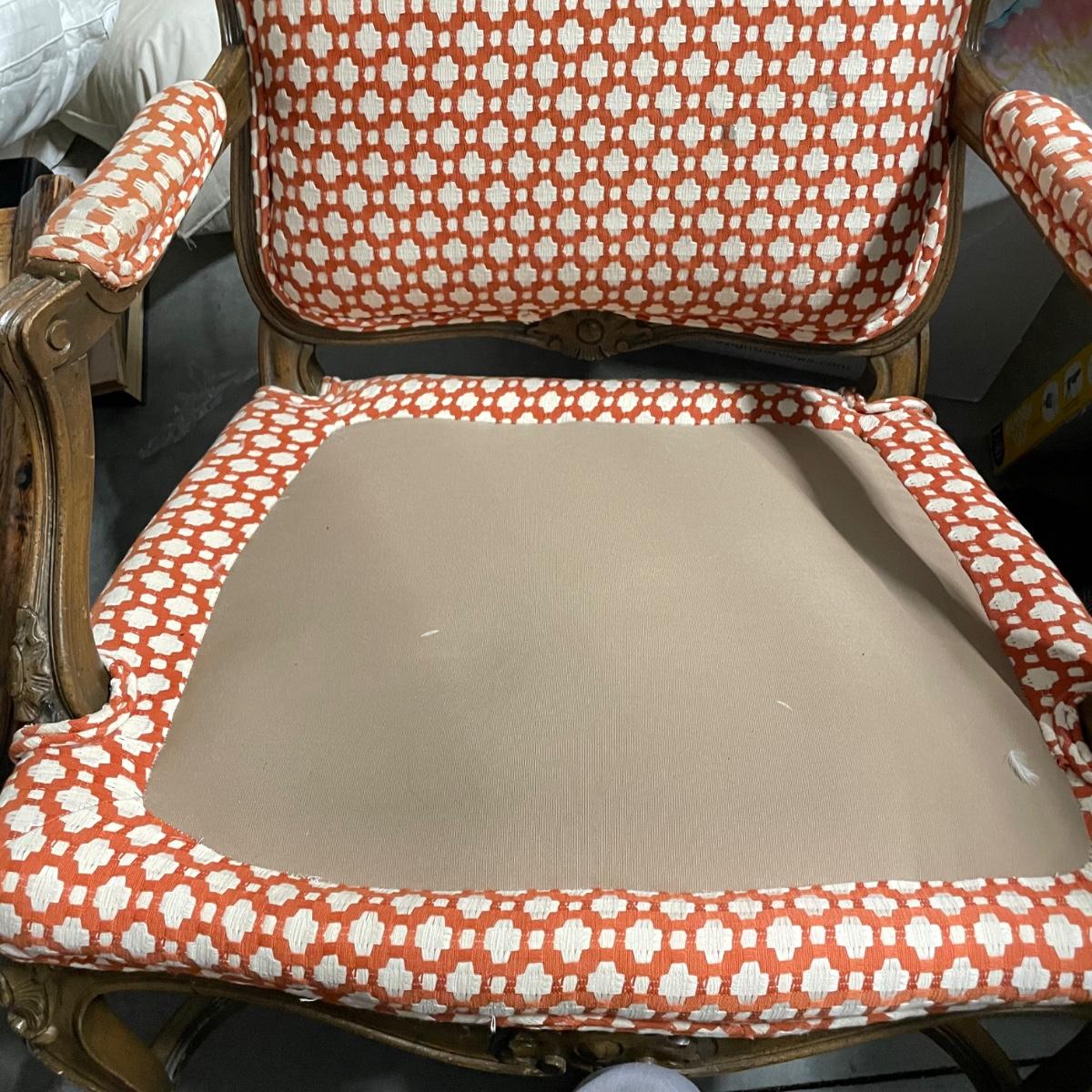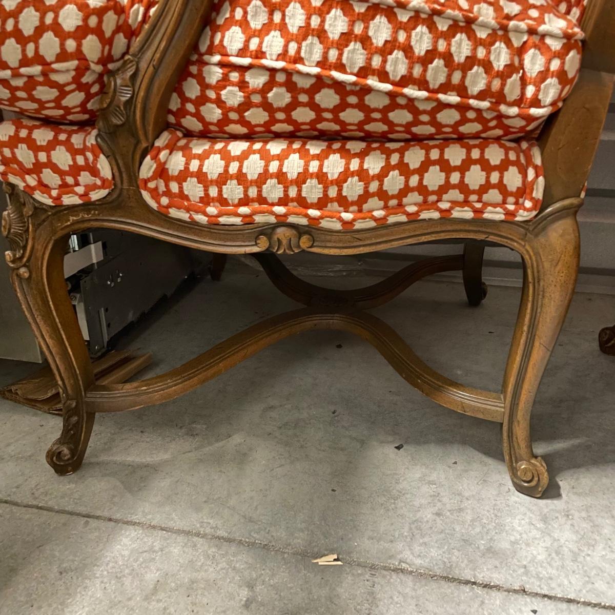 A matching pair of vintage, upholstered wood framed armchairs in a French Fauteuils style. There is one extra matching accent pillow. The seller states that the chairs are covered in Schumacher Betwixt fabric by Celerie Kemble. Seat cushions are a little lumpy, almost as if they are down feathers. Wood is ornately carved with hidden adornments on the seat and around the frame. Chairs show normal wear with a few blemishes on the right chair’s armrests. Chairs measure 26” x 29” x 37”H with a seat height around 18.5”H. Please see photos for details. Local pick up only.