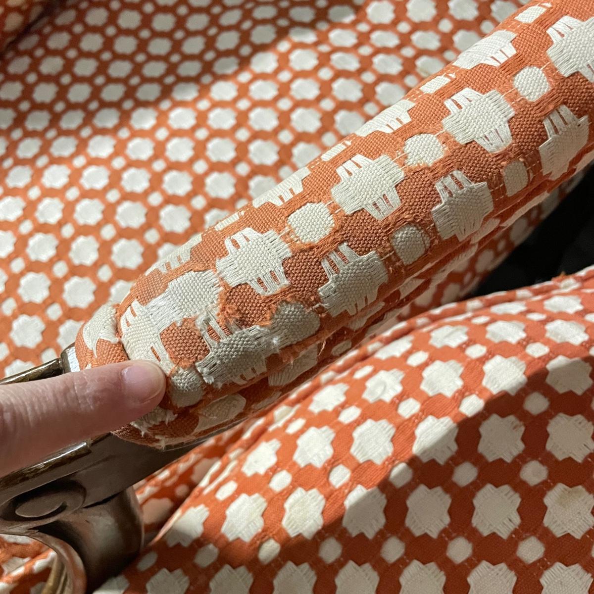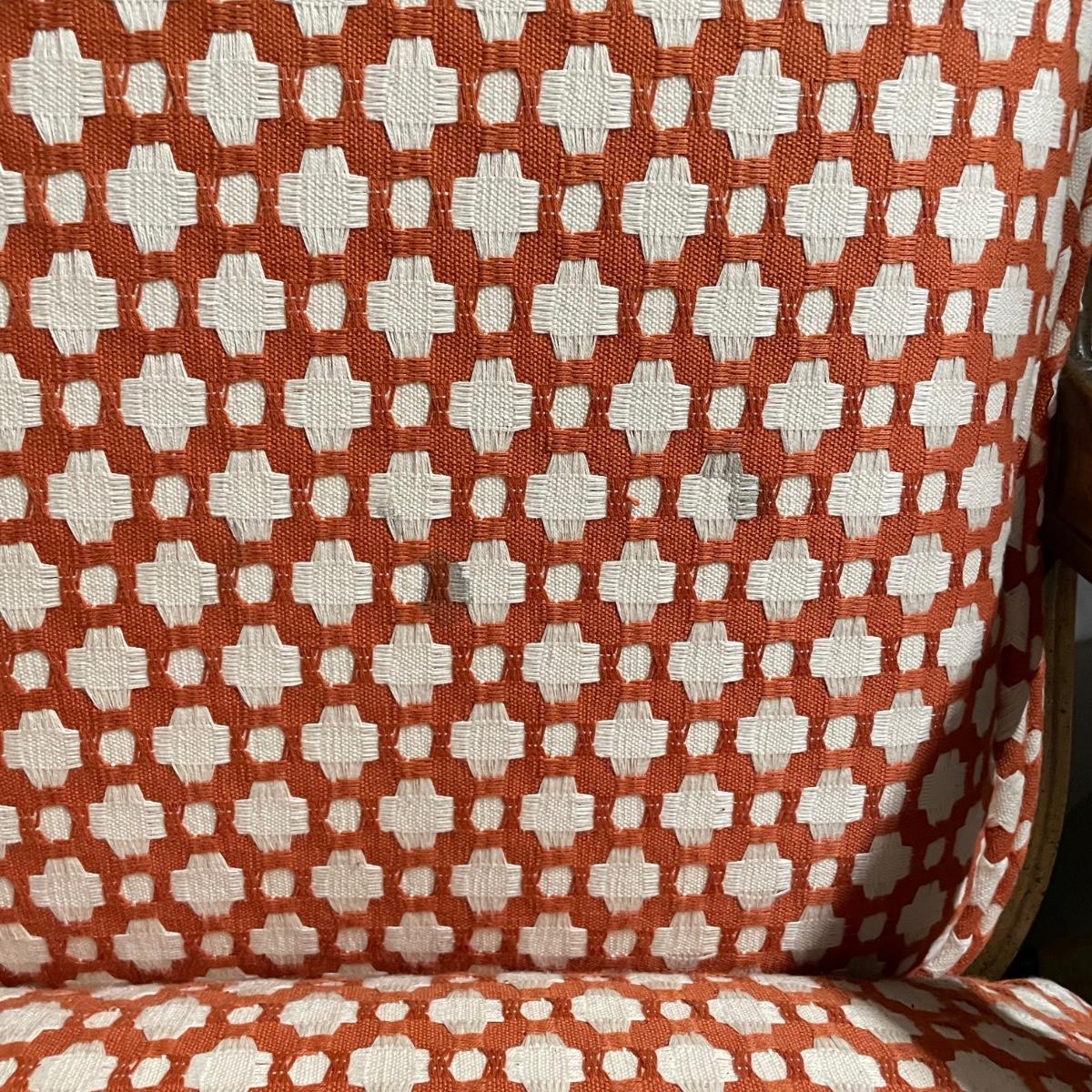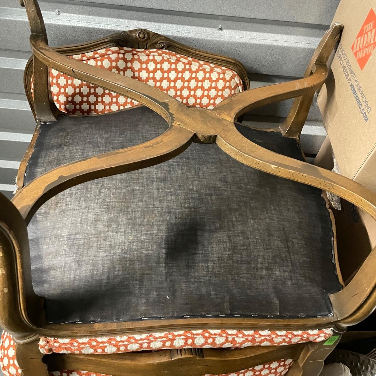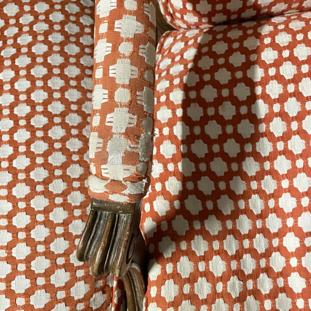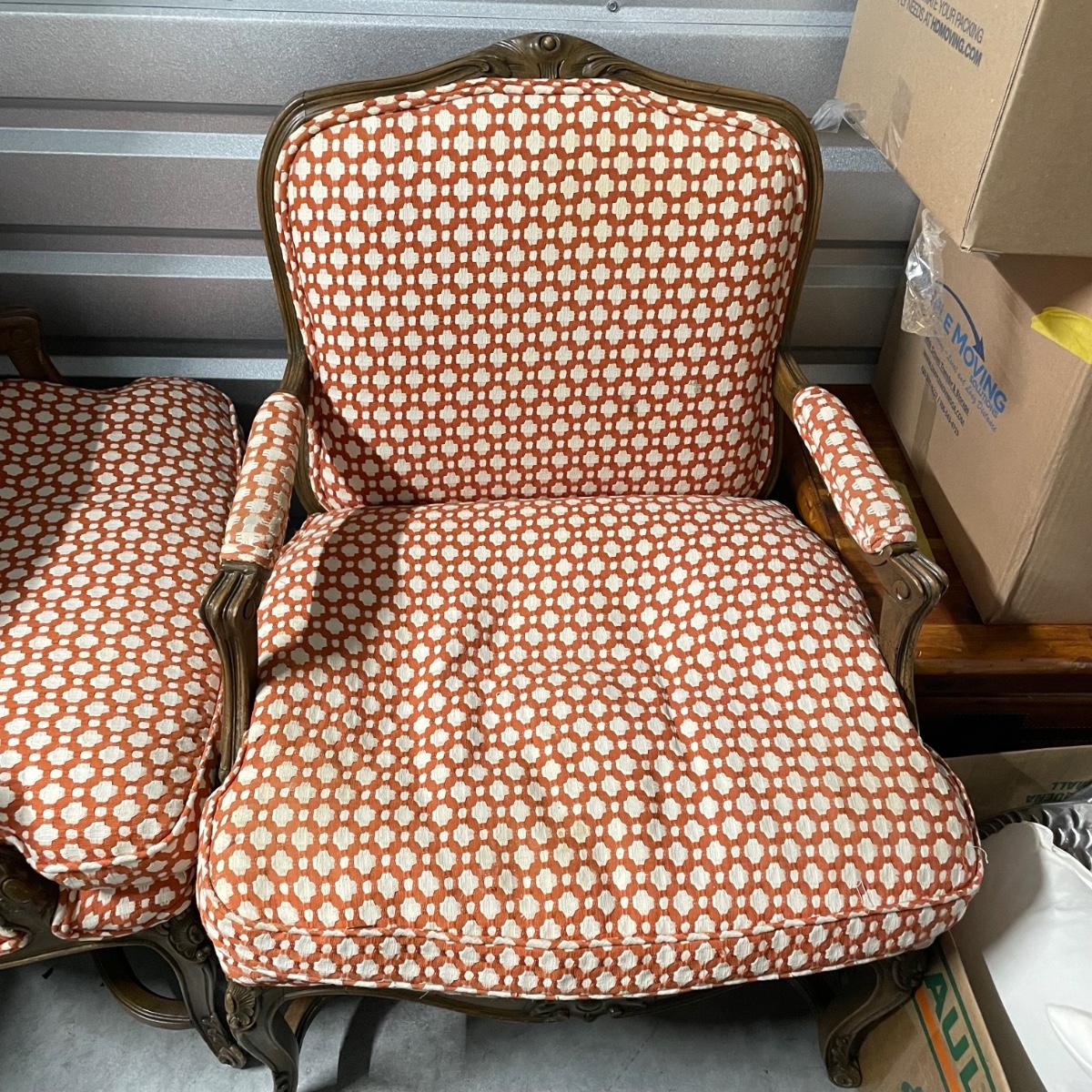 A matching pair of vintage, upholstered wood framed armchairs in a French Fauteuils style. There is one extra matching accent pillow. The seller states that the chairs are covered in Schumacher Betwixt fabric by Celerie Kemble. Seat cushions are a little lumpy, almost as if they are down feathers. Wood is ornately carved with hidden adornments on the seat and around the frame. Chairs show normal wear with a few blemishes on the right chair’s armrests. Chairs measure 26” x 29” x 37”H with a seat height around 18.5”H. Please see photos for details. Local pick up only.