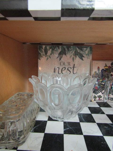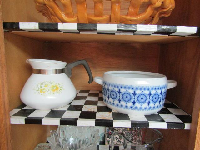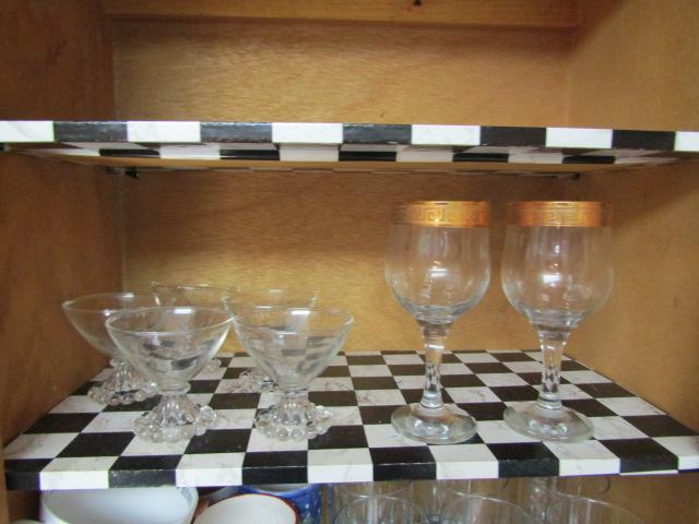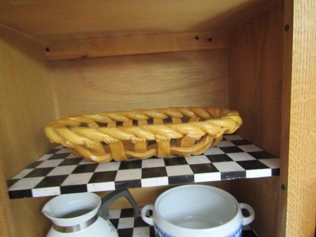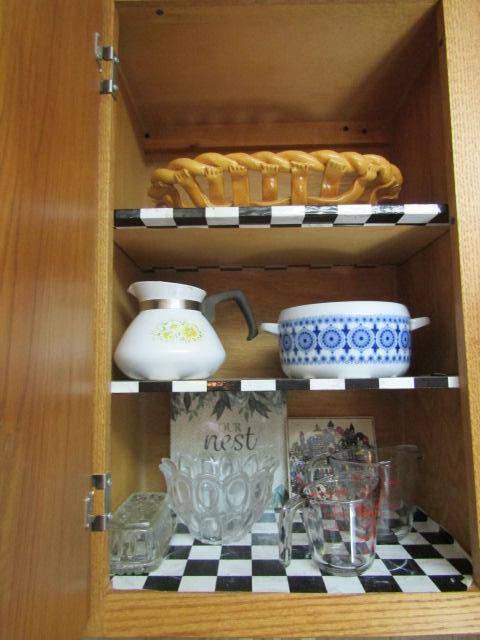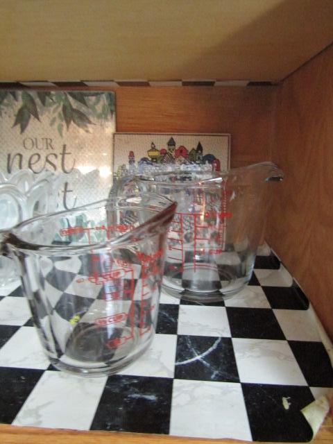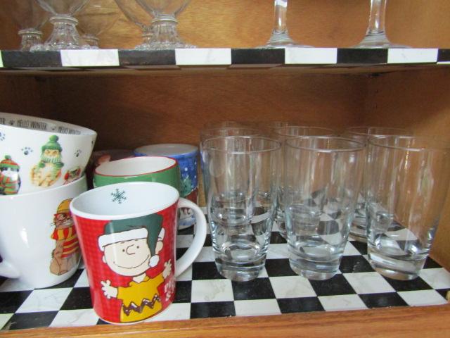 Two Cabinets of Various Kitchen Related Goods- Drinking Glasses, Mugs, Handmade Bread Basket, Measuring Cups, etc.