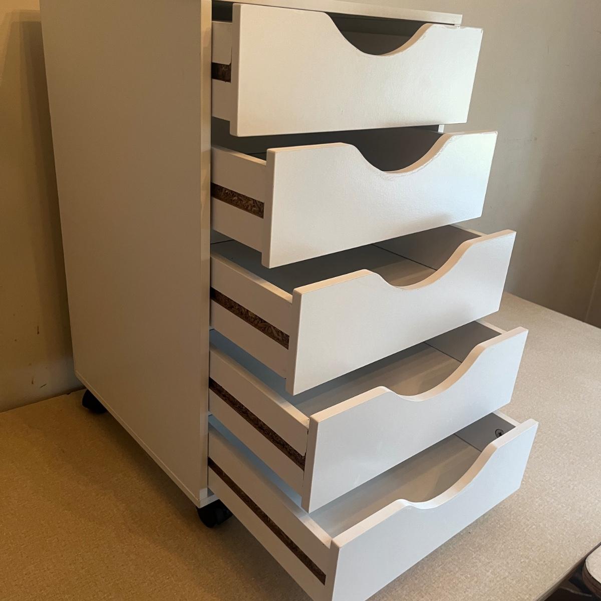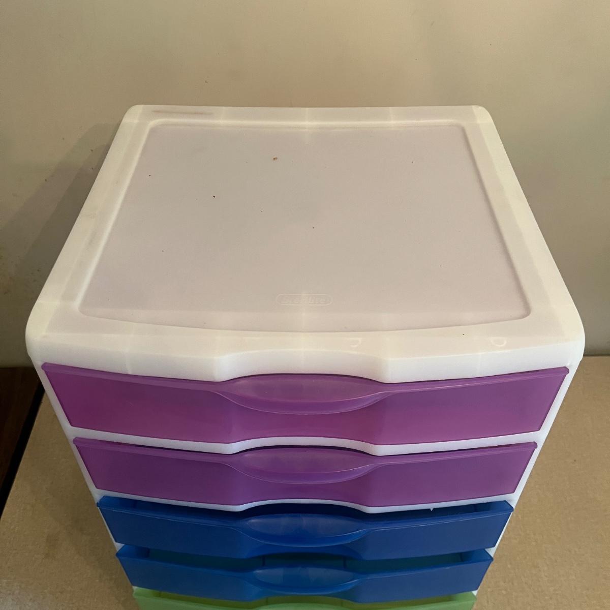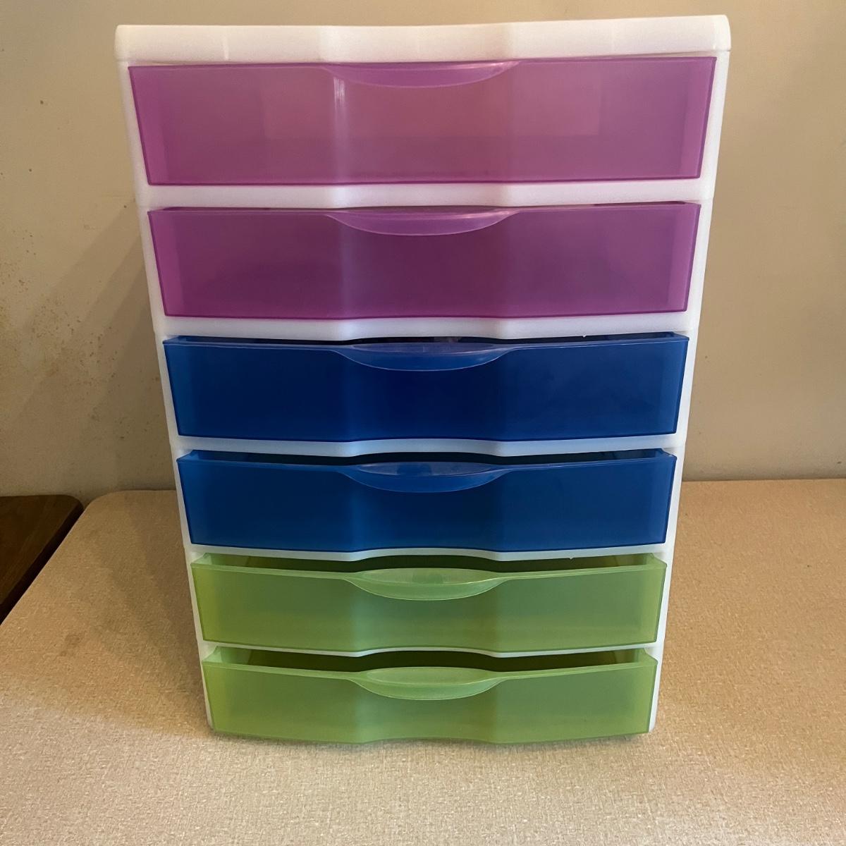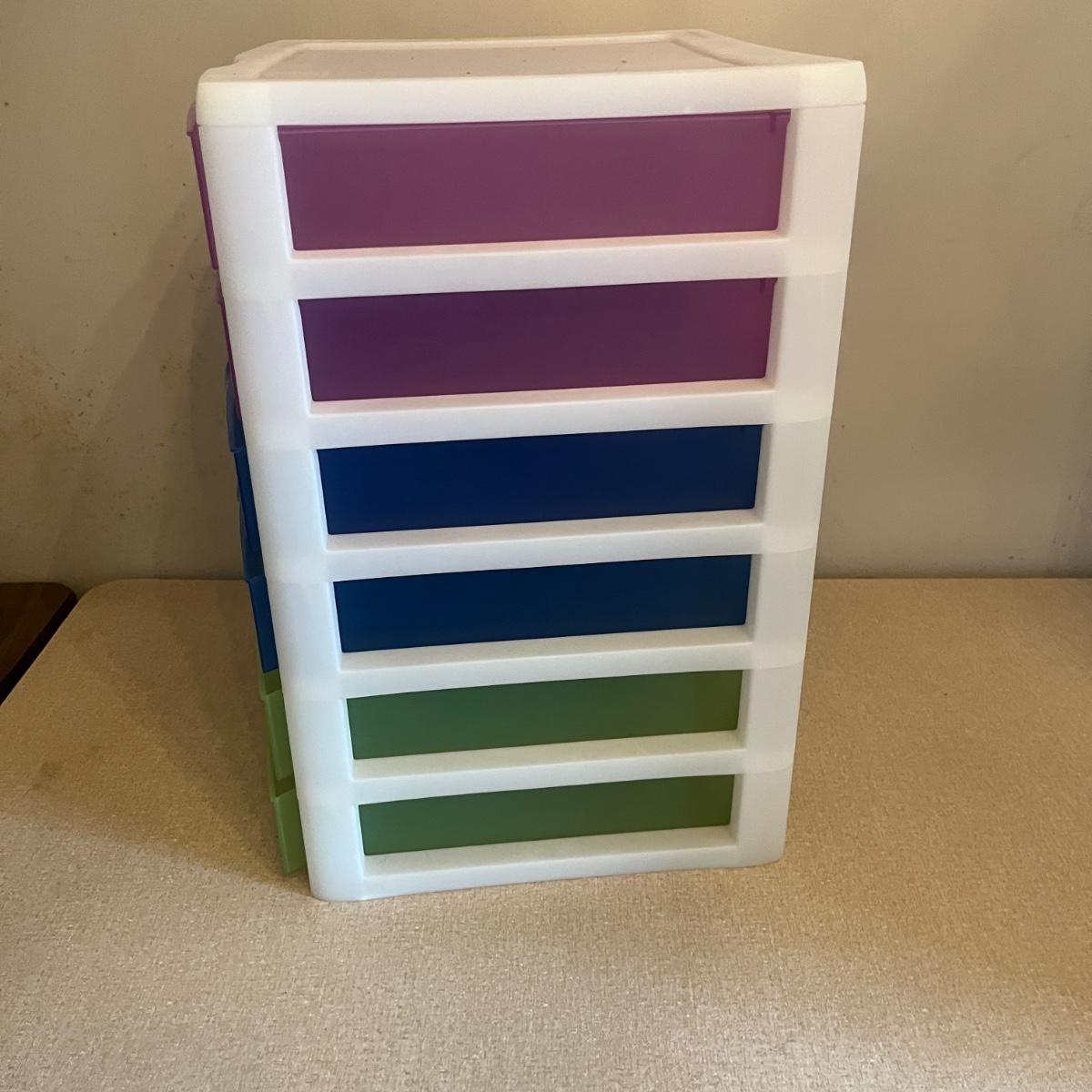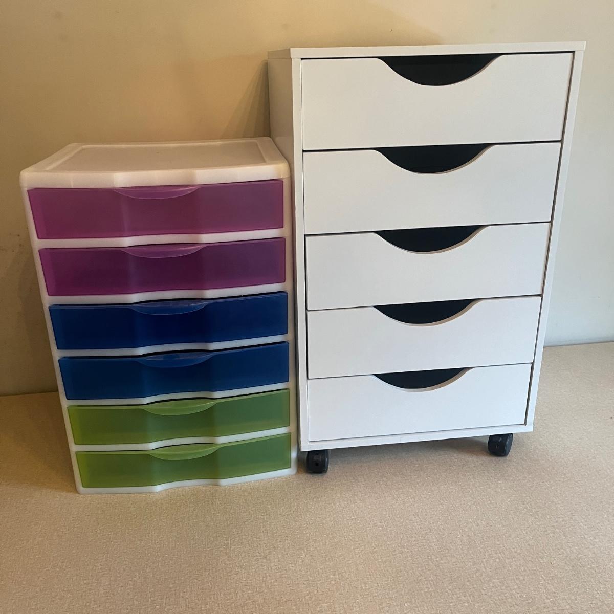 Lot includes a plastic cabinet with six colorful drawers and a pressed wood cabinet with five drawers and wheels. Pressed wood cabinet measures 15.75” x 15.75” x 26”H.