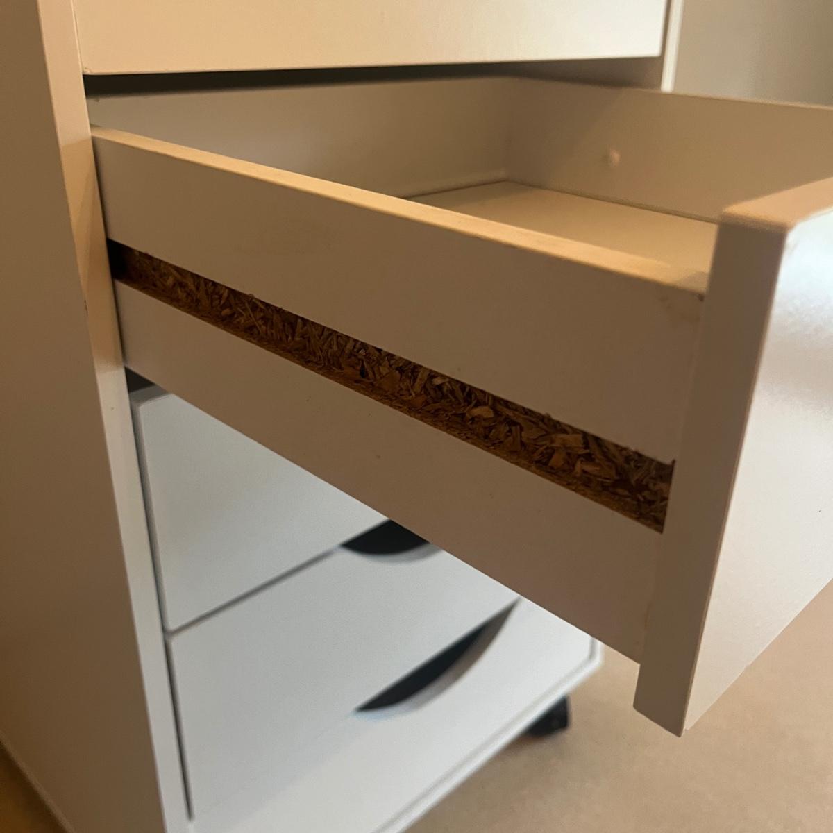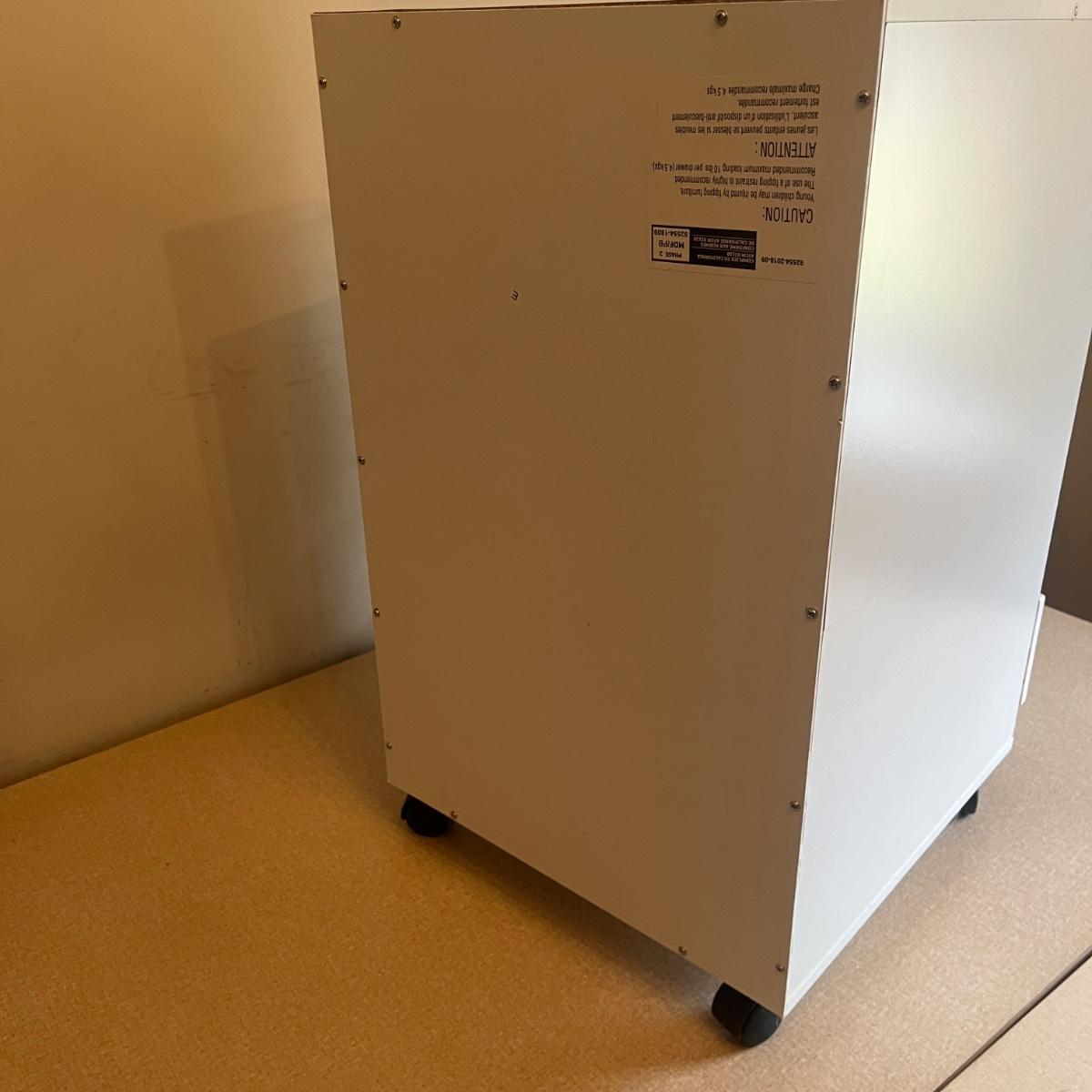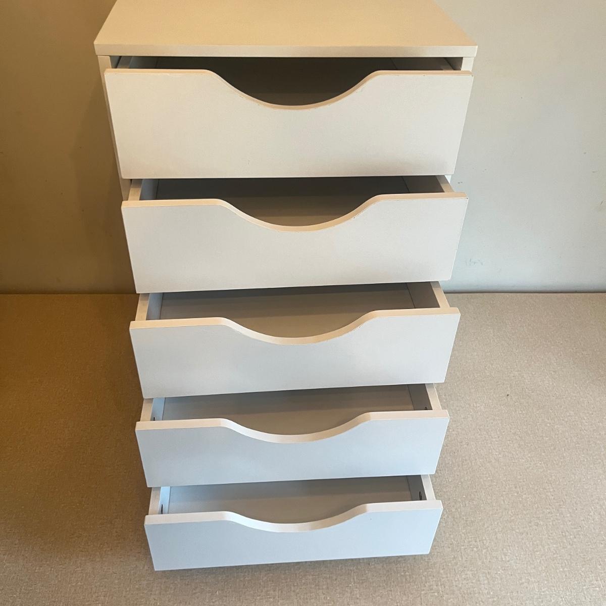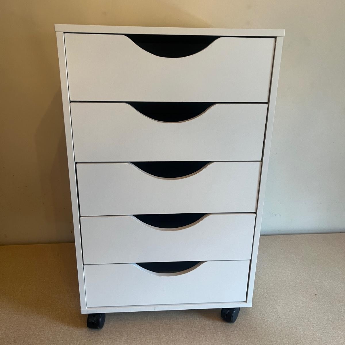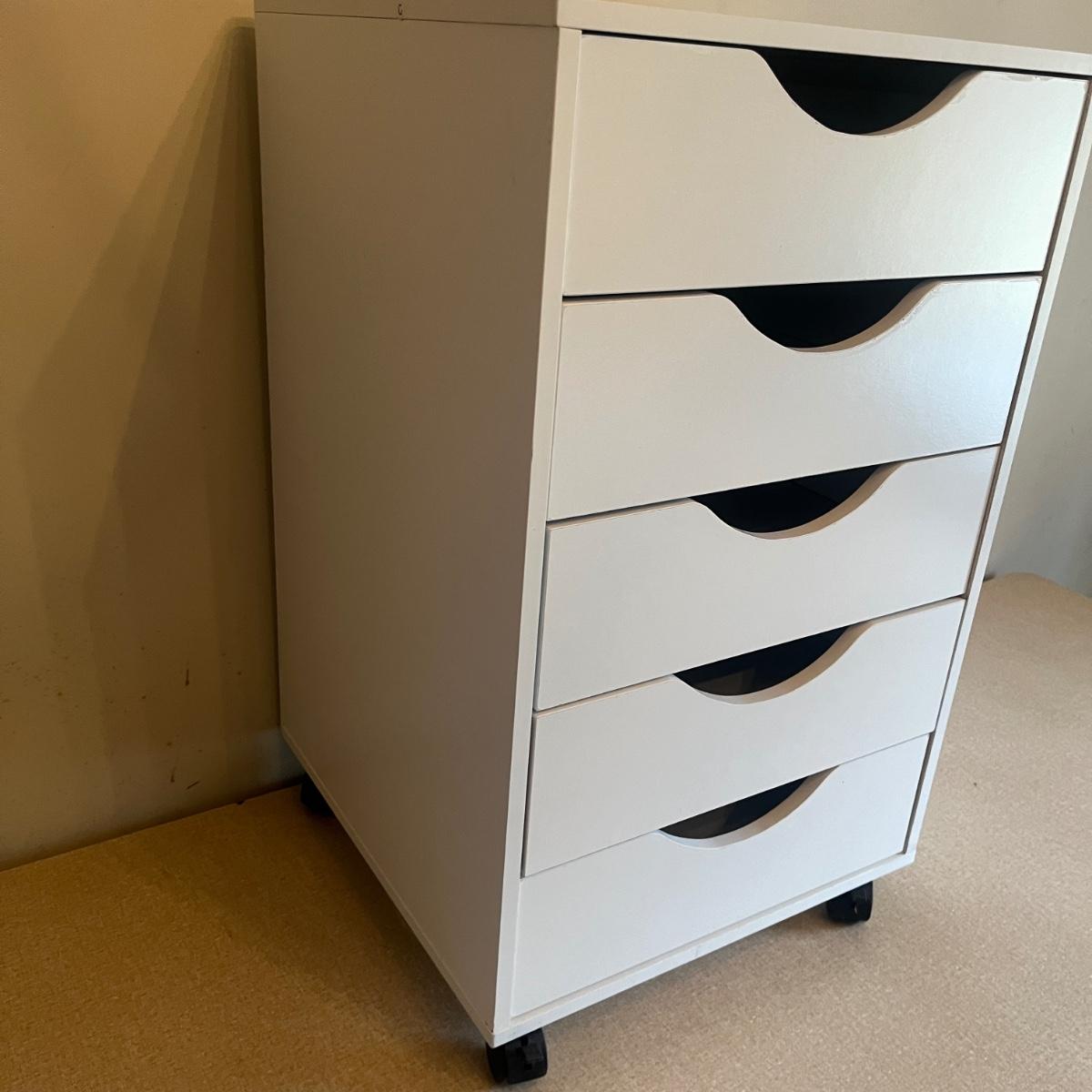 Lot includes a plastic cabinet with six colorful drawers and a pressed wood cabinet with five drawers and wheels. Pressed wood cabinet measures 15.75” x 15.75” x 26”H.