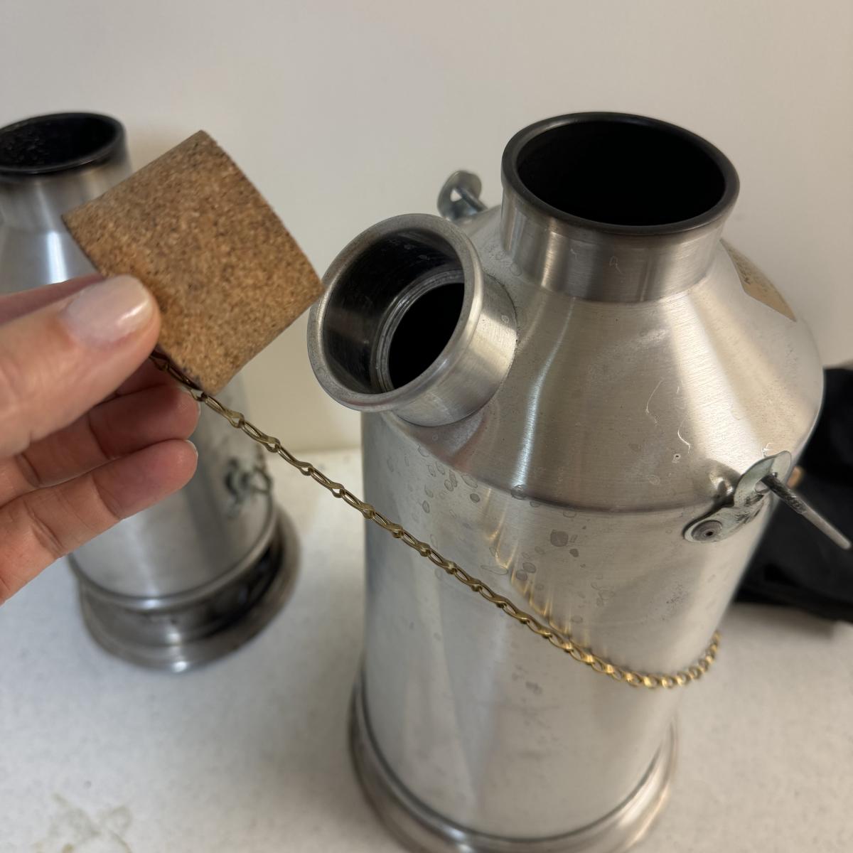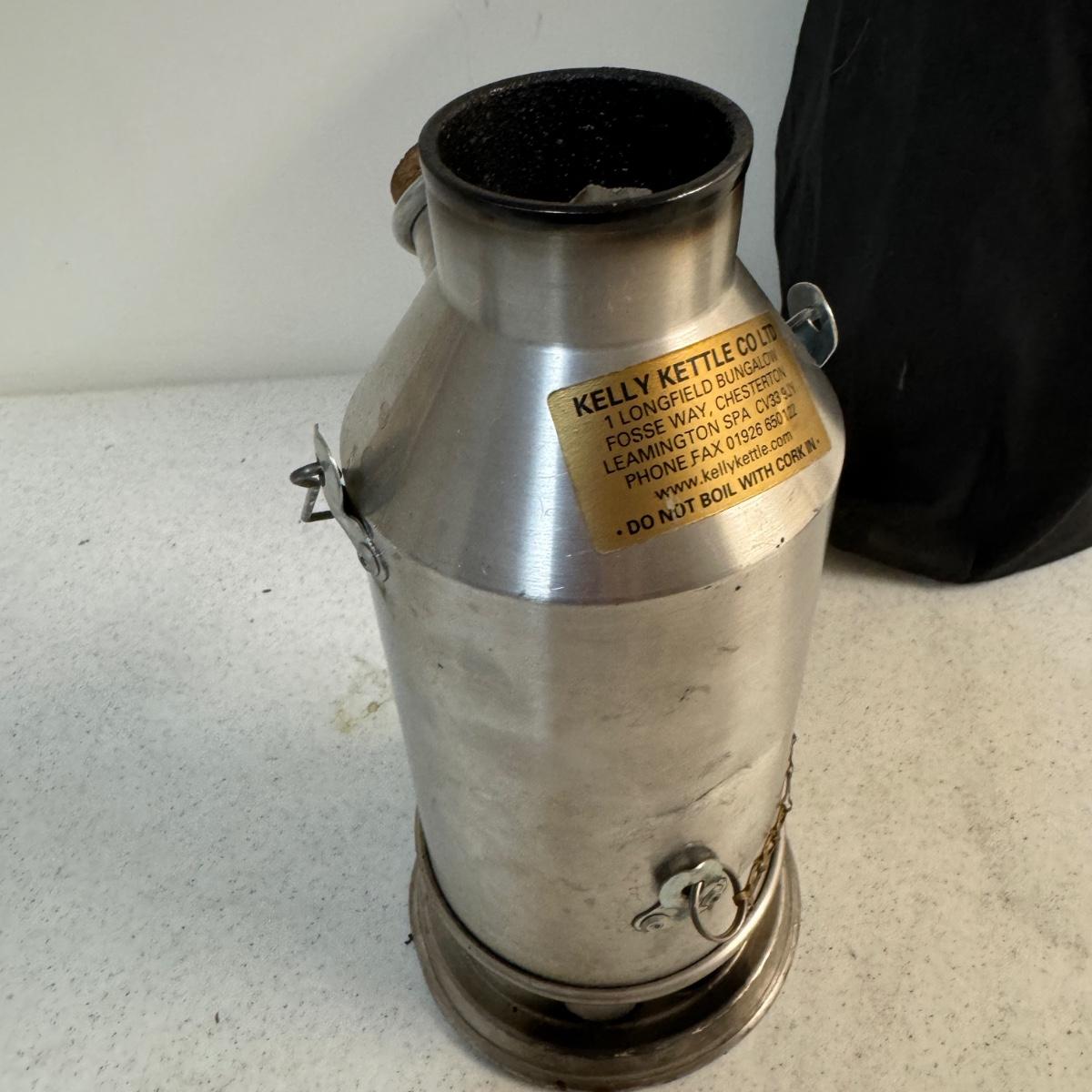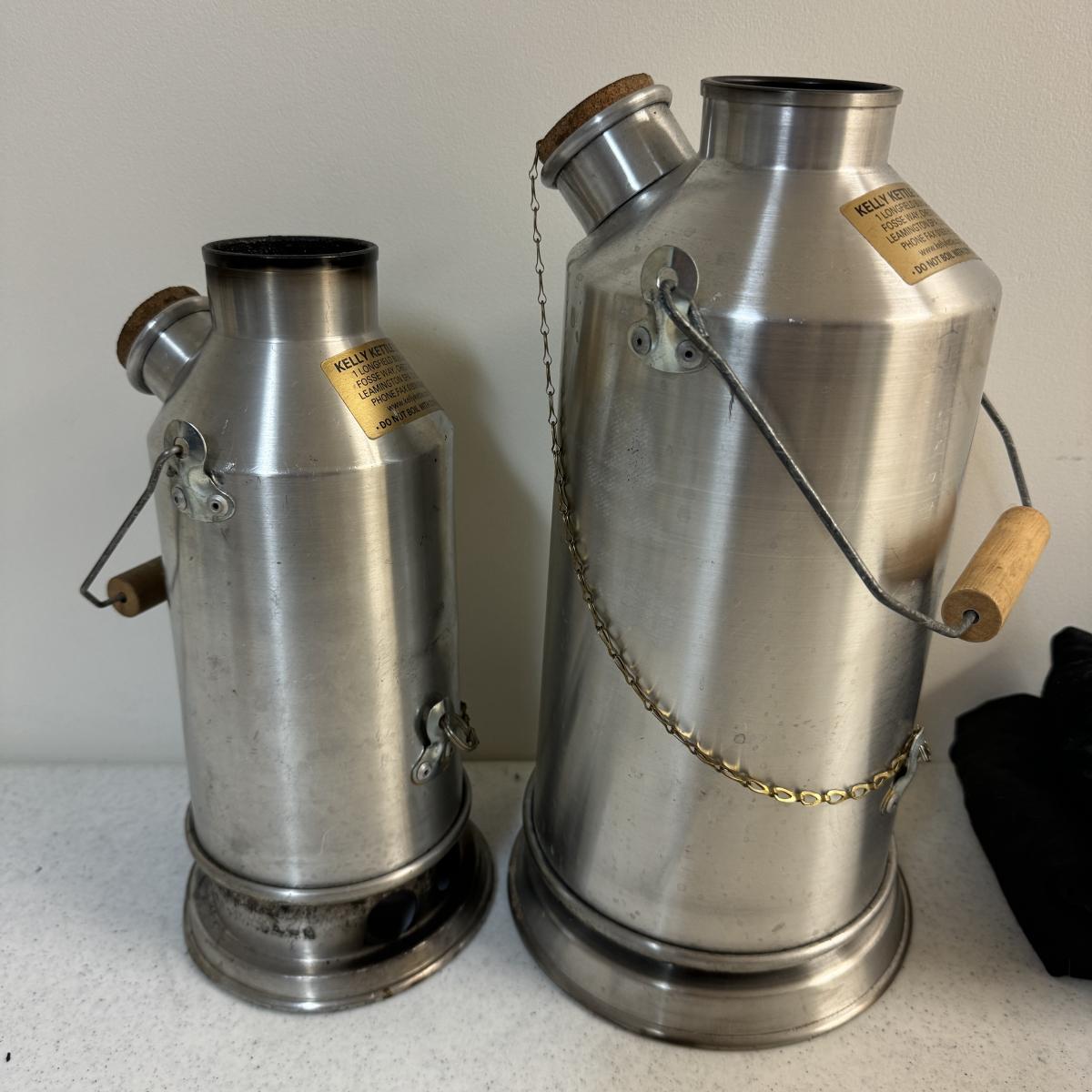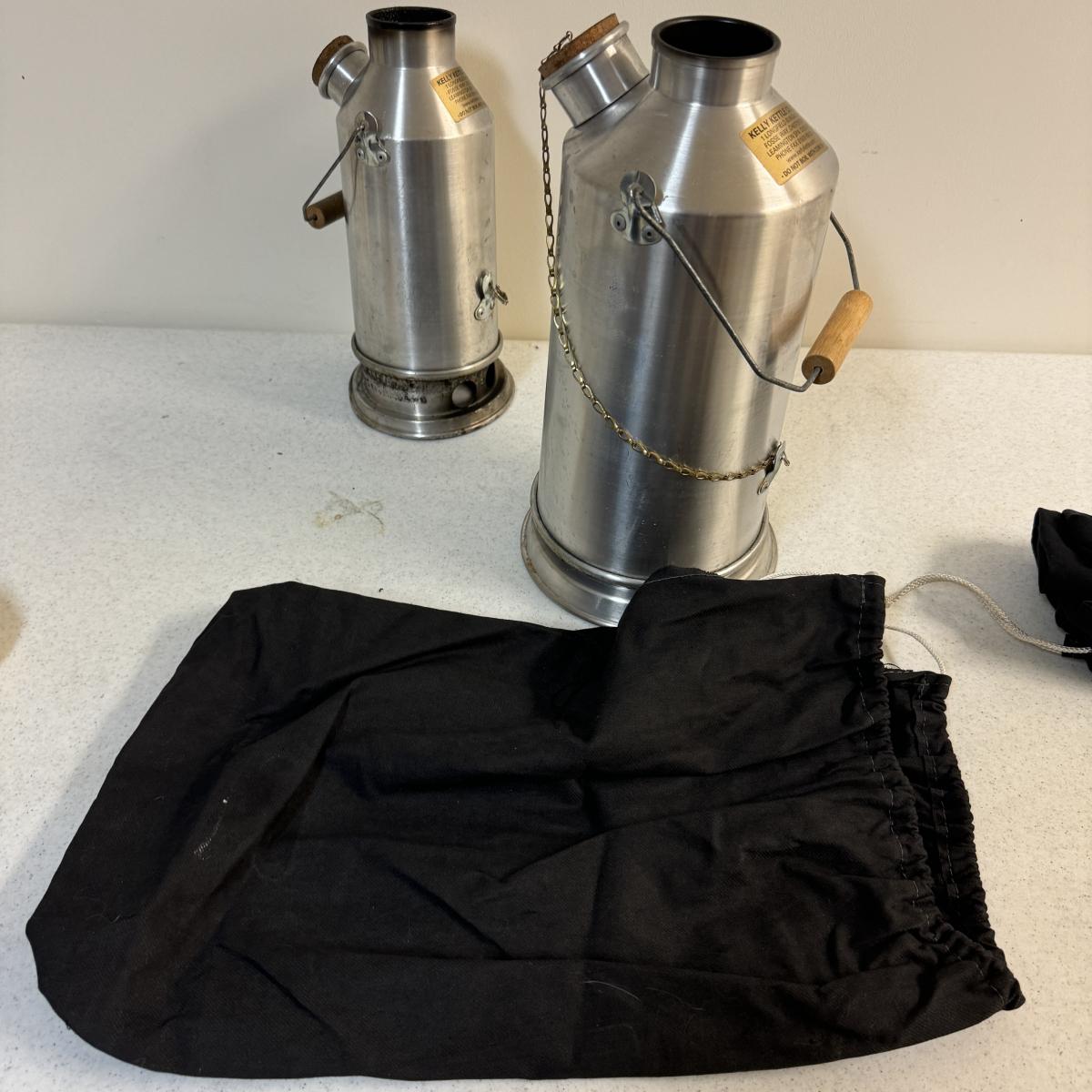 Two Kelly Kettles. Two sizes. Come with fabric storage bag (one is ripped). Both have some black soot on the bottom of them from having been used previously. One still has old newspaper to burn from previous use. Both have corks intact and handles. Local pick up only.