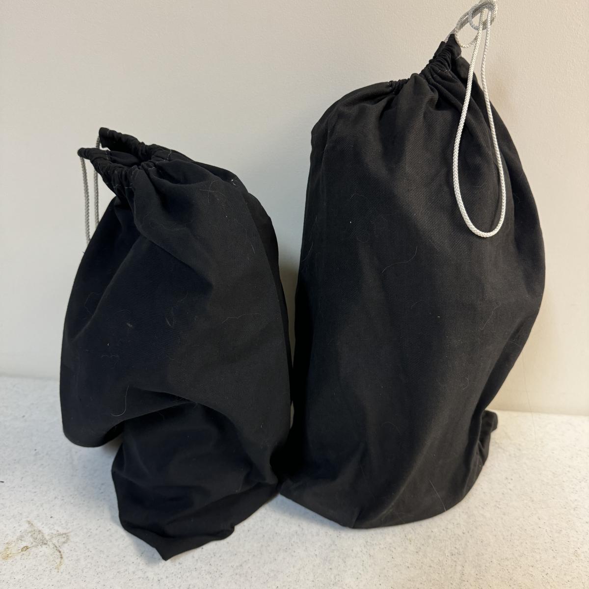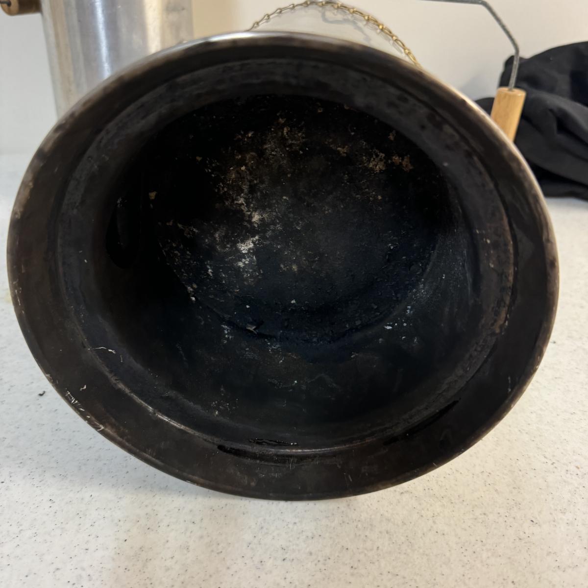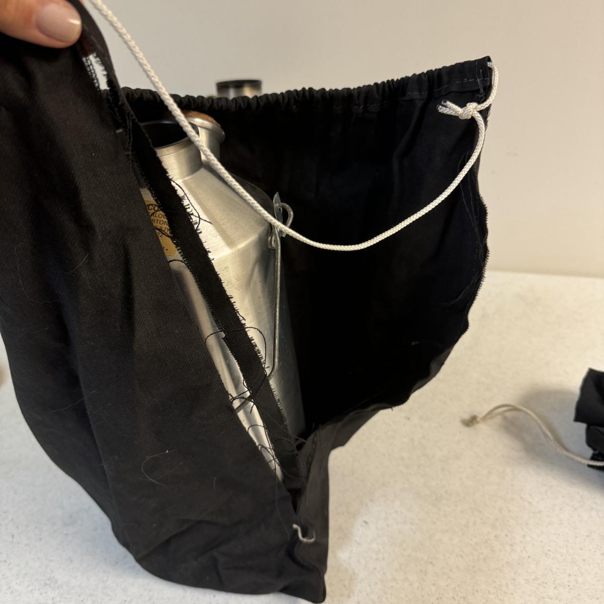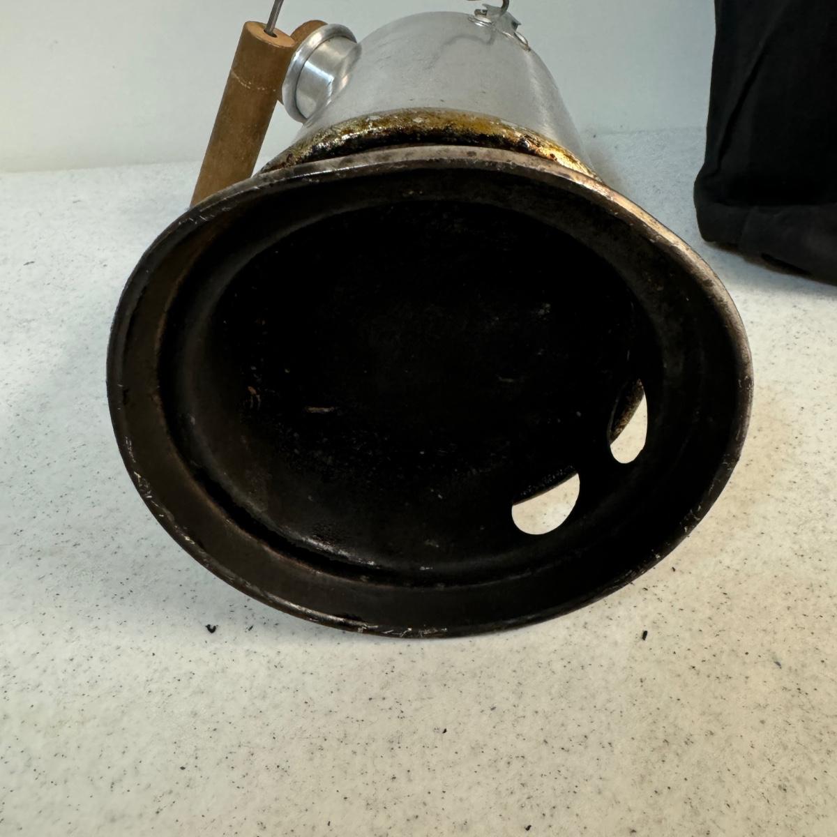 Two Kelly Kettles. Two sizes. Come with fabric storage bag (one is ripped). Both have some black soot on the bottom of them from having been used previously. One still has old newspaper to burn from previous use. Both have corks intact and handles. Local pick up only.
