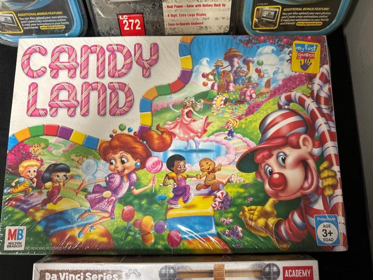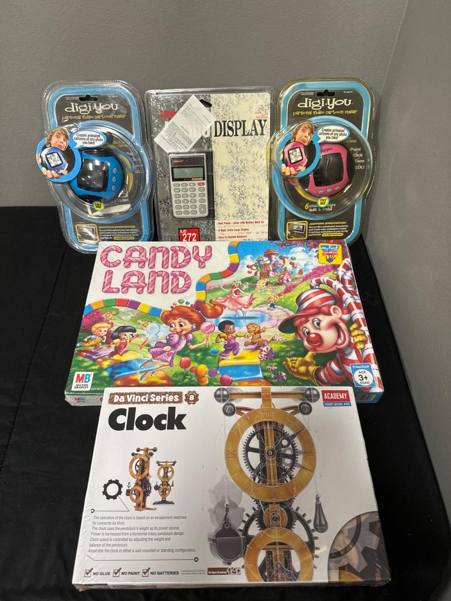 Two cartoon makers, a Calculator new Candyland game and new da Vinci series clock model