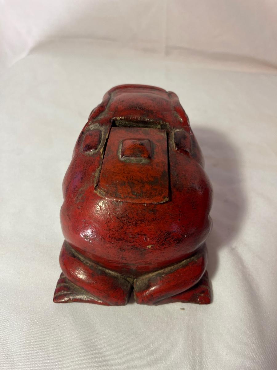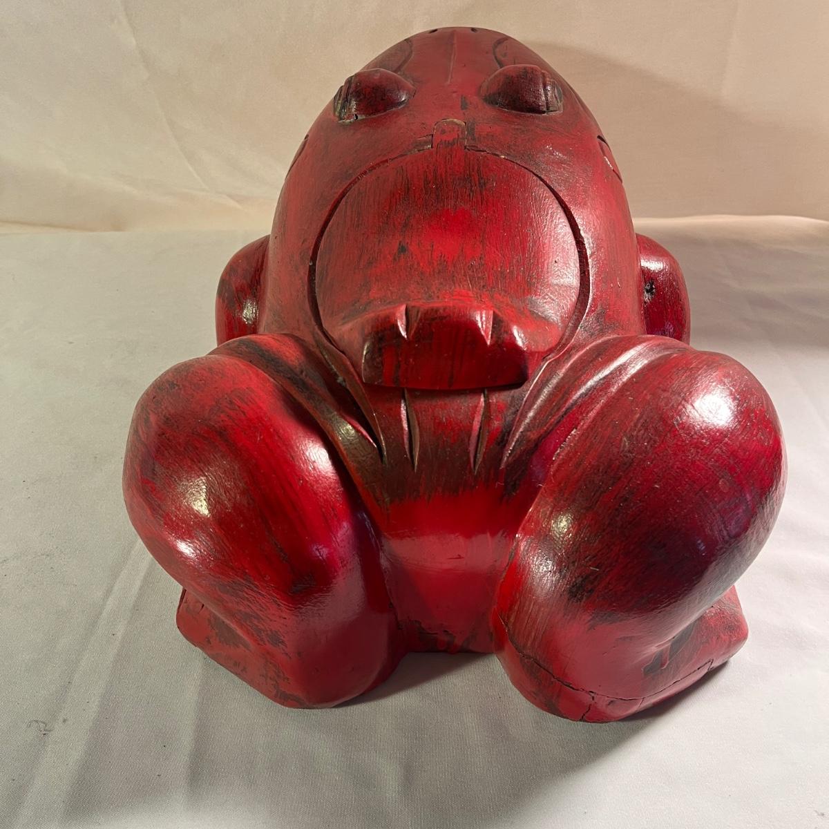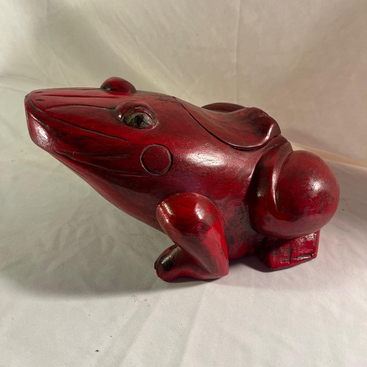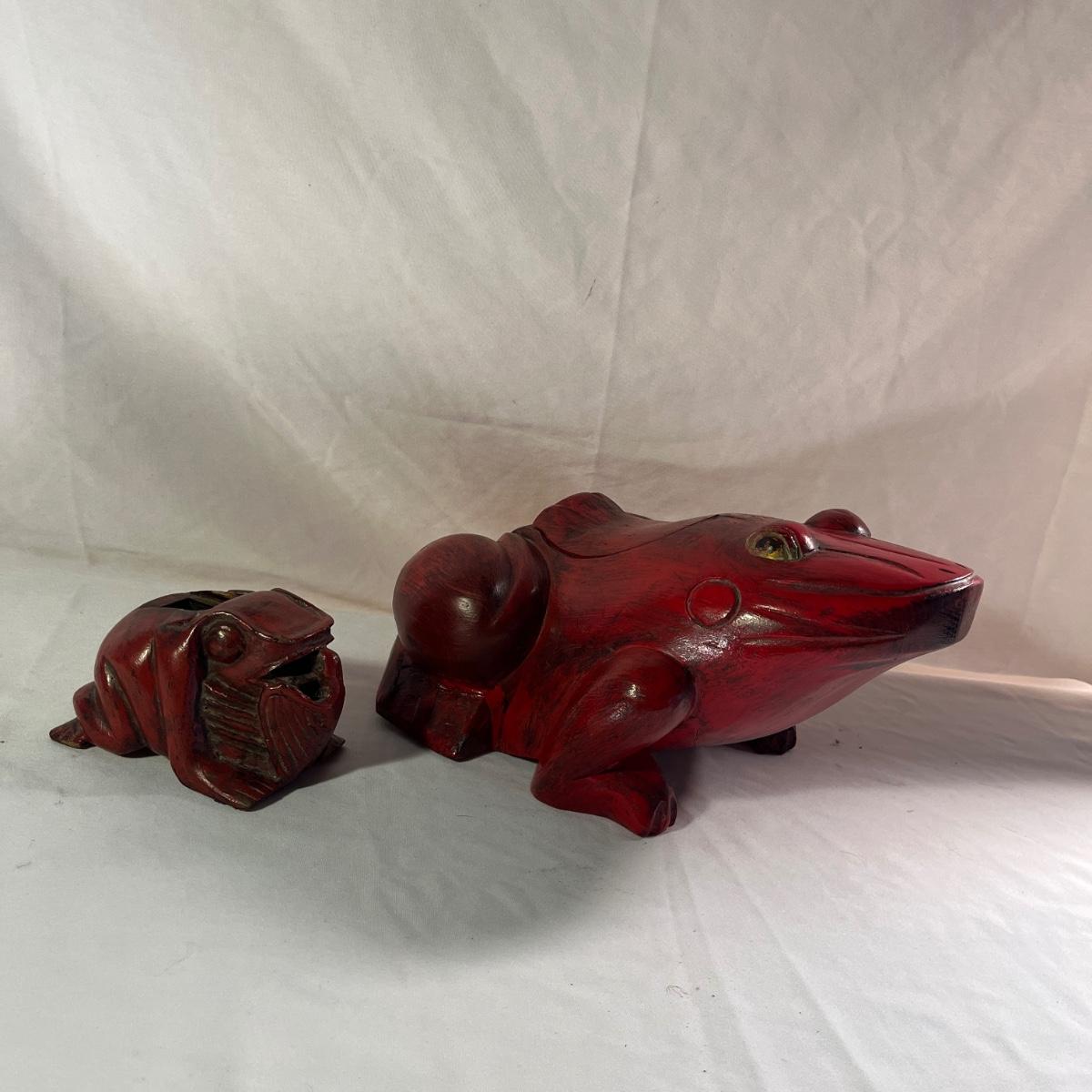 Lot includes two painted, carved wooden frogs with small storage wells in their backs. The largest frog measures 15.5” x 11” x 7”H.