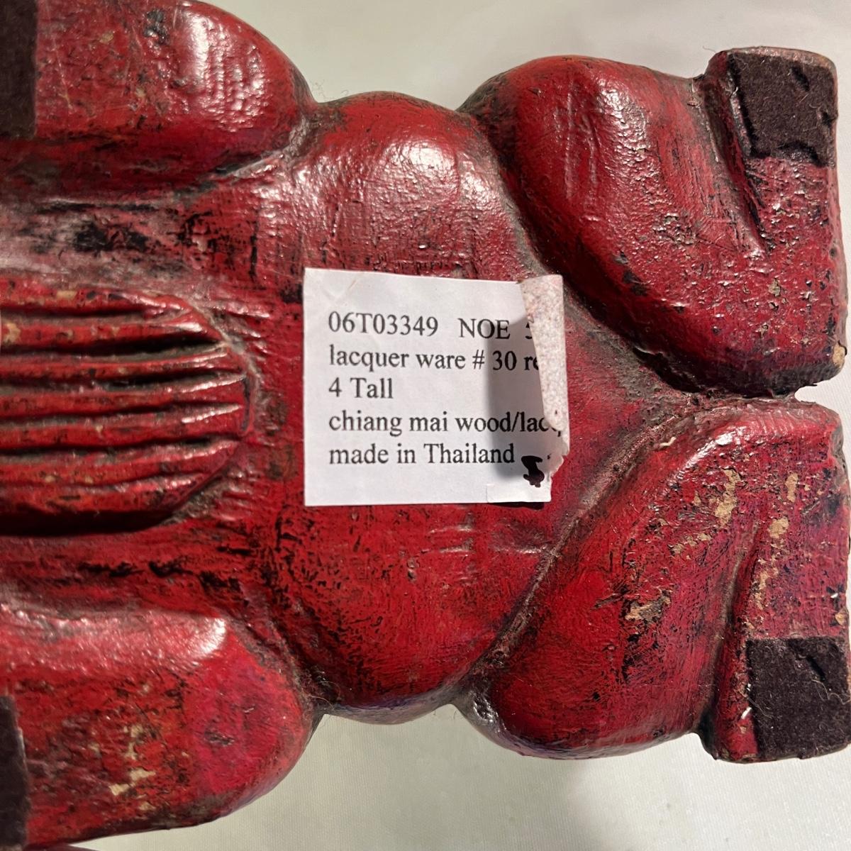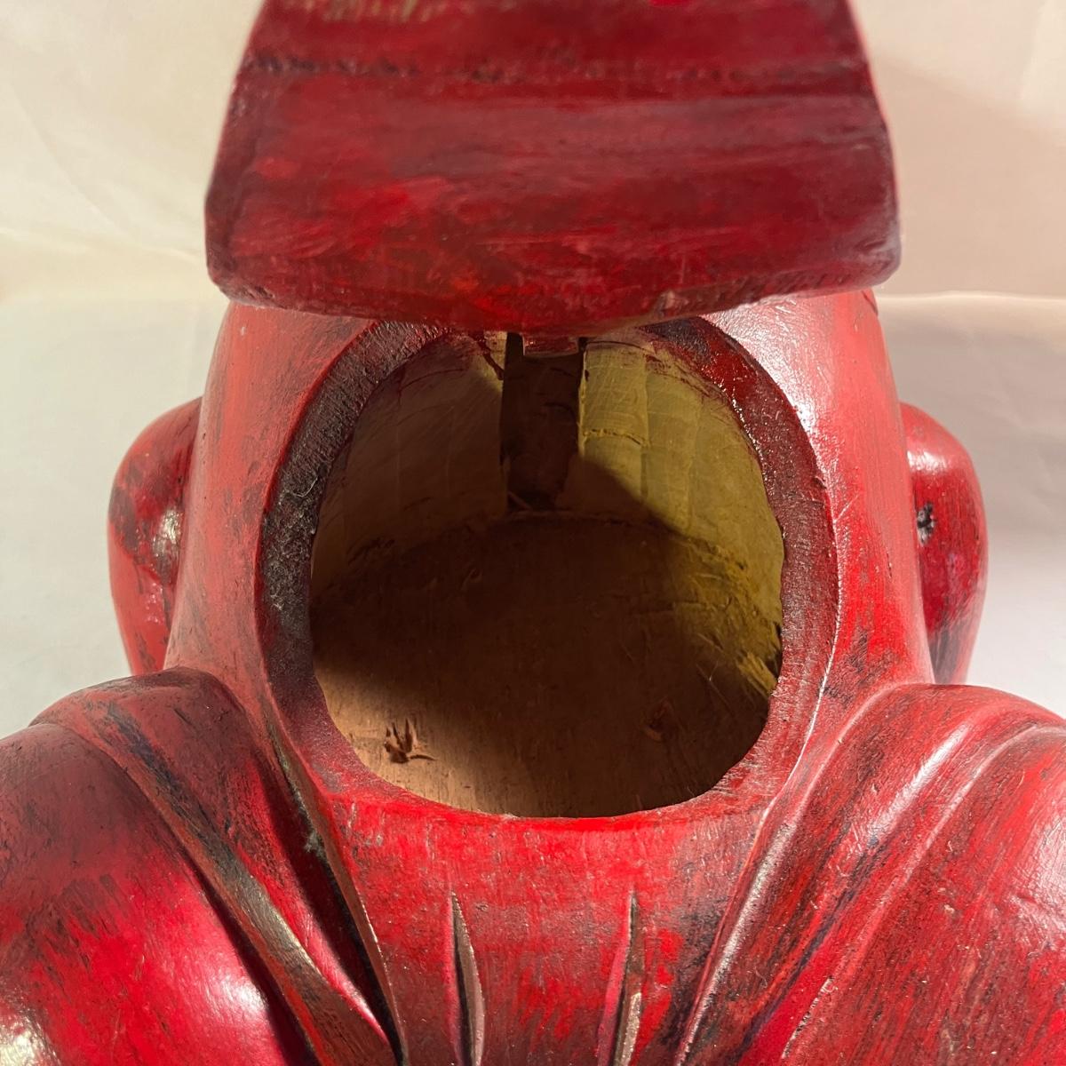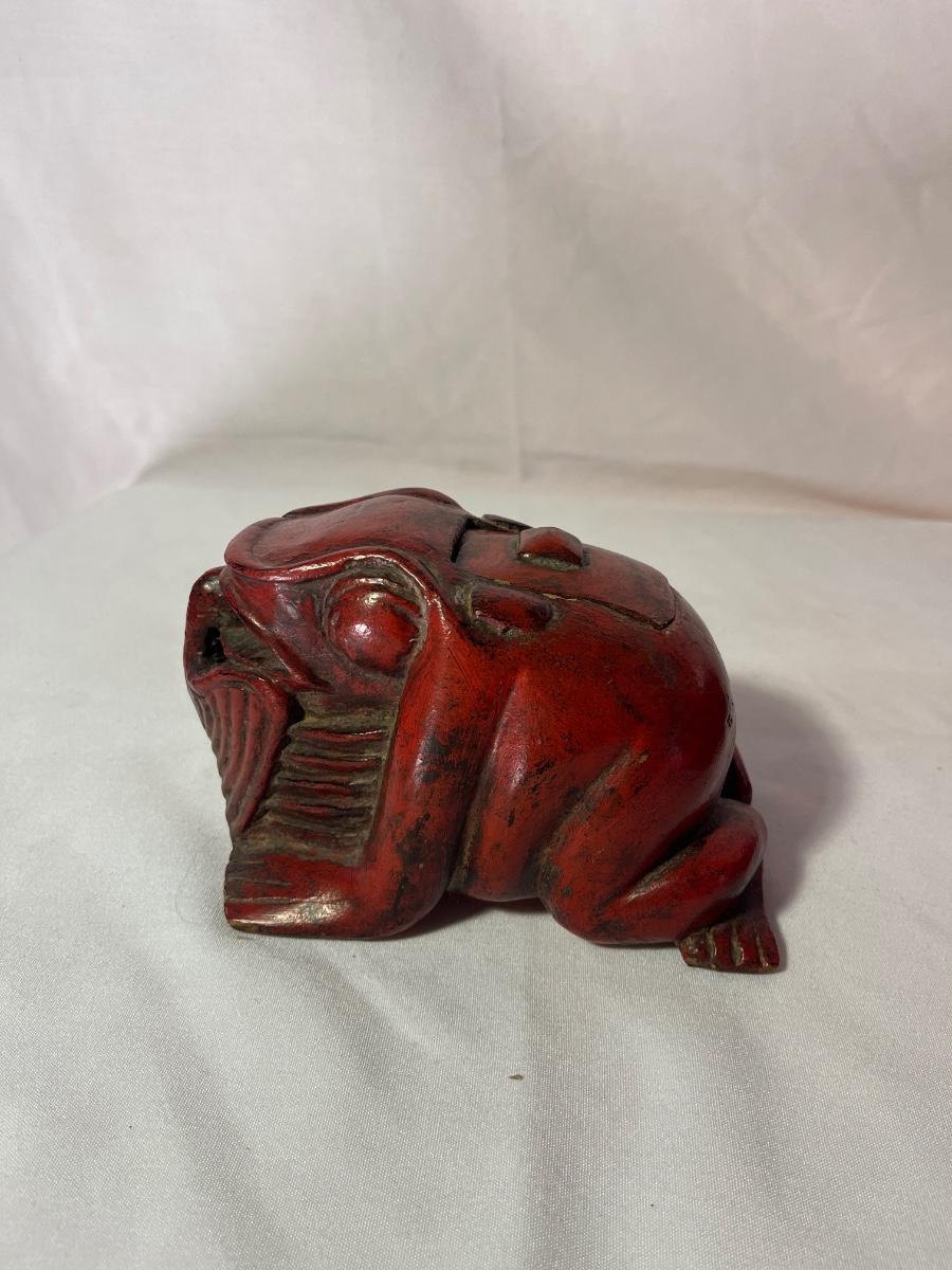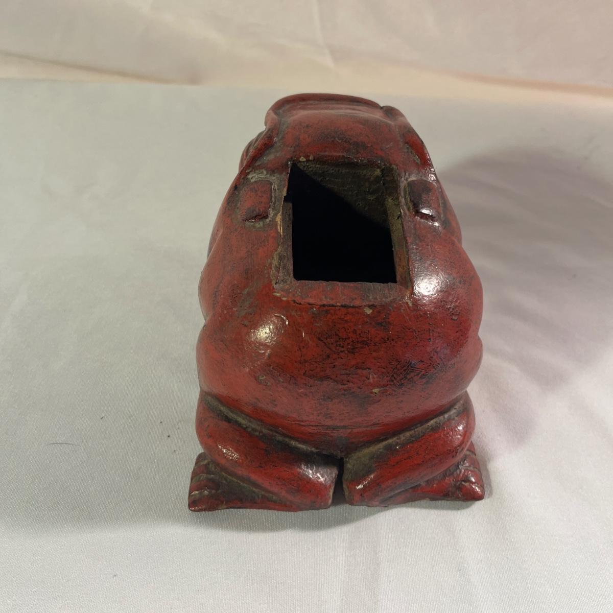 Lot includes two painted, carved wooden frogs with small storage wells in their backs. The largest frog measures 15.5” x 11” x 7”H.