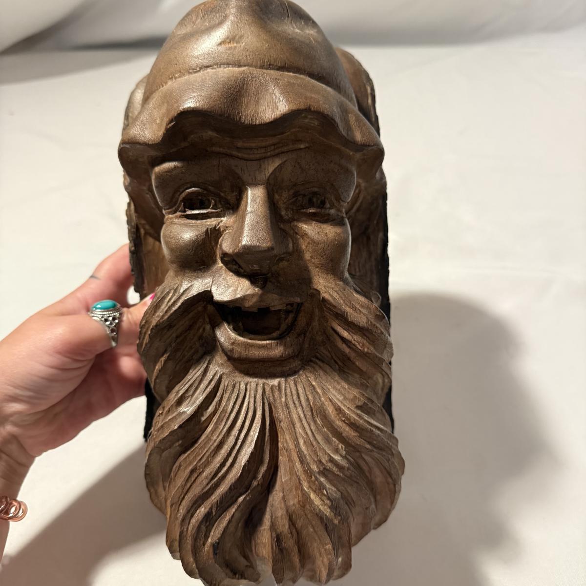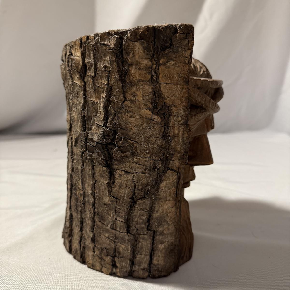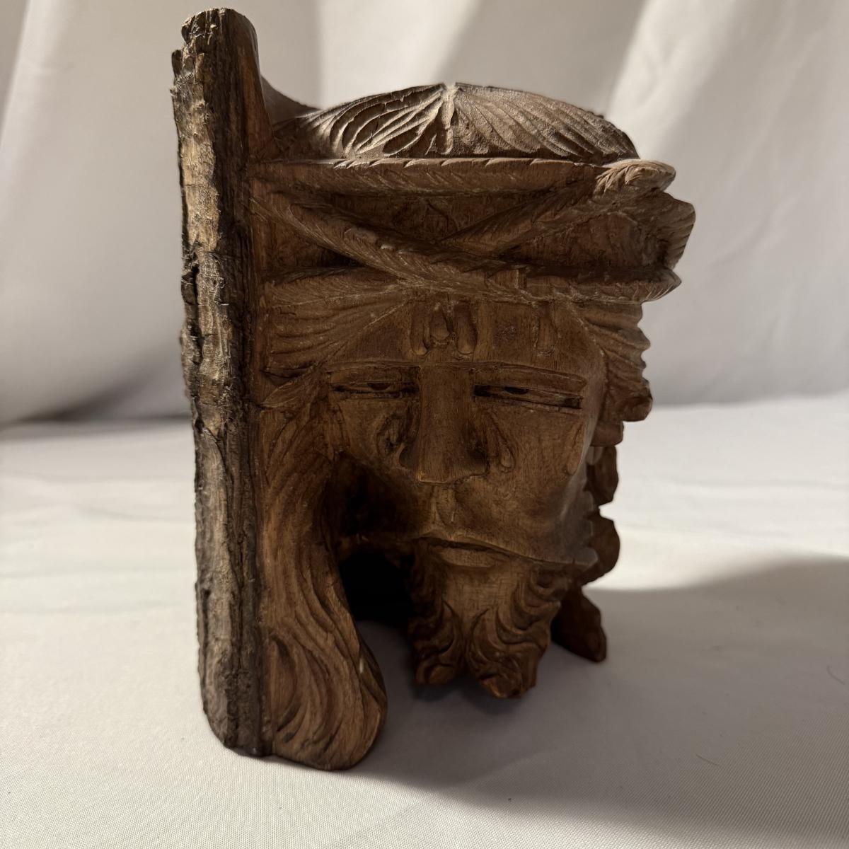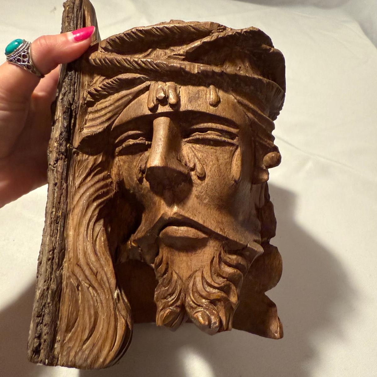 This lot contains what appears to be an emotional depiction of Jesus carved into wood as well as a happier wood face carving. The piece akin to Jesus measures 6.5” x 6.5” x 8.25”H. The taller piece measures 5” x 5” x 10”H