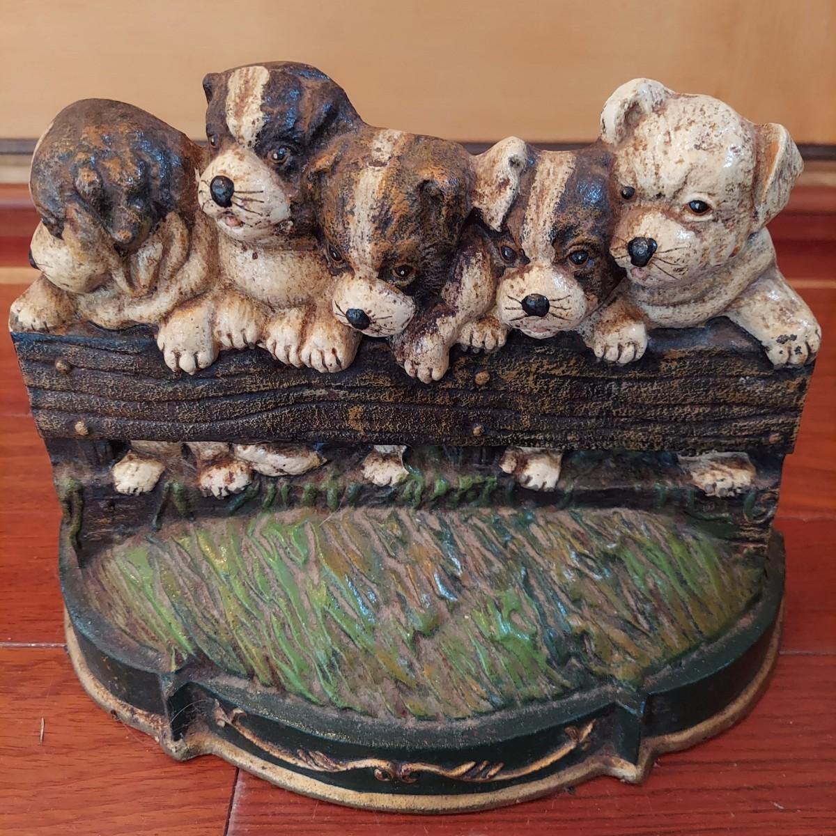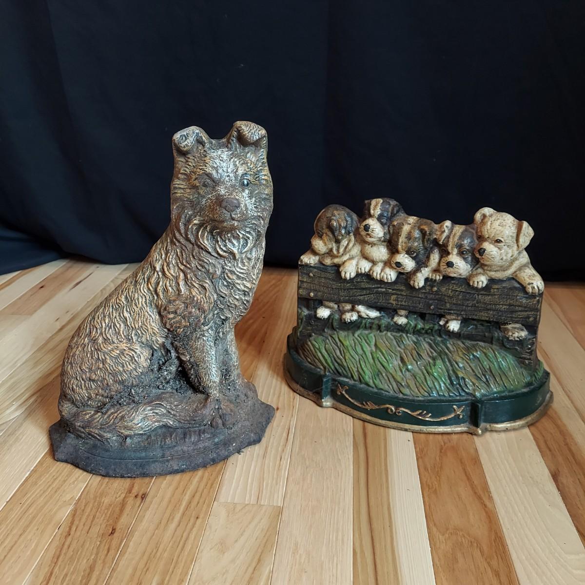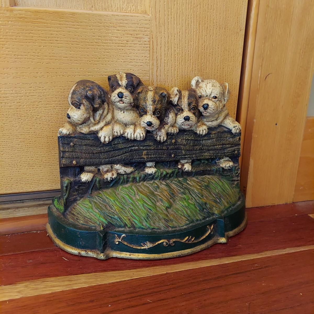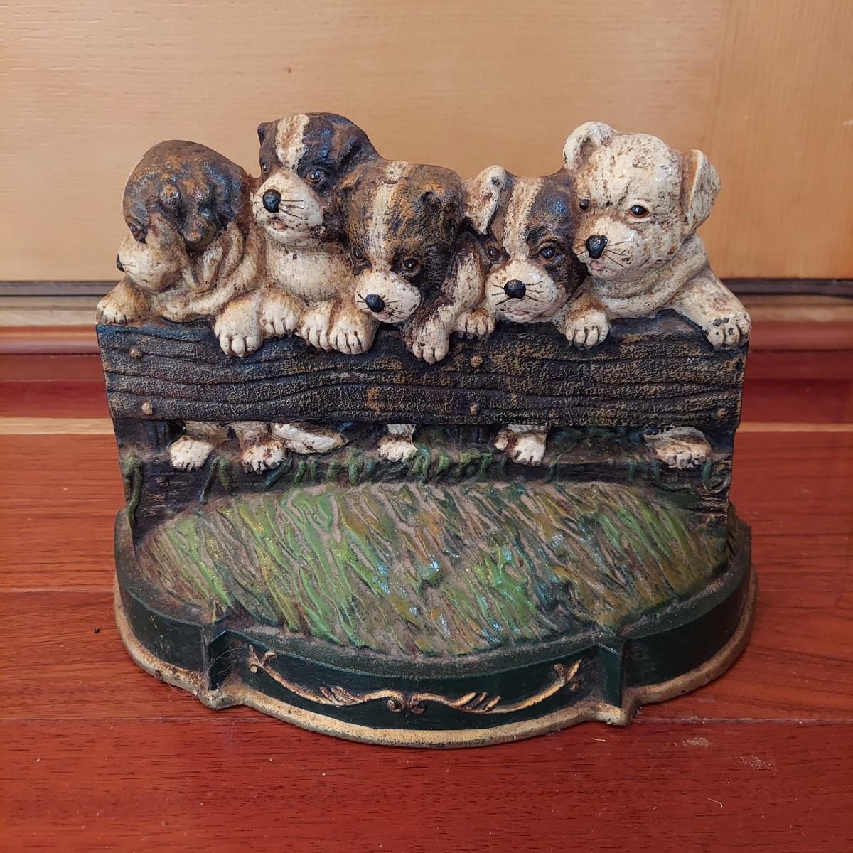 Two cast iron door stops. One is a single dog that measures approximately 9 x 3.5 x 12"H. The other is a group of puppies that is approximately 12 x 3.5 x 8"H. They need cleaned up some. Shipping available. Shipping certain items can be costly. We suggest contacting our preferred local shipping provider, Postage Express, with dimensions and getting an estimate before bidding: (828) 670-5501 or postageexpress@yahoo.com.