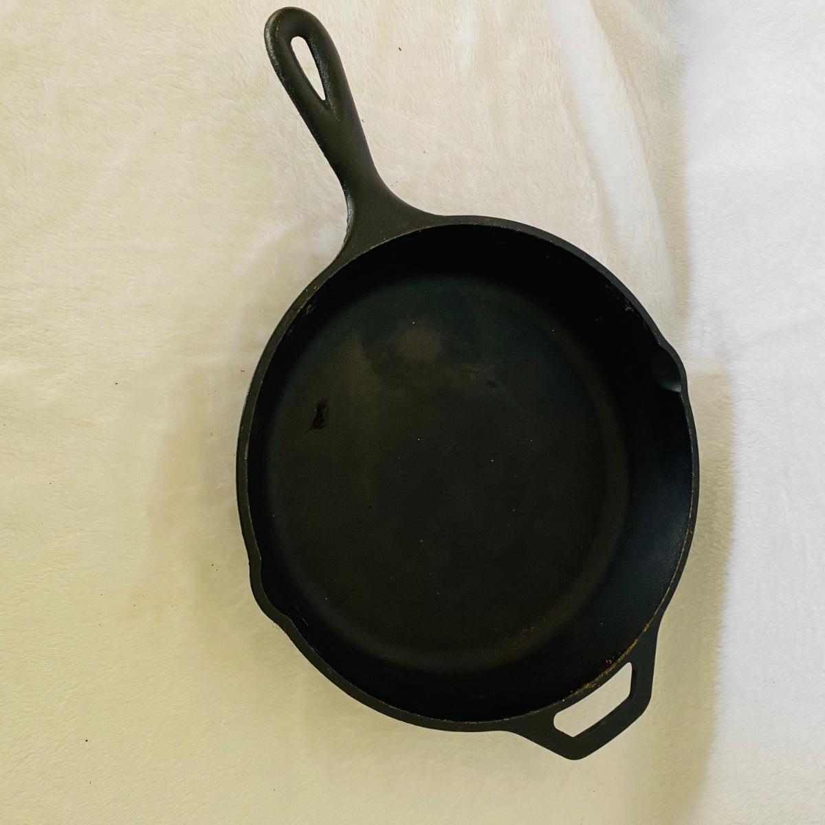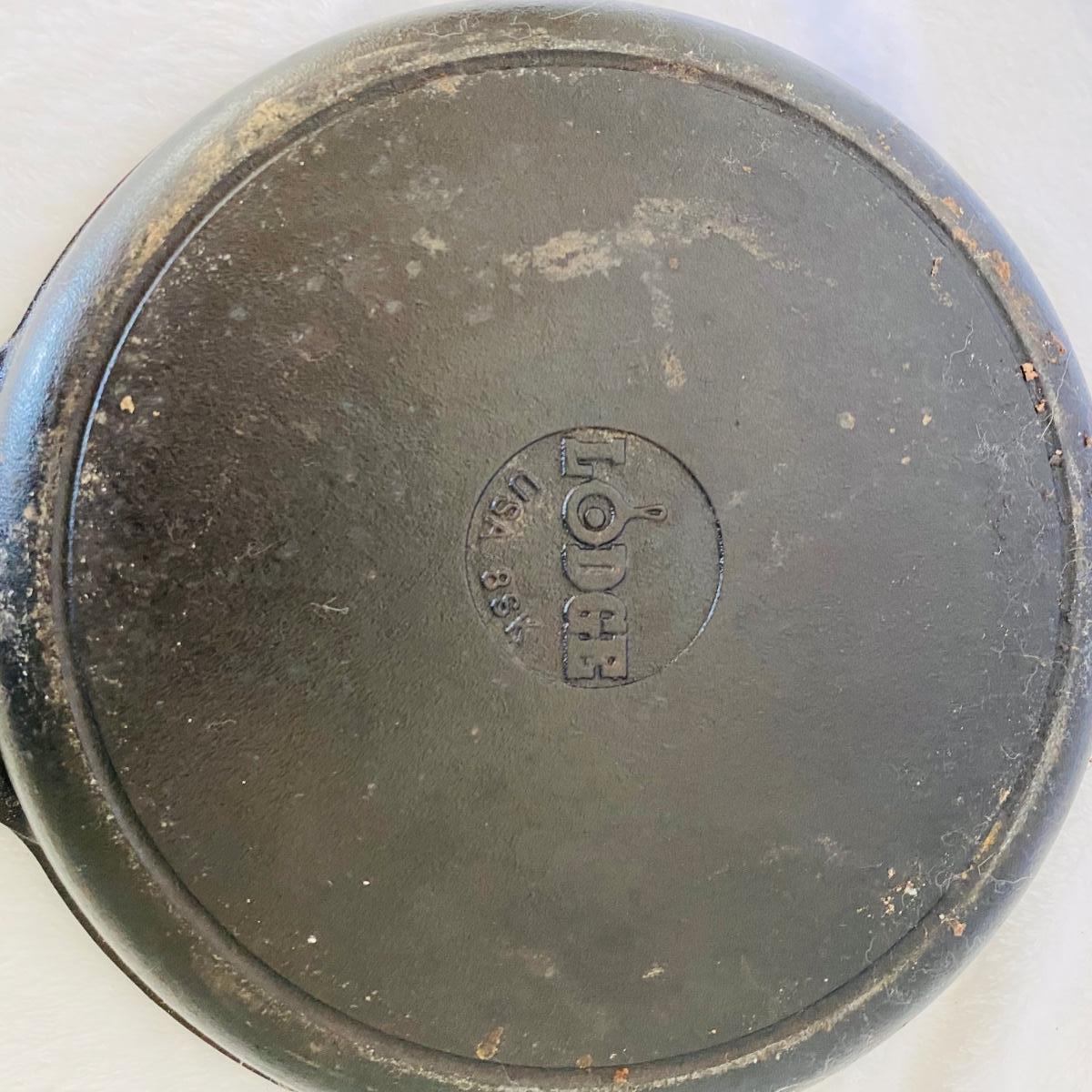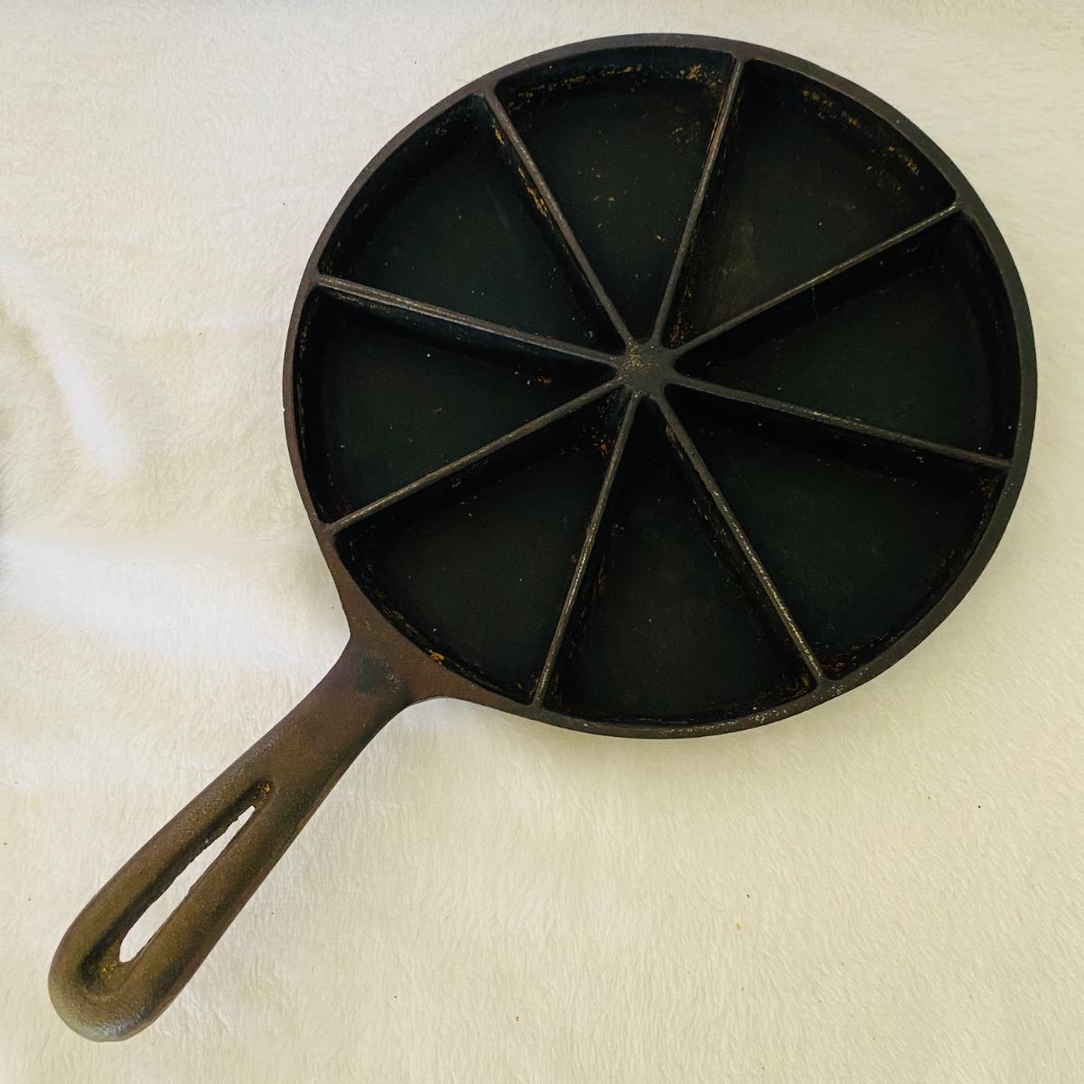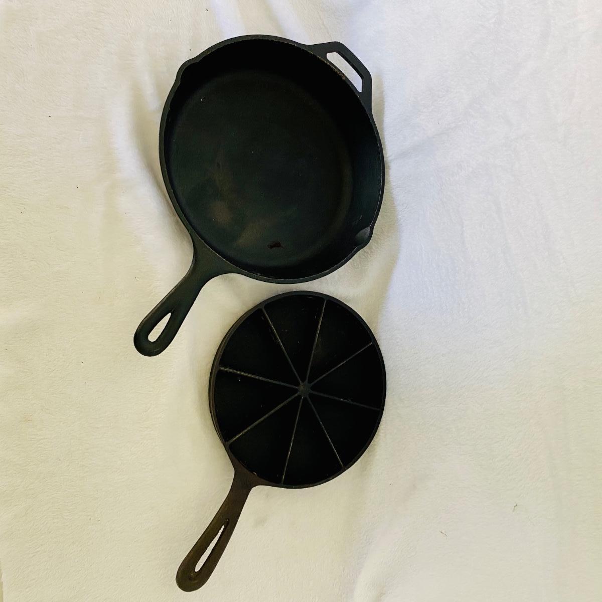 Two cast iron skillets. Larger Lodge skillet is 10”D and smaller corn bread skillet is 8.5”D. Good condition.