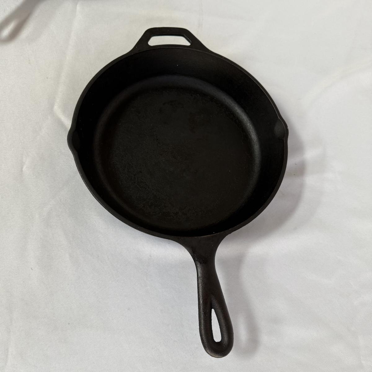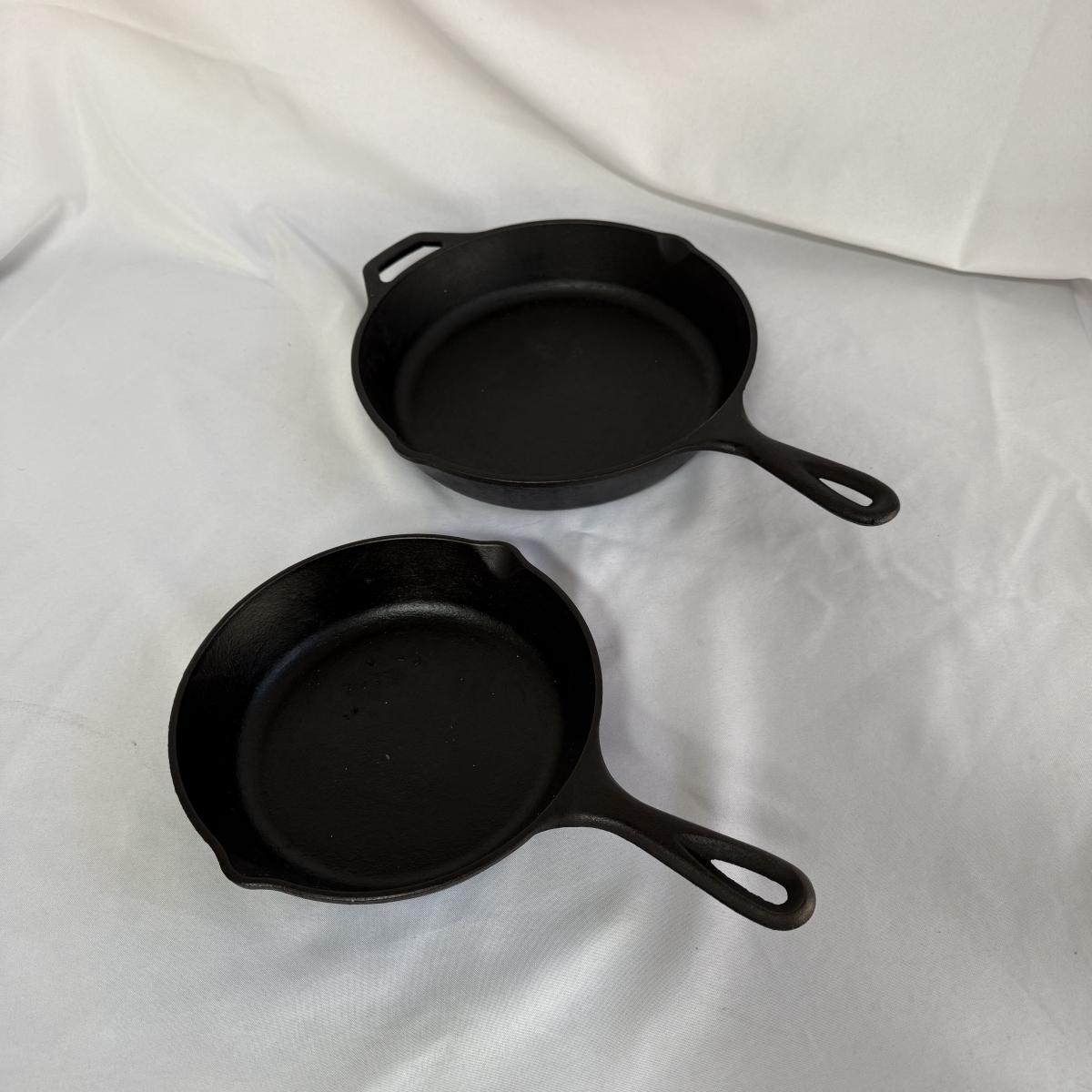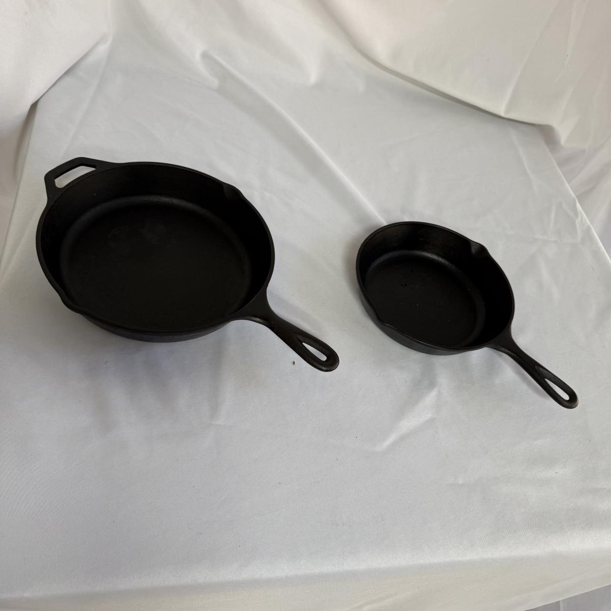 This lot contains two Lodge cast iron skillets. The larger one has a handle on one side and closed loop handle on the other side. This larger one measures 10.5”D and a 2”H. The smaller one has a single handle and measures 8”D with a 2”H. Both are stamped with ‘Lodge’ on the bottom.