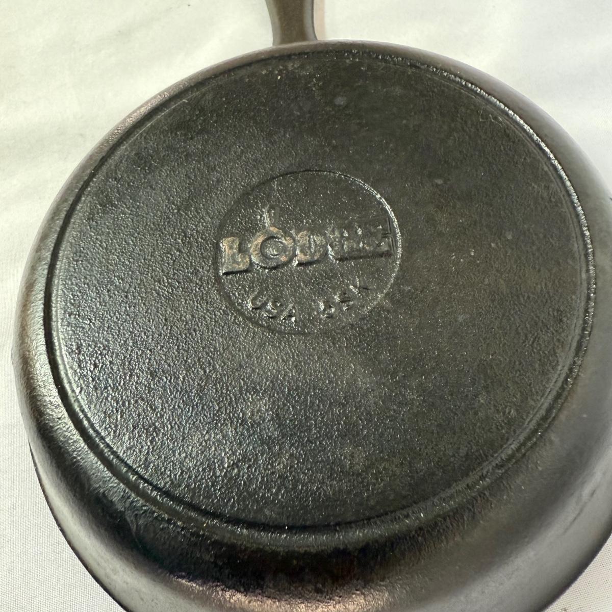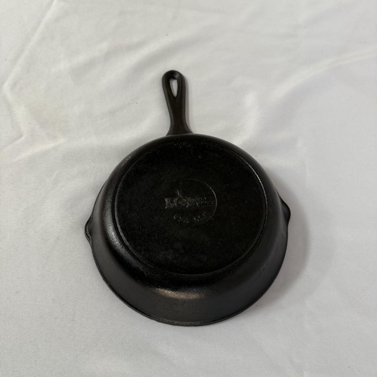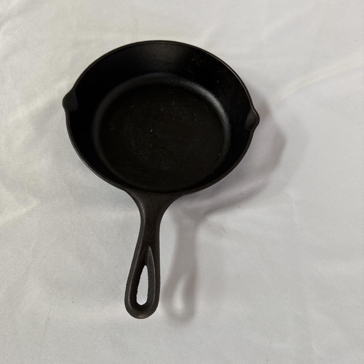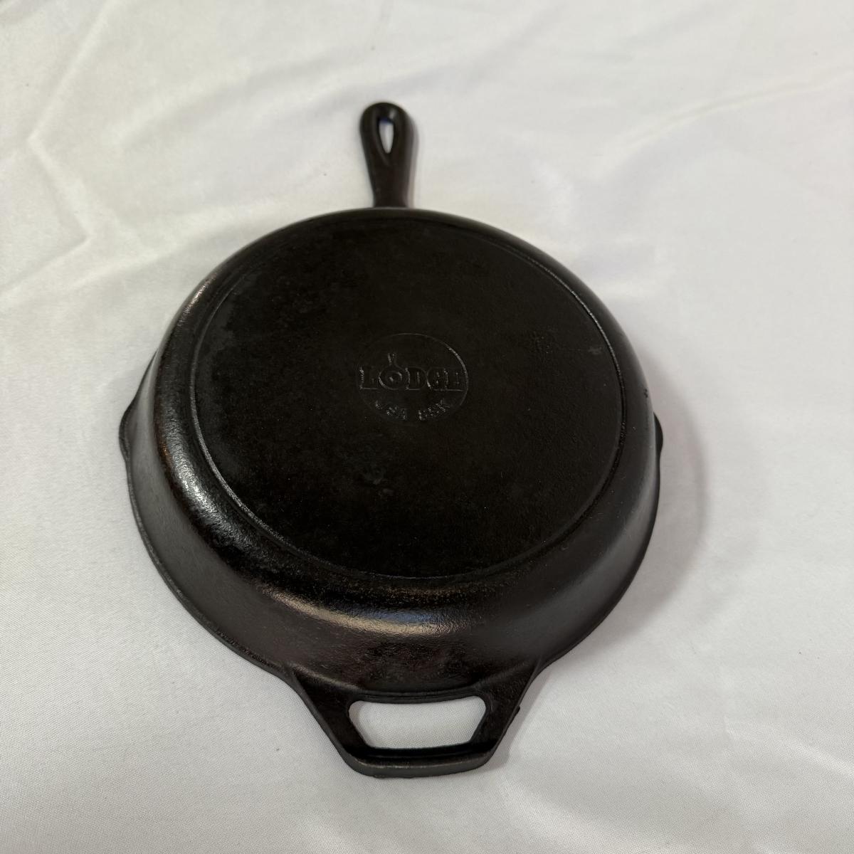 This lot contains two Lodge cast iron skillets. The larger one has a handle on one side and closed loop handle on the other side. This larger one measures 10.5”D and a 2”H. The smaller one has a single handle and measures 8”D with a 2”H. Both are stamped with ‘Lodge’ on the bottom.