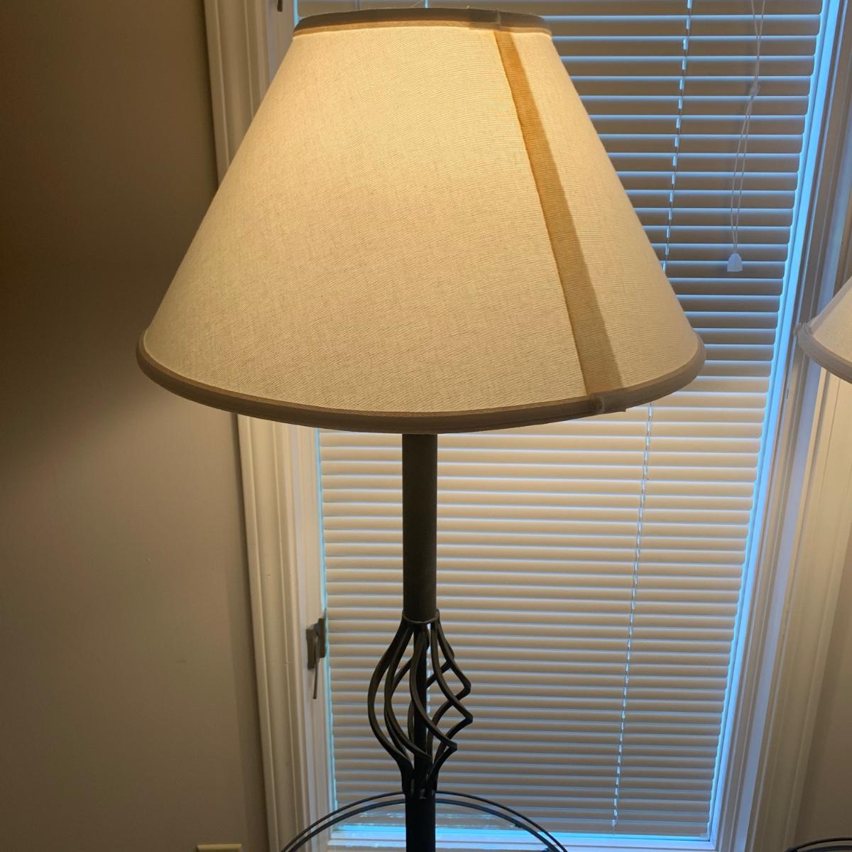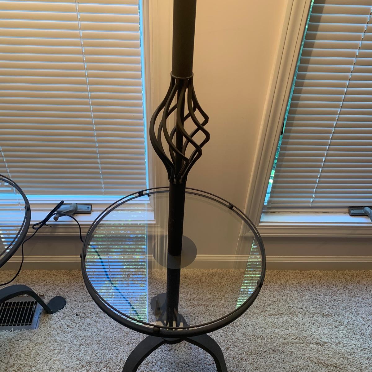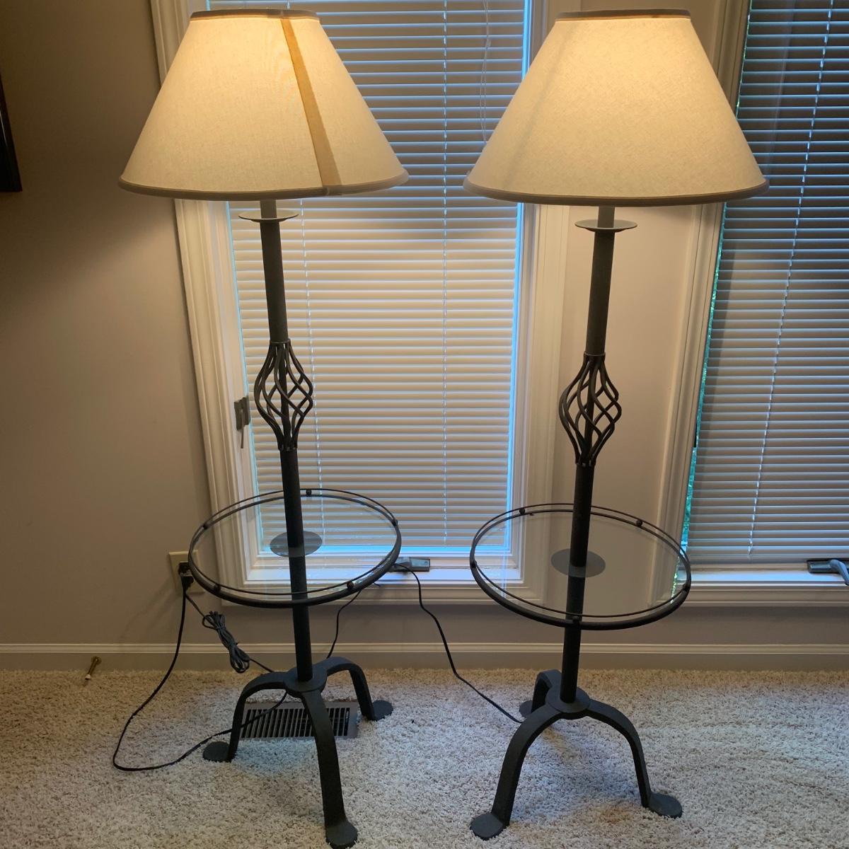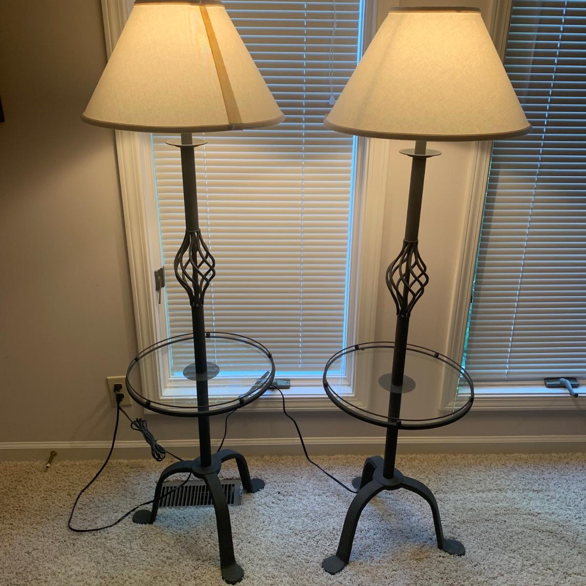 Two cast-iron style floor lamps. Each table features 3 way switch system and glass table. Lamps measure approximately, 17.5” x 16” 60”H. Lamp shades have a small amount of fraying but are otherwise intact. See photos for more details.