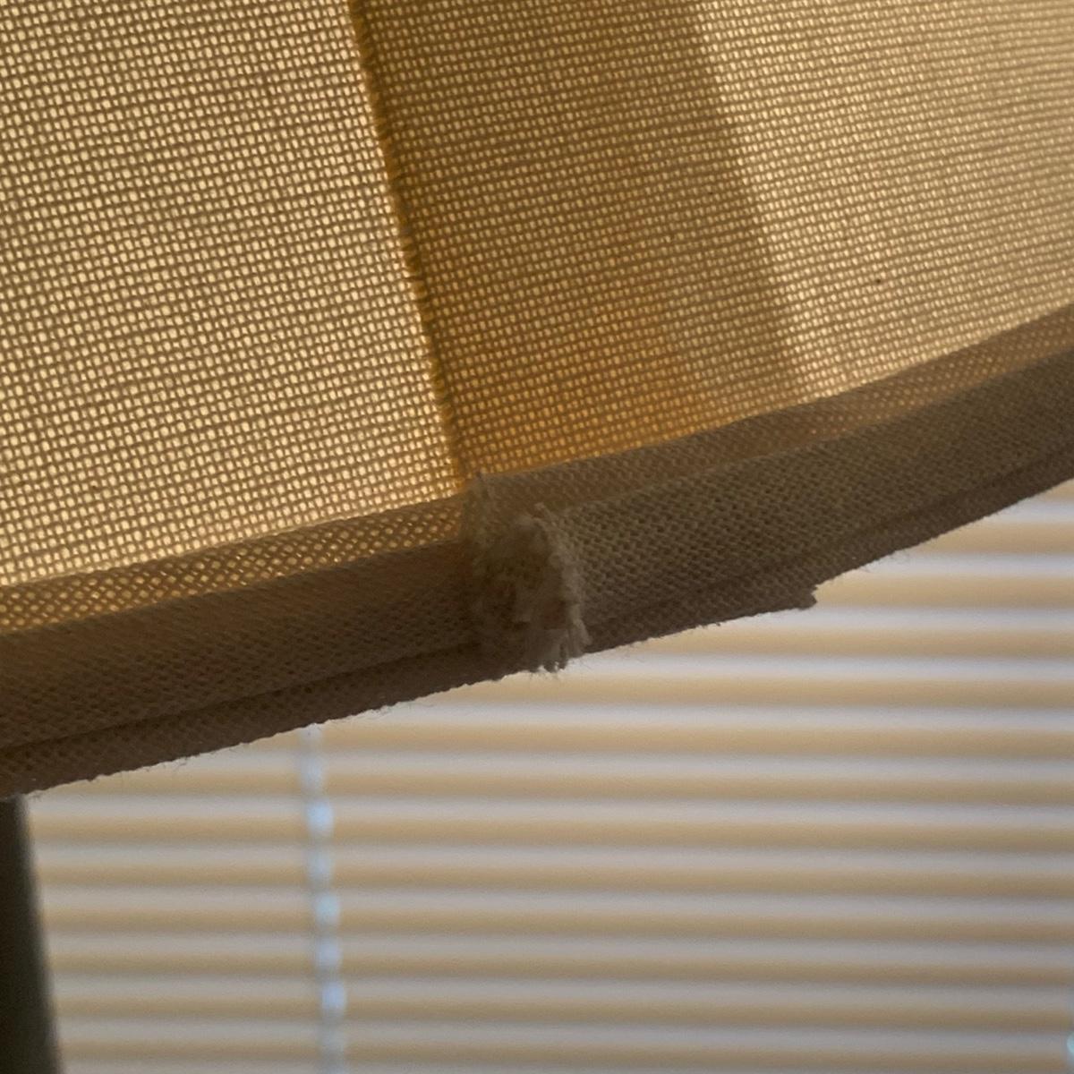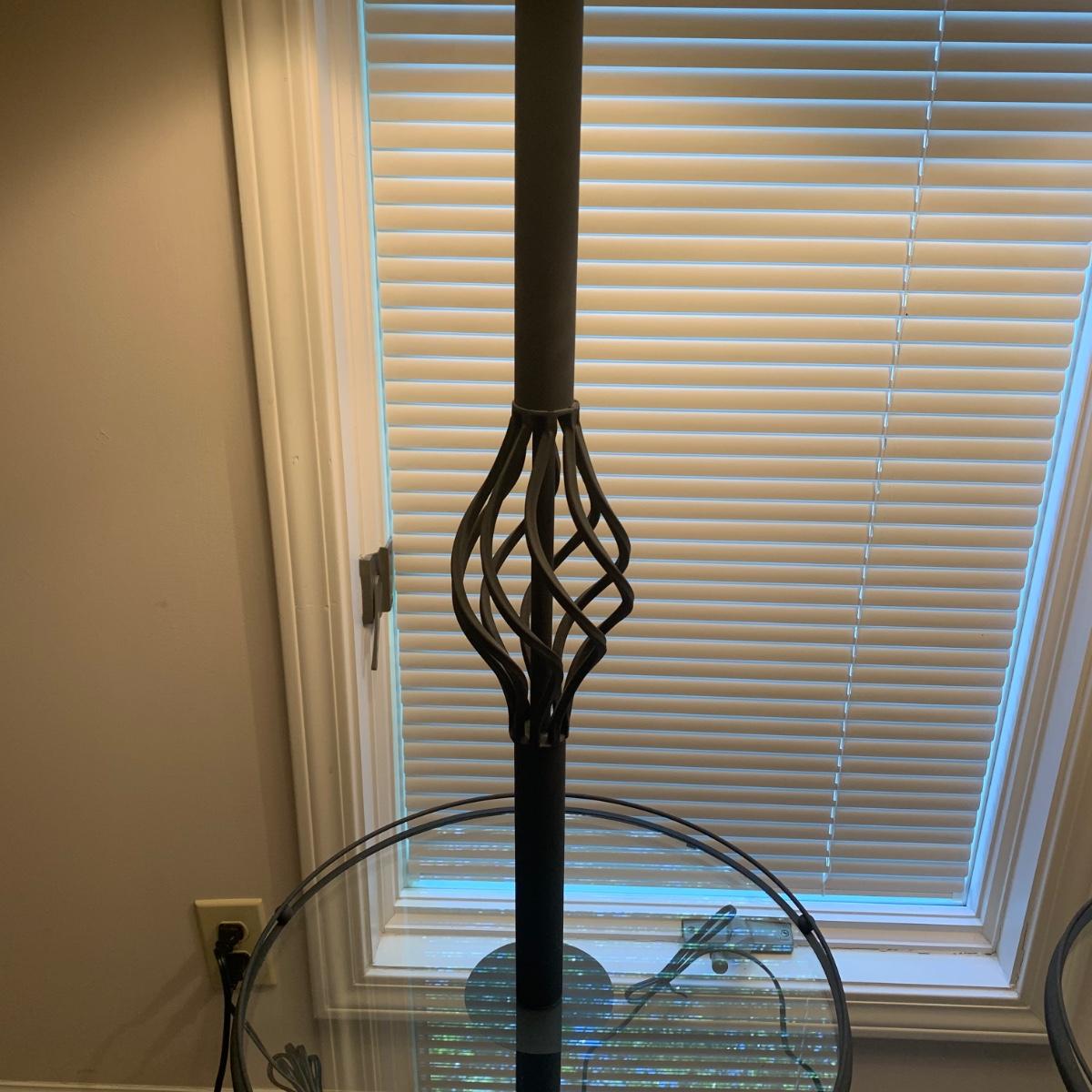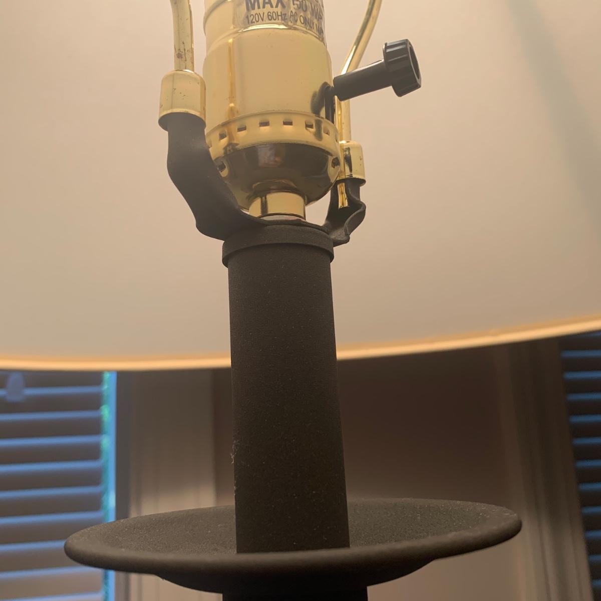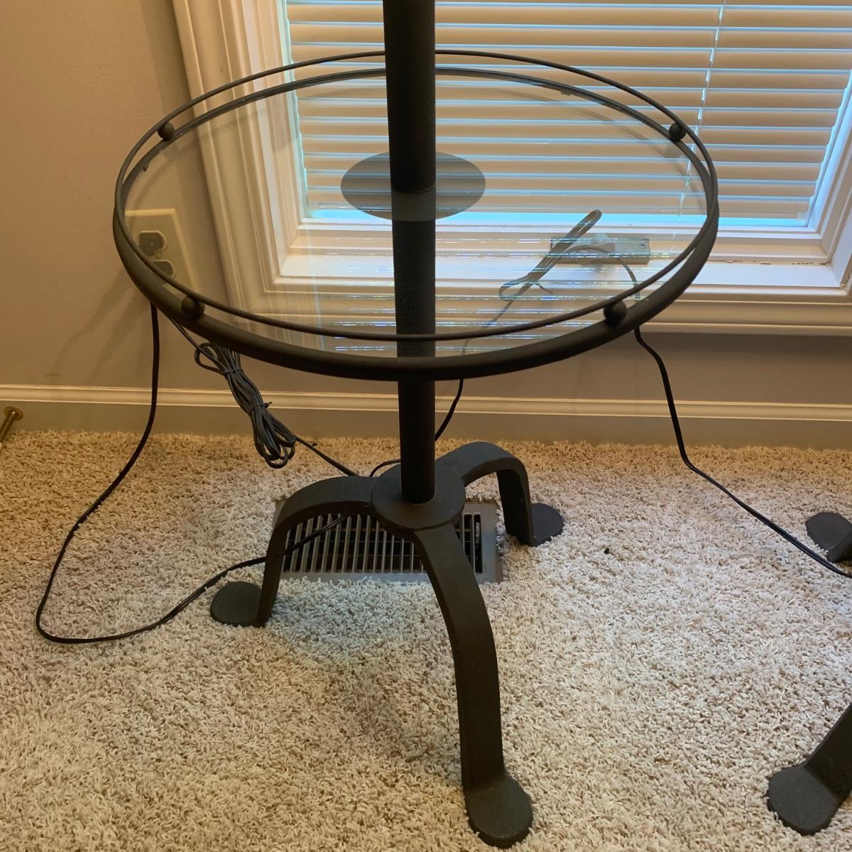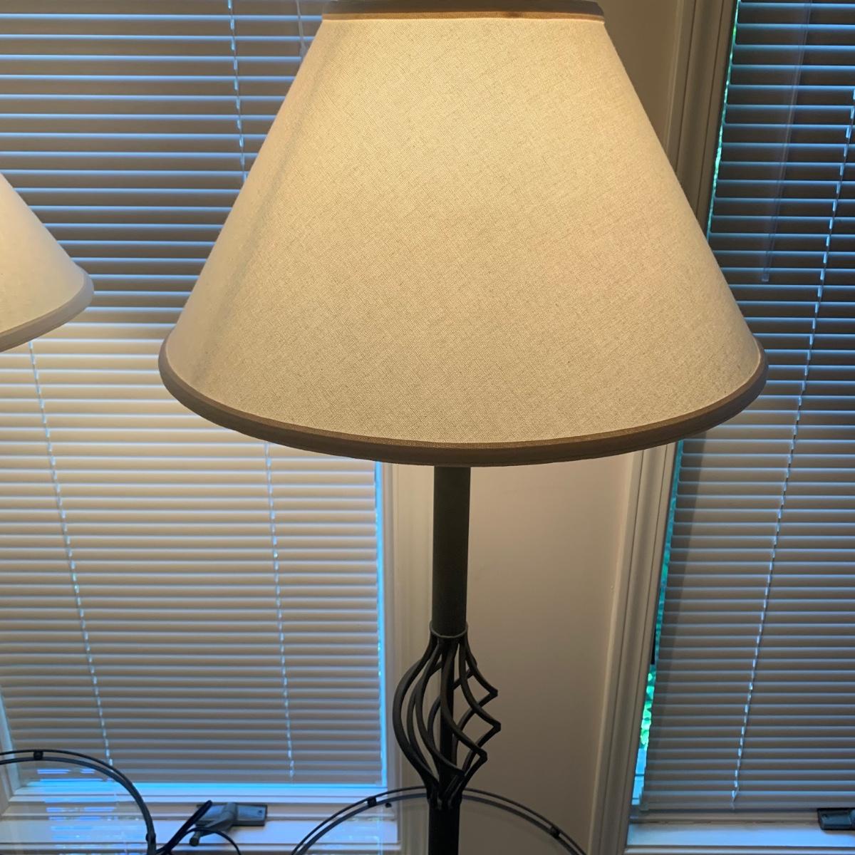 Two cast-iron style floor lamps. Each table features 3 way switch system and glass table. Lamps measure approximately, 17.5” x 16” 60”H. Lamp shades have a small amount of fraying but are otherwise intact. See photos for more details.