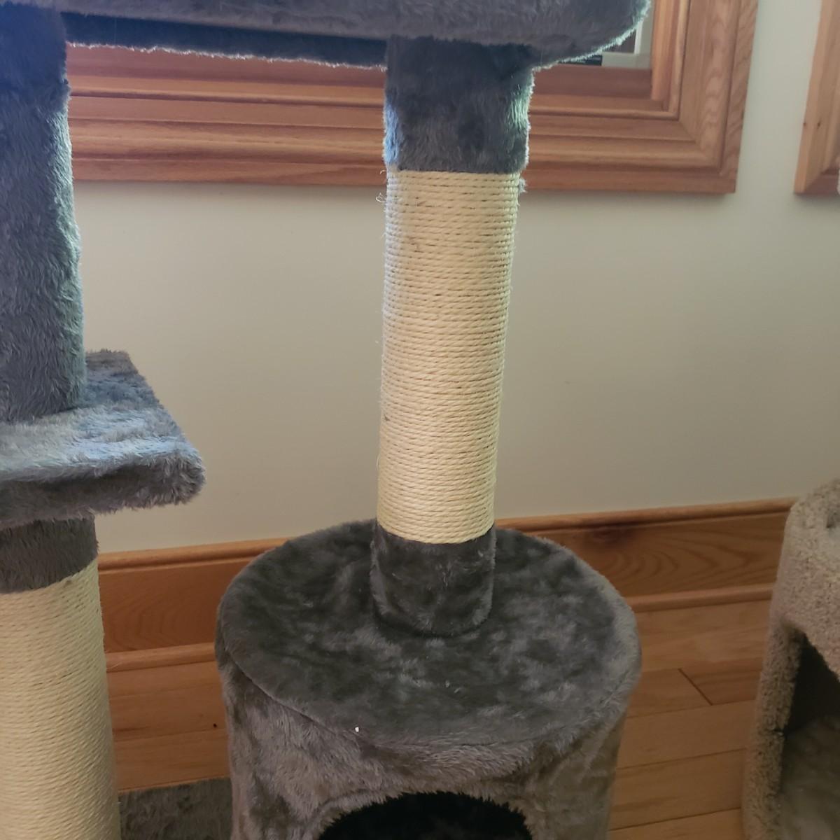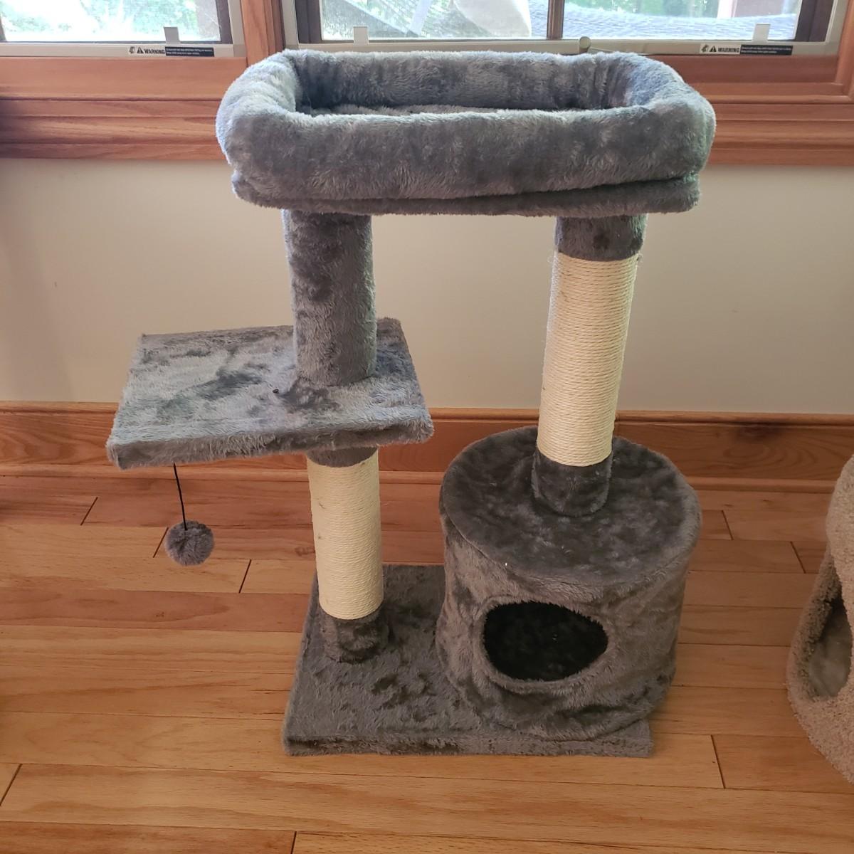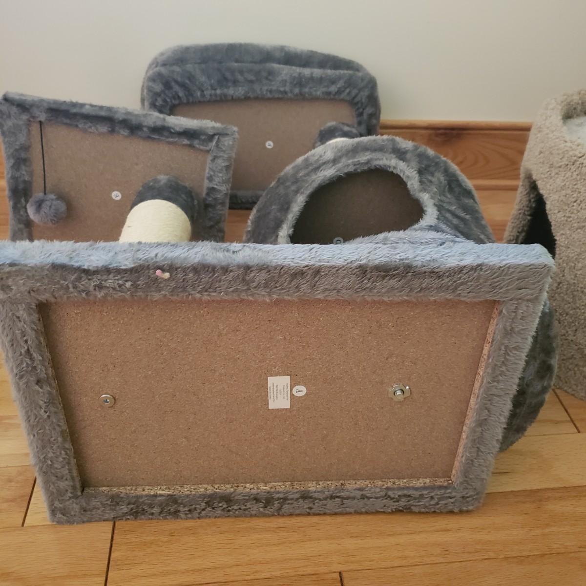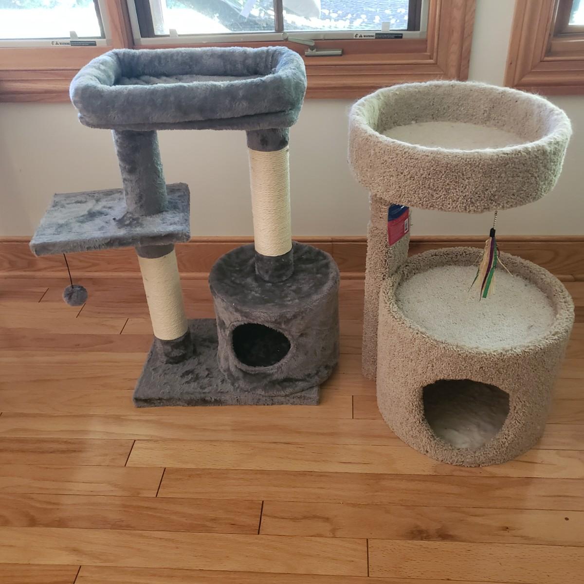 The tan colored Grreat Choice condo measures 18" x 15" x 27"H. It is covered with carpet like material. It appears to have been used. The grey condo measures 24" x 13" x 30"H. It is covered in a soft fur like material. The scratch posts have a rope wrapped around the structures. It appears to not be used.
