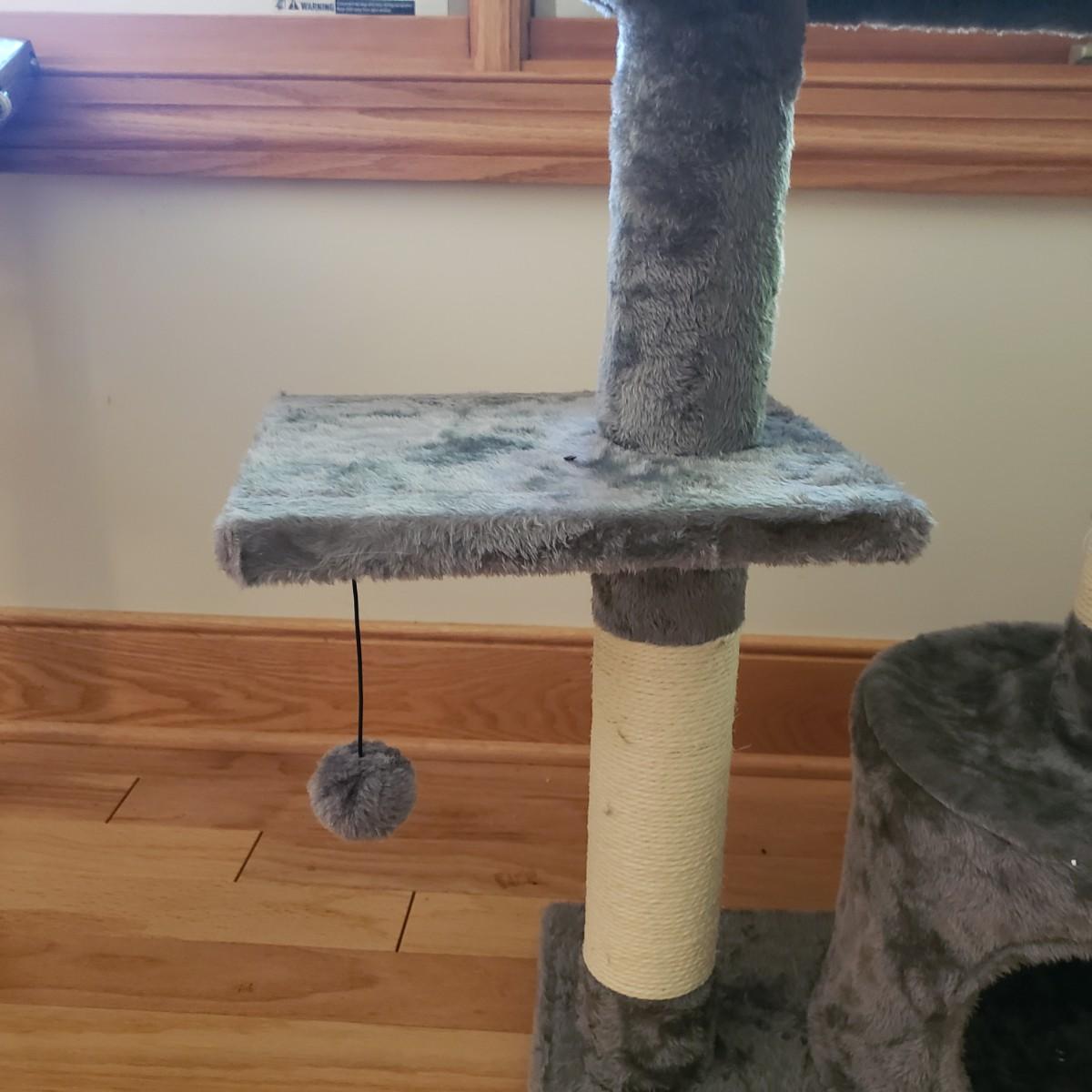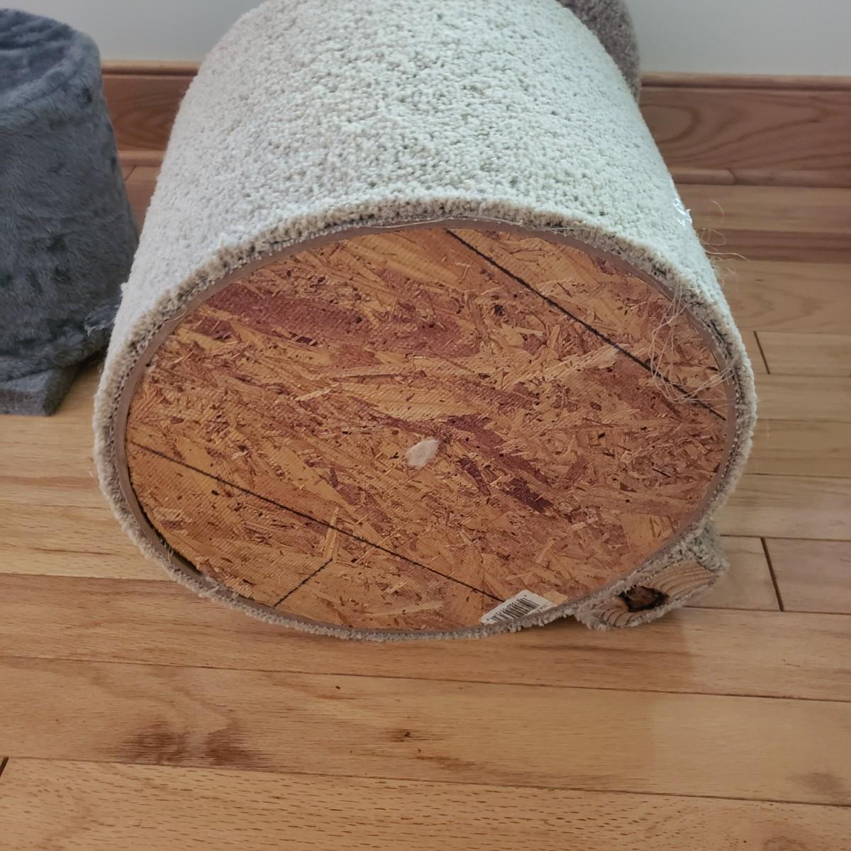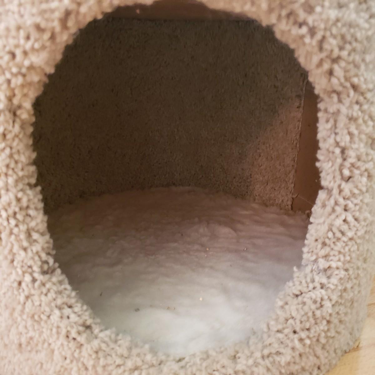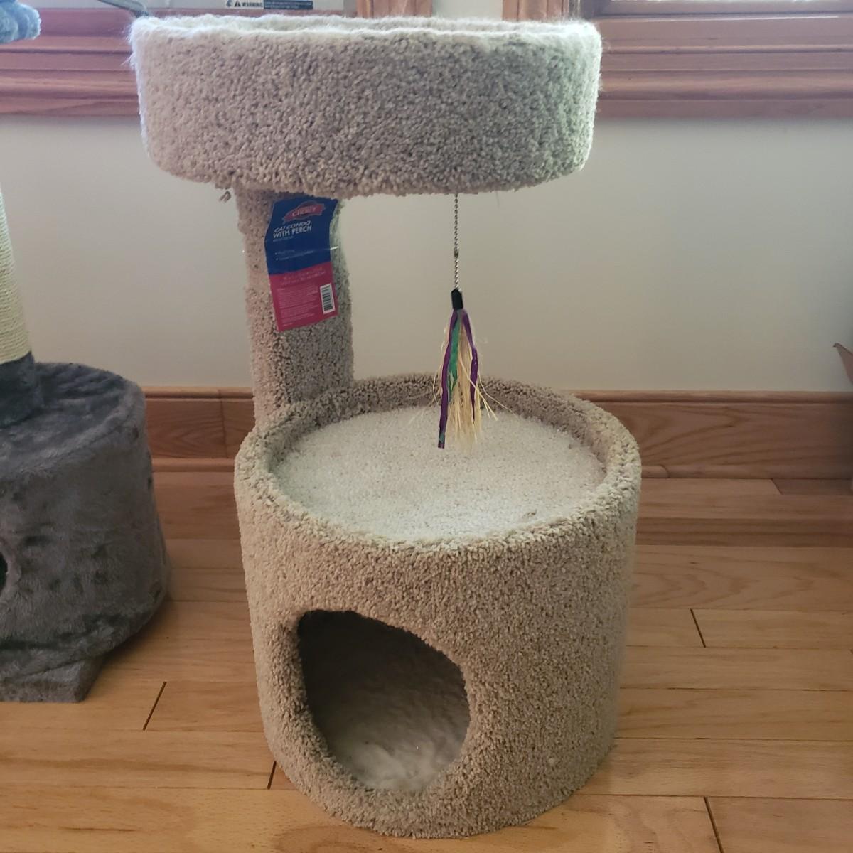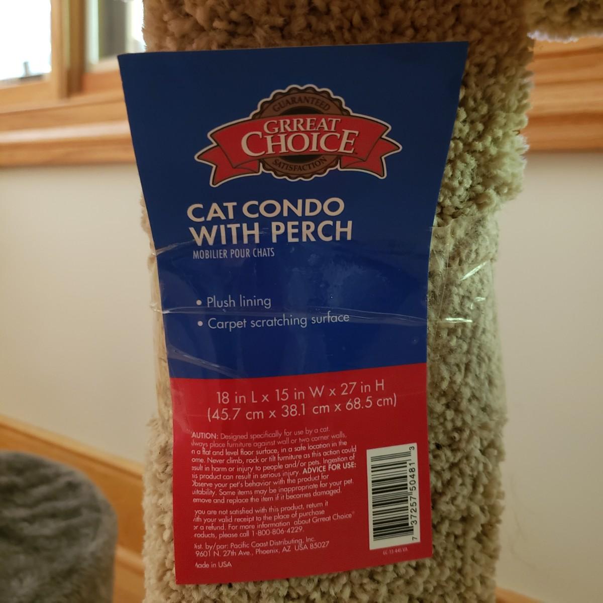 The tan colored Grreat Choice condo measures 18" x 15" x 27"H. It is covered with carpet like material. It appears to have been used. The grey condo measures 24" x 13" x 30"H. It is covered in a soft fur like material. The scratch posts have a rope wrapped around the structures. It appears to not be used.