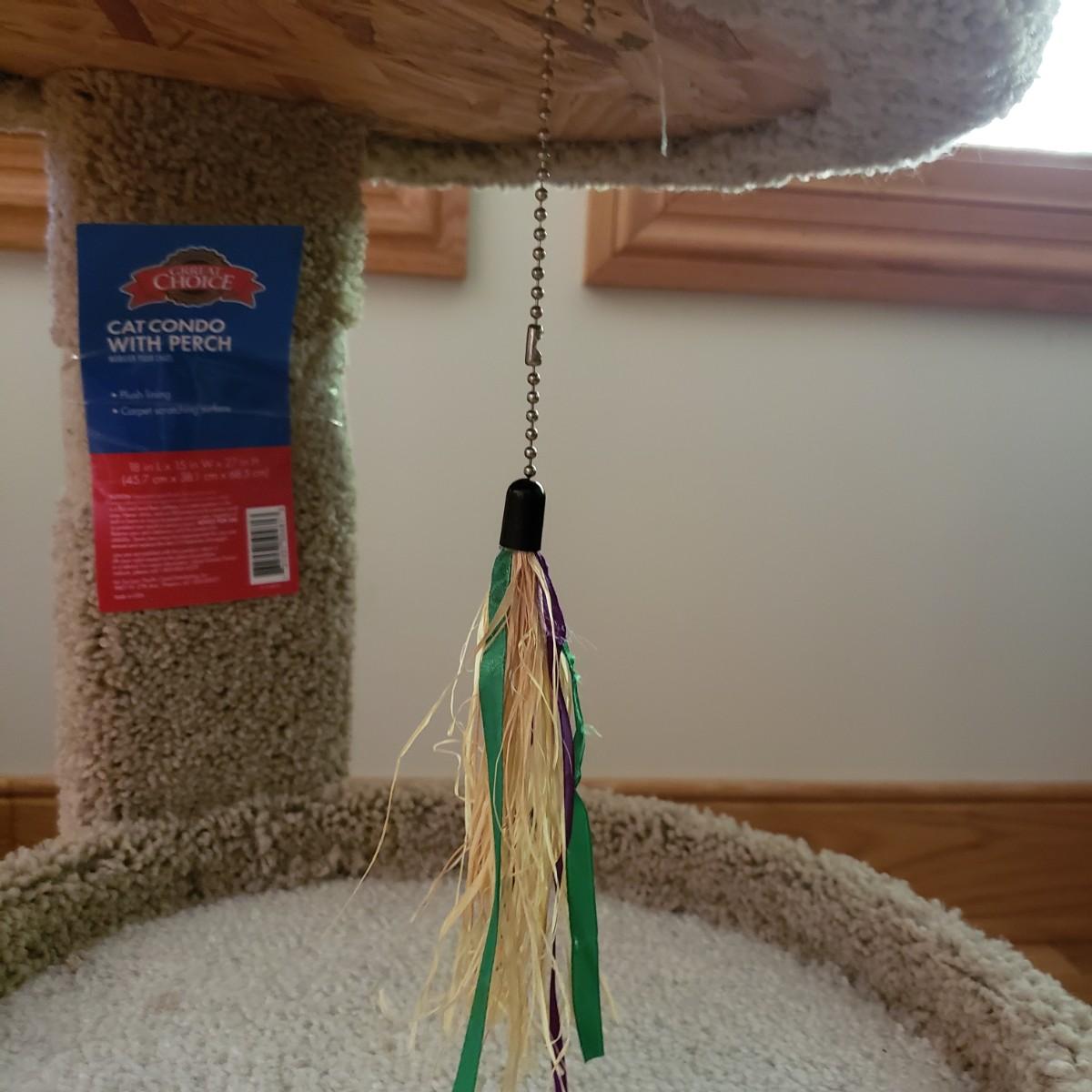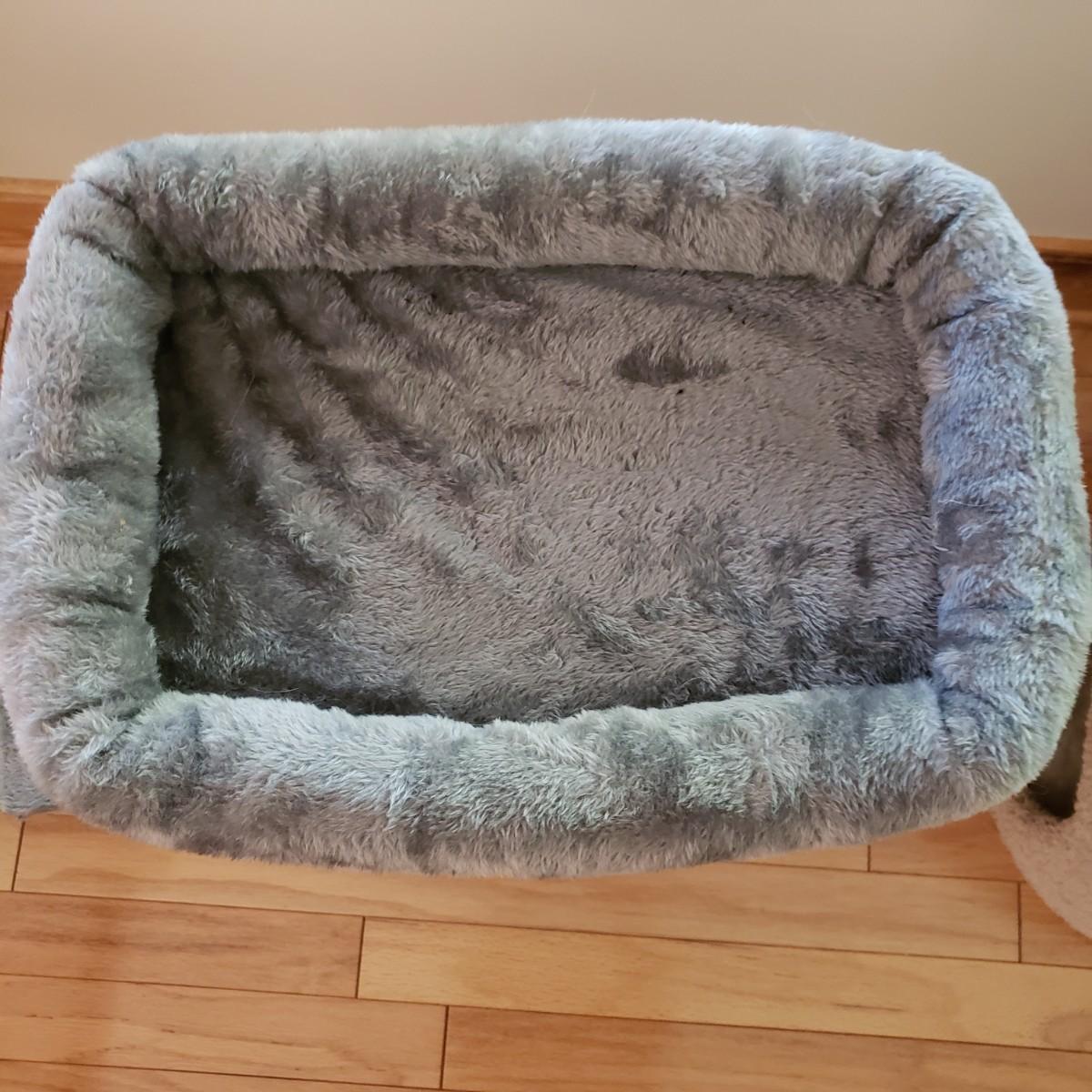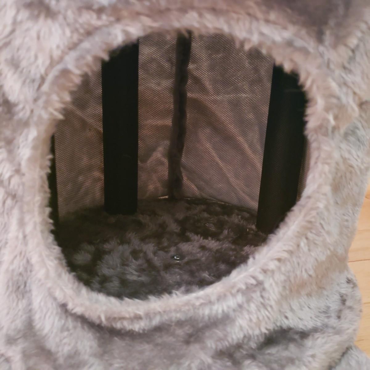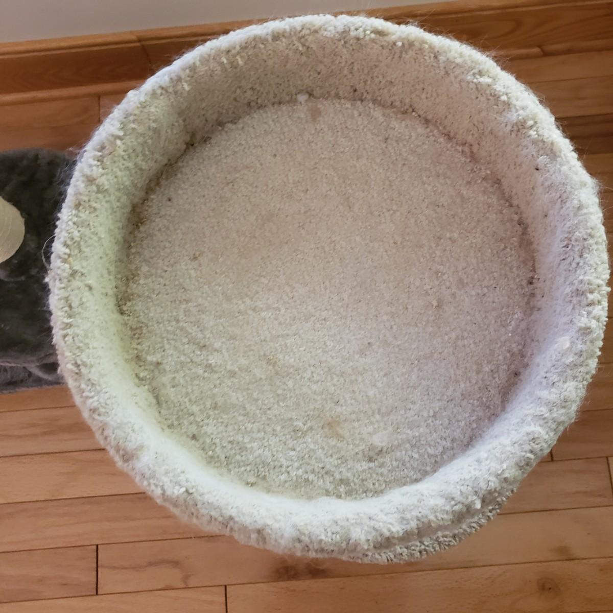 The tan colored Grreat Choice condo measures 18" x 15" x 27"H. It is covered with carpet like material. It appears to have been used. The grey condo measures 24" x 13" x 30"H. It is covered in a soft fur like material. The scratch posts have a rope wrapped around the structures. It appears to not be used.