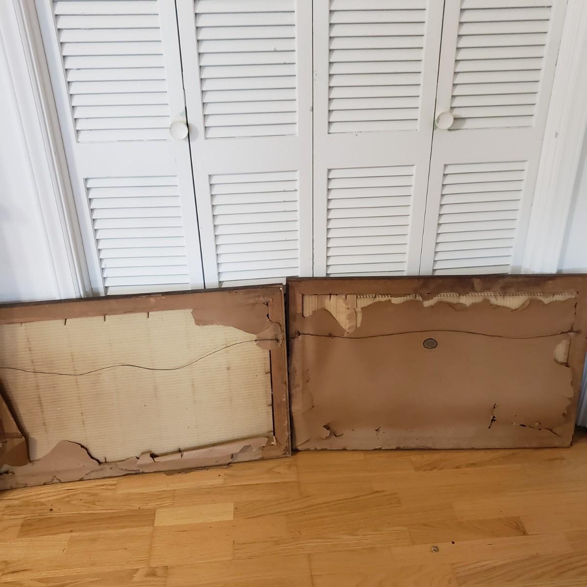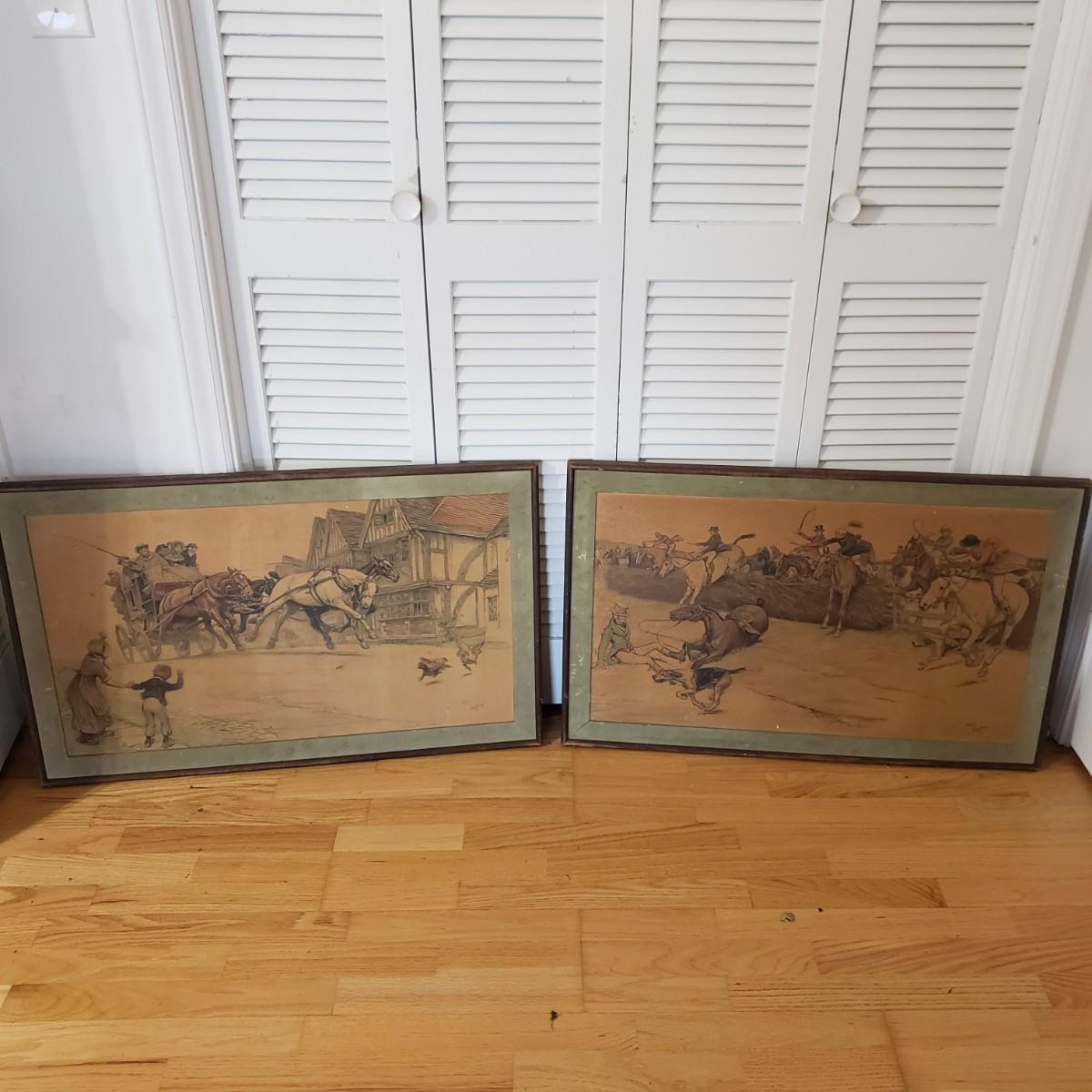 These two prints on board by Cecil Aldin with signatures that measure 34" x 21". They are each in a wood frame, matted with no glass. The paper backings are flaking due to age. There is some wear on the mats and frames, see pictures. The original artwork is believed to have been crayon and ink.