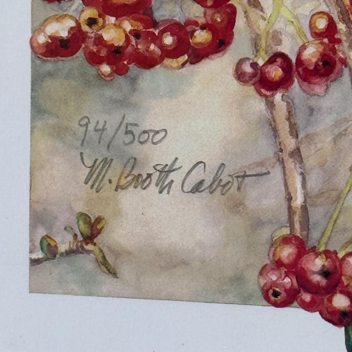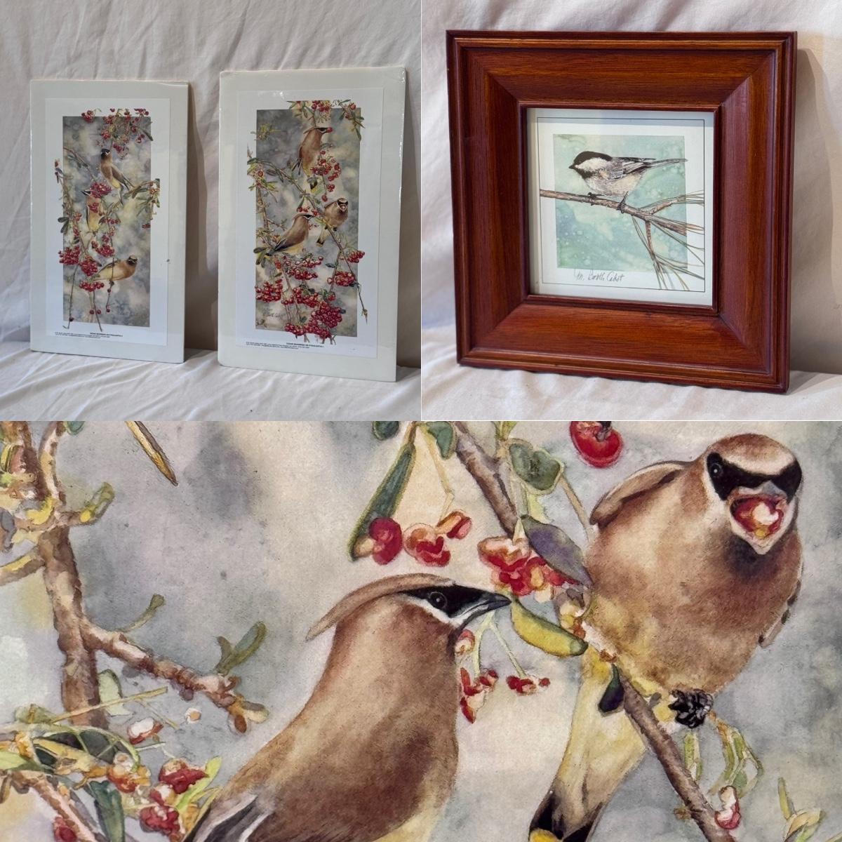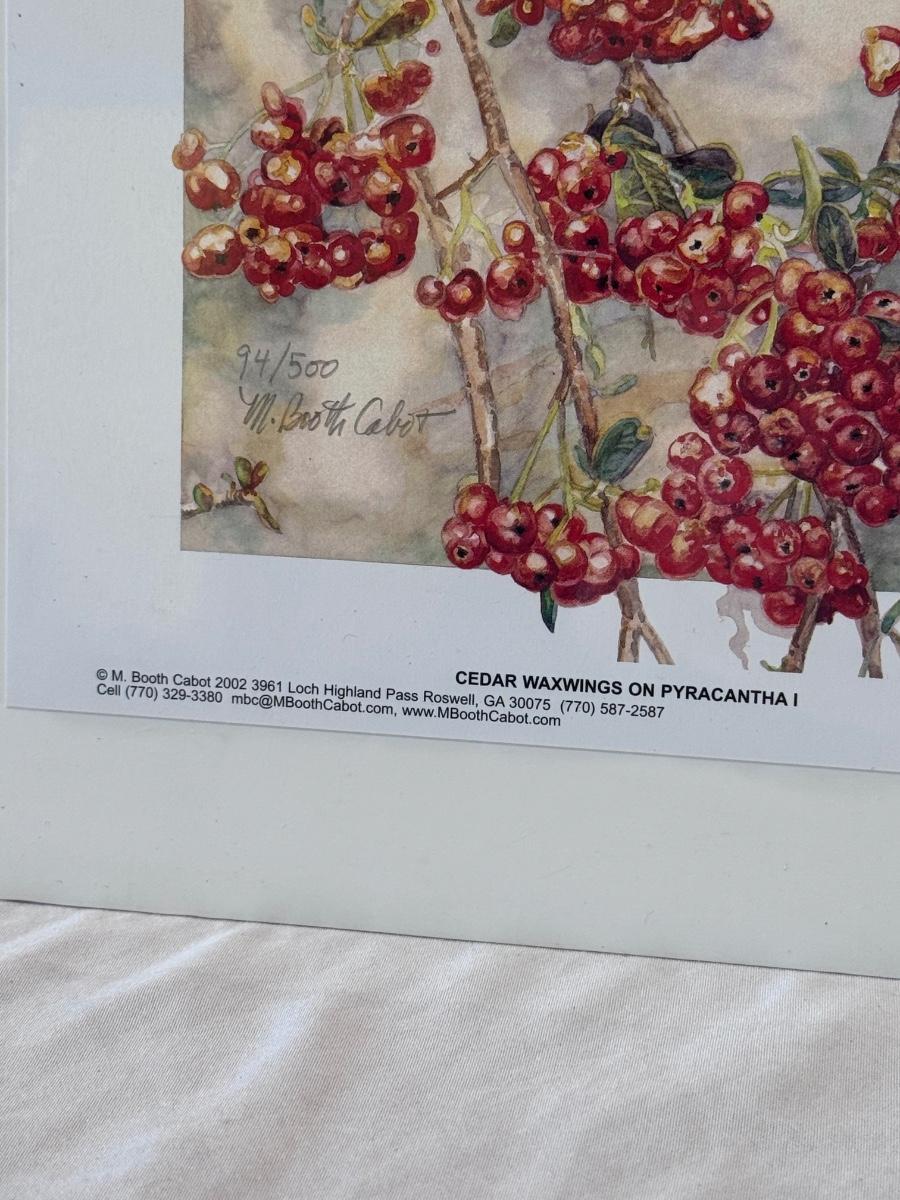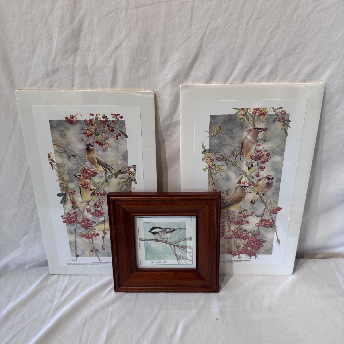 This lot includes two horizontal prints of cedar waxwings on pyracantha and one print of a woodland chickadee - all three are by M. Booth Cabot. The woodland chickadee is framed in a wooden frame and protected with a sheet of glass. All three appear to be signed in pencil. The larger prints individually measure 7” x 13”H. Shipping available.