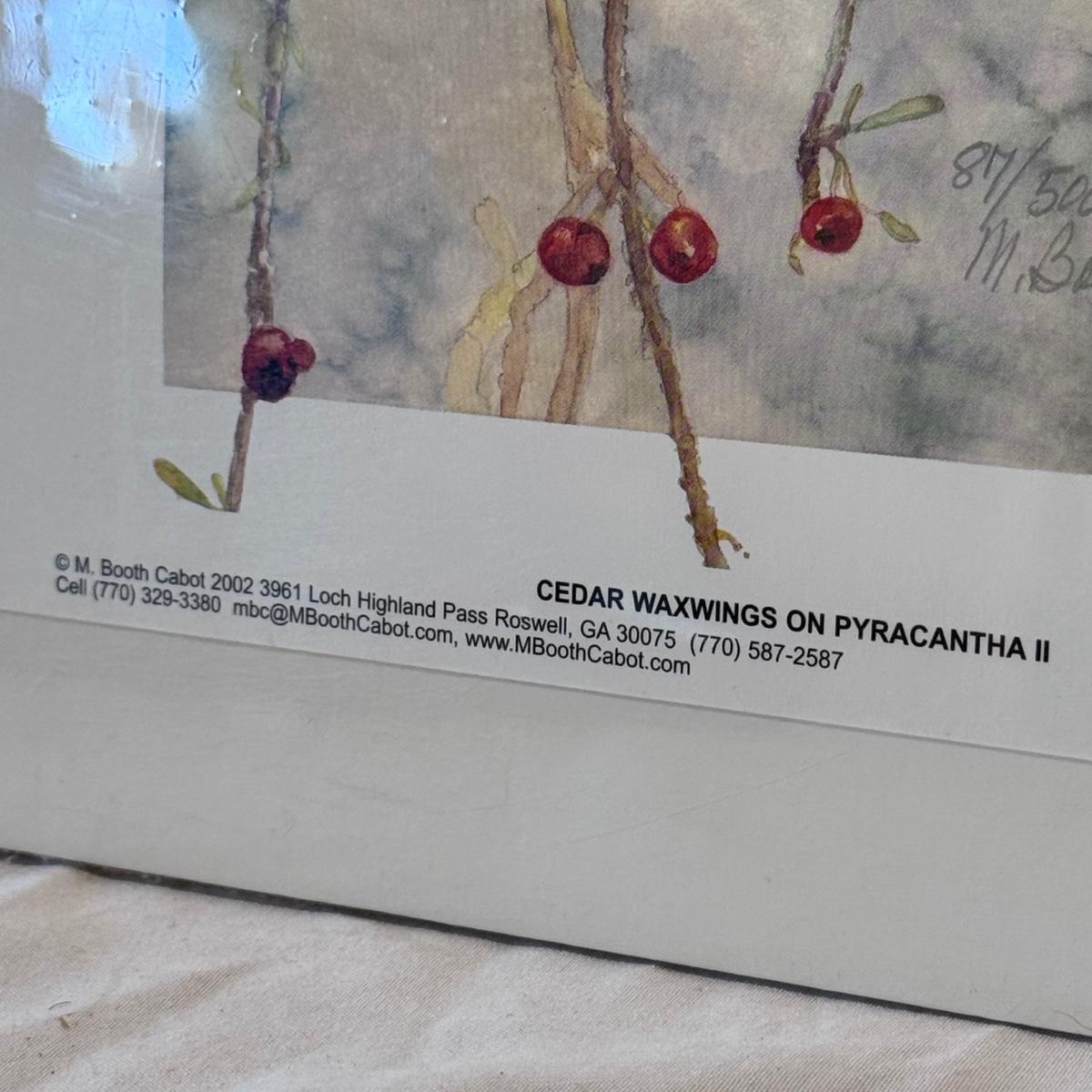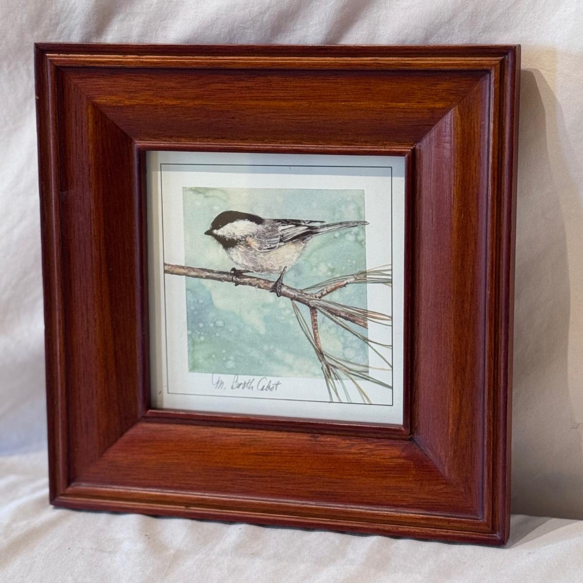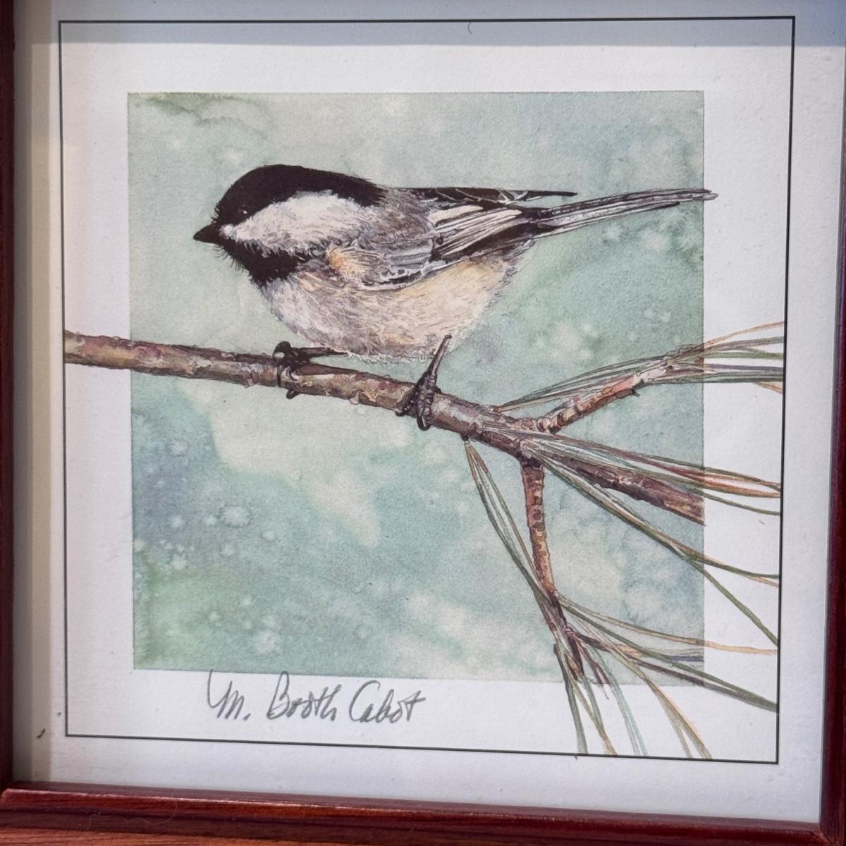 This lot includes two horizontal prints of cedar waxwings on pyracantha and one print of a woodland chickadee - all three are by M. Booth Cabot. The woodland chickadee is framed in a wooden frame and protected with a sheet of glass. All three appear to be signed in pencil. The larger prints individually measure 7” x 13”H. Shipping available.