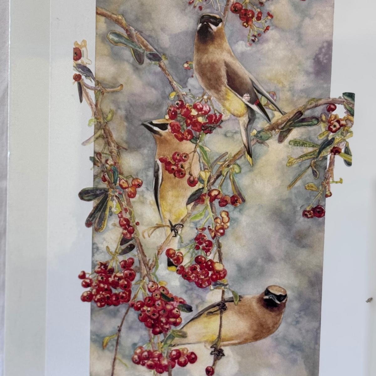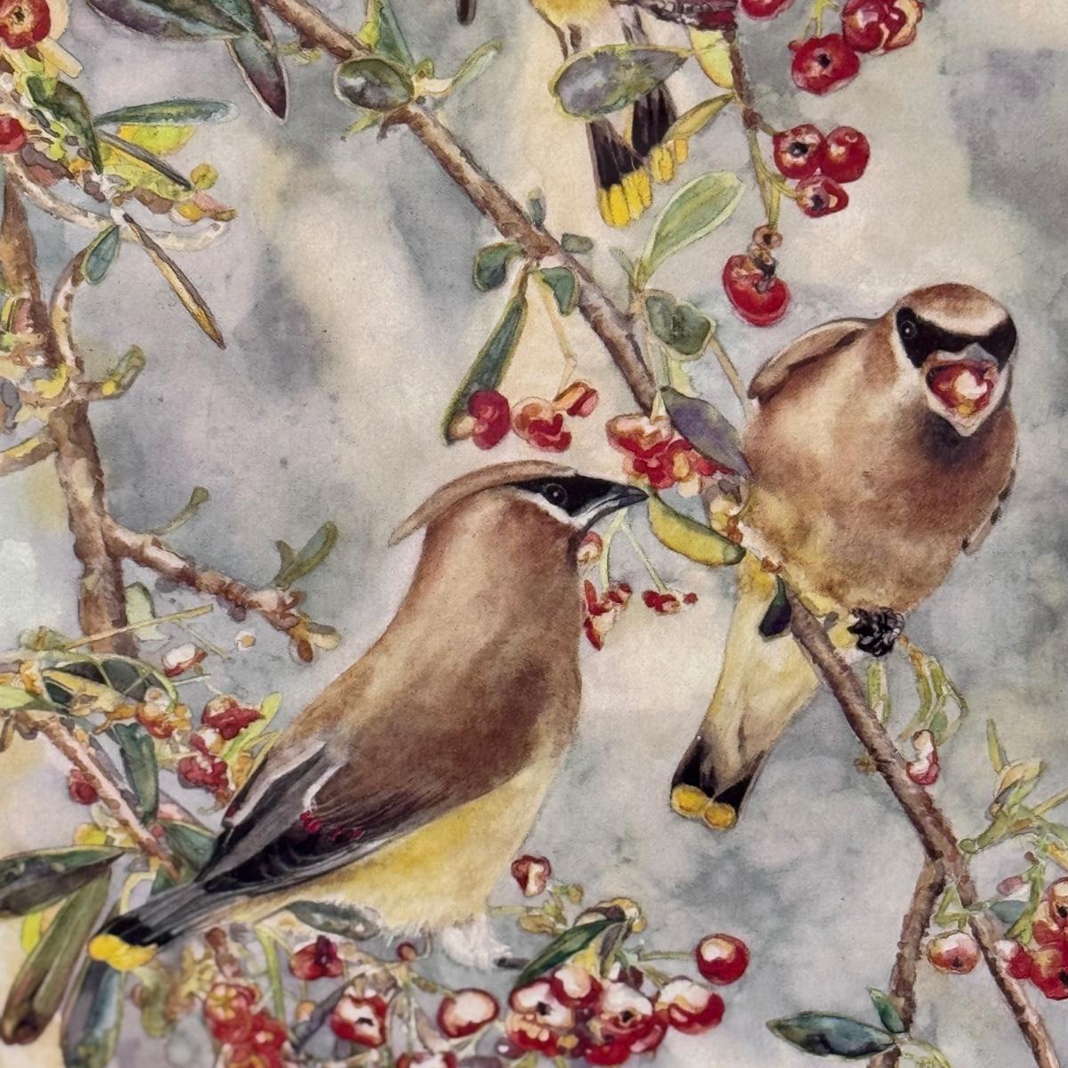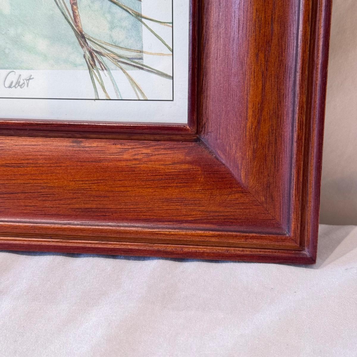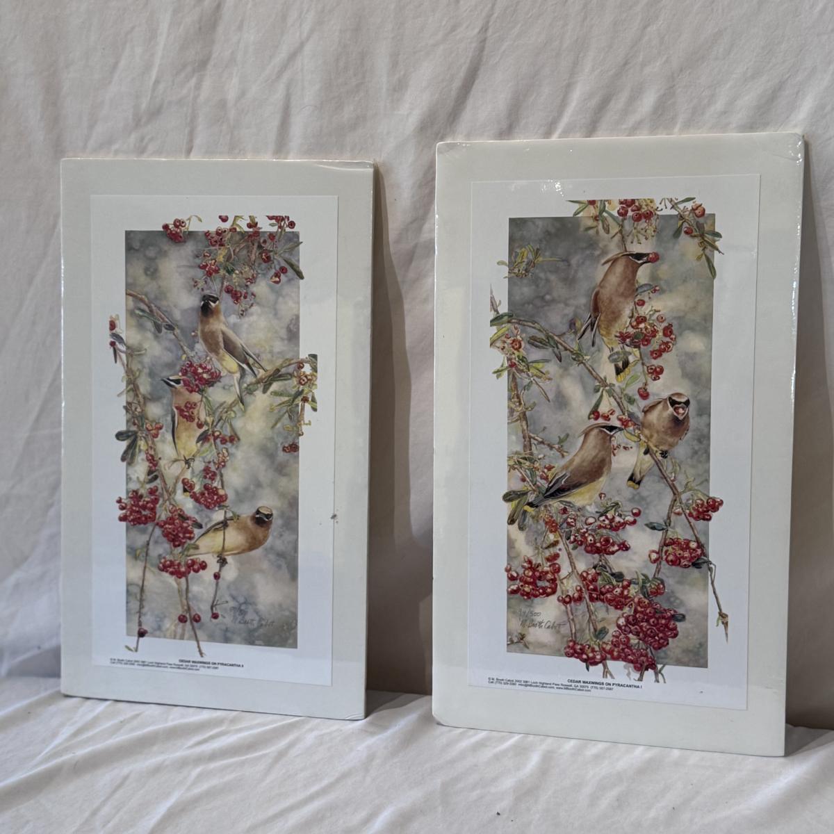This lot includes two horizontal prints of cedar waxwings on pyracantha and one print of a woodland chickadee - all three are by M. Booth Cabot. The woodland chickadee is framed in a wooden frame and protected with a sheet of glass. All three appear to be signed in pencil. The larger prints individually measure 7” x 13”H. Shipping available.