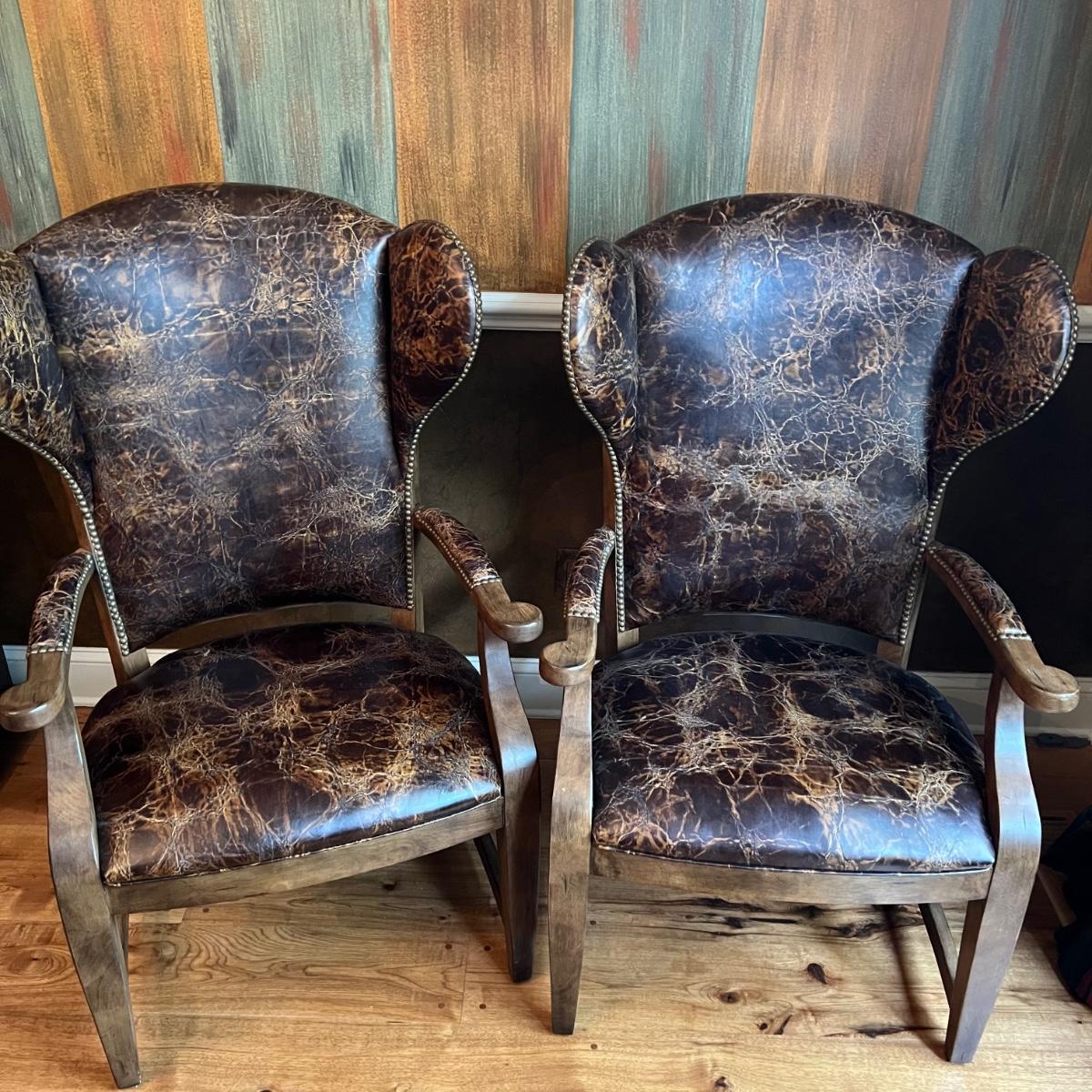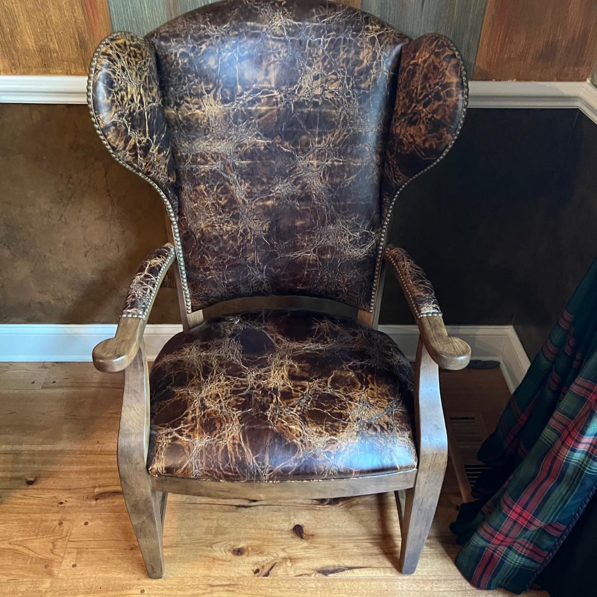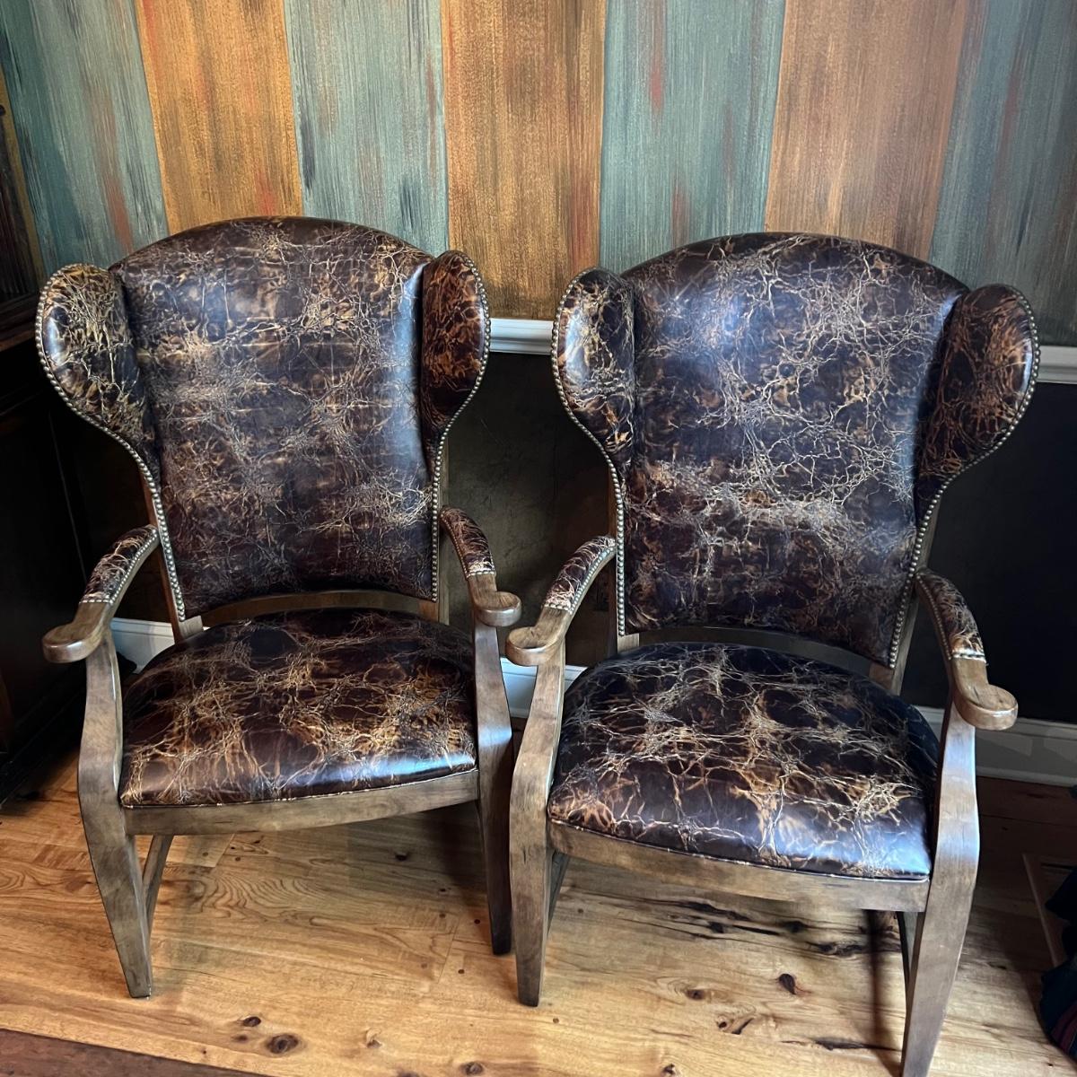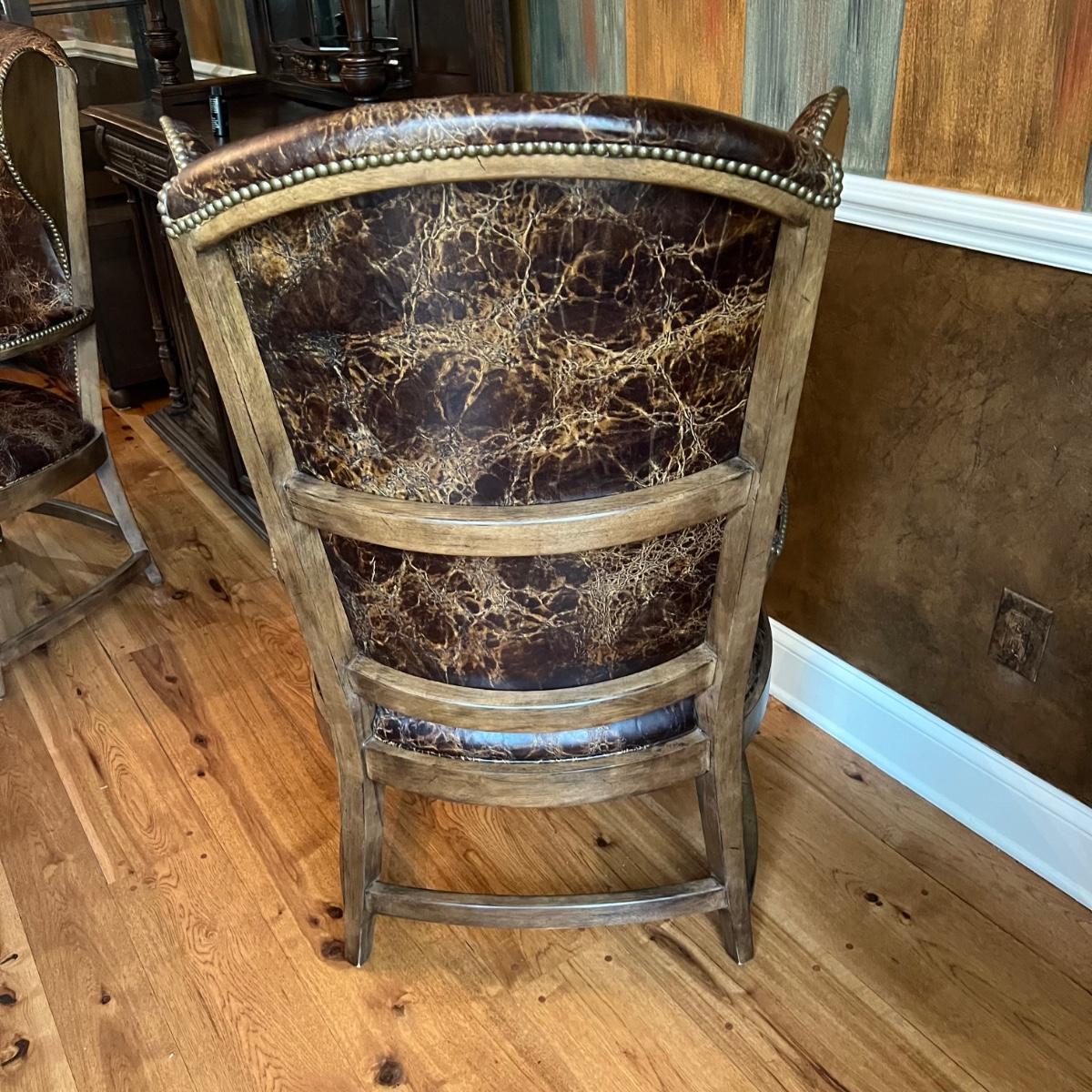 Two very distinct distressed leather, wing back style, arm chairs by Century Furniture. Each chair is styled with riveted edges and a light brown stained wood. They measure 28.5” x 22” x 47”H with a 20” seat height.