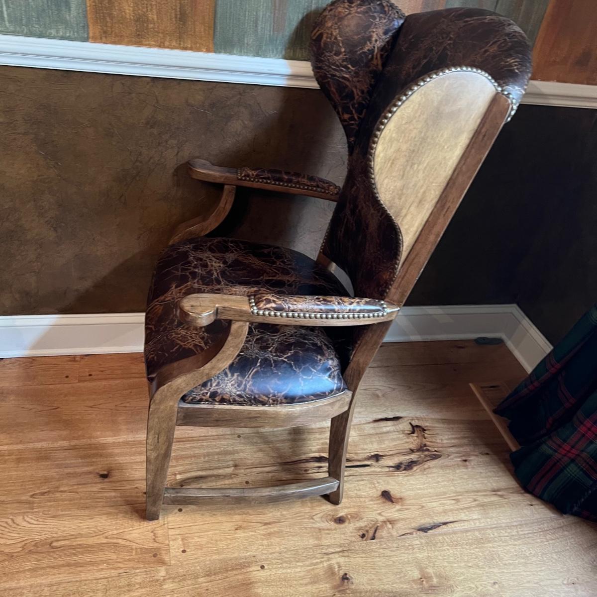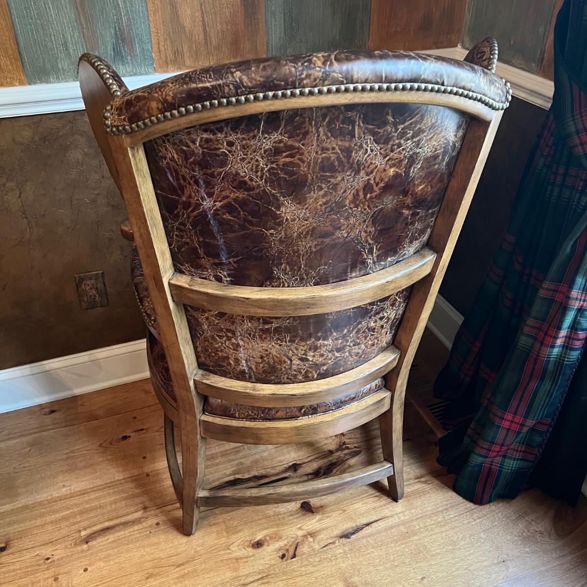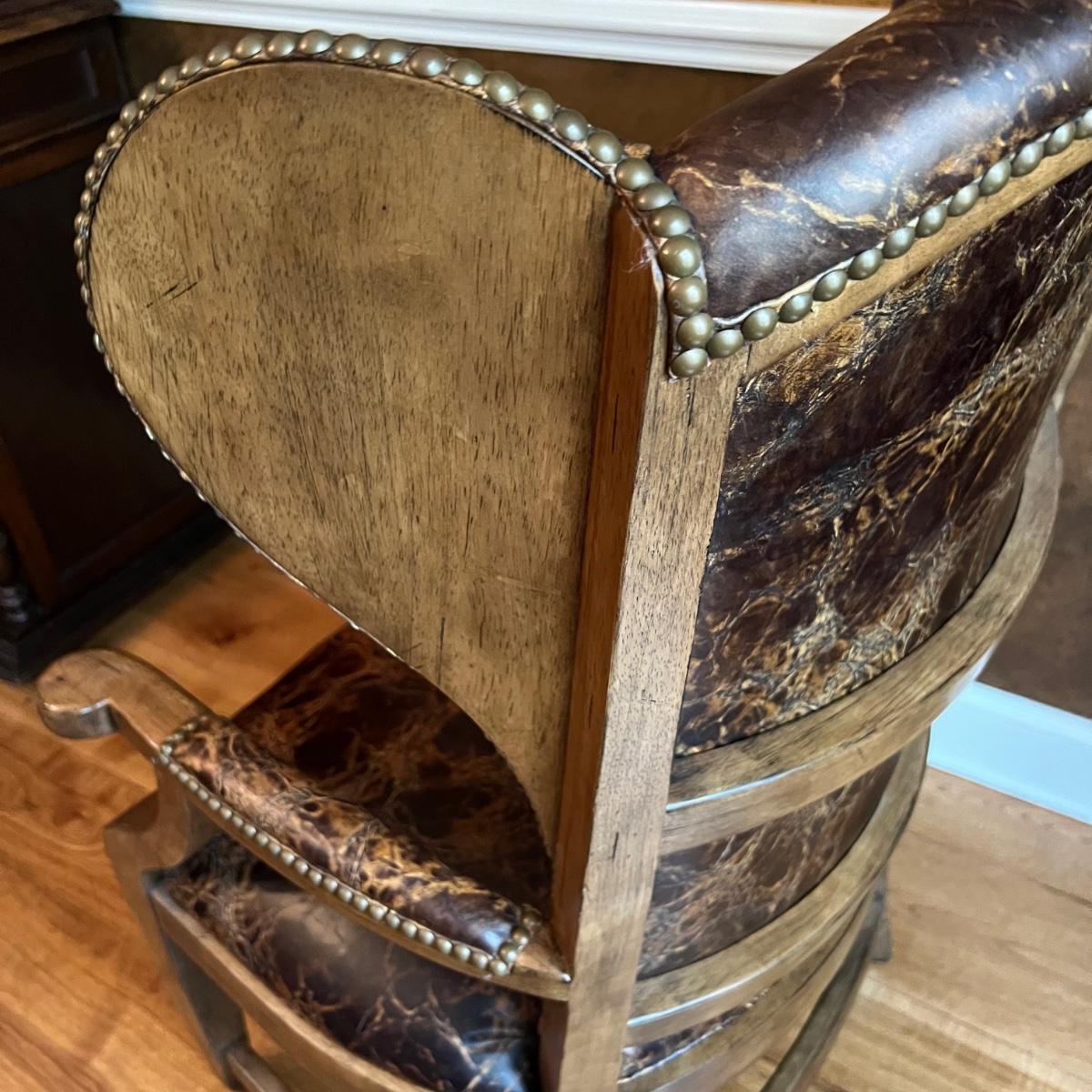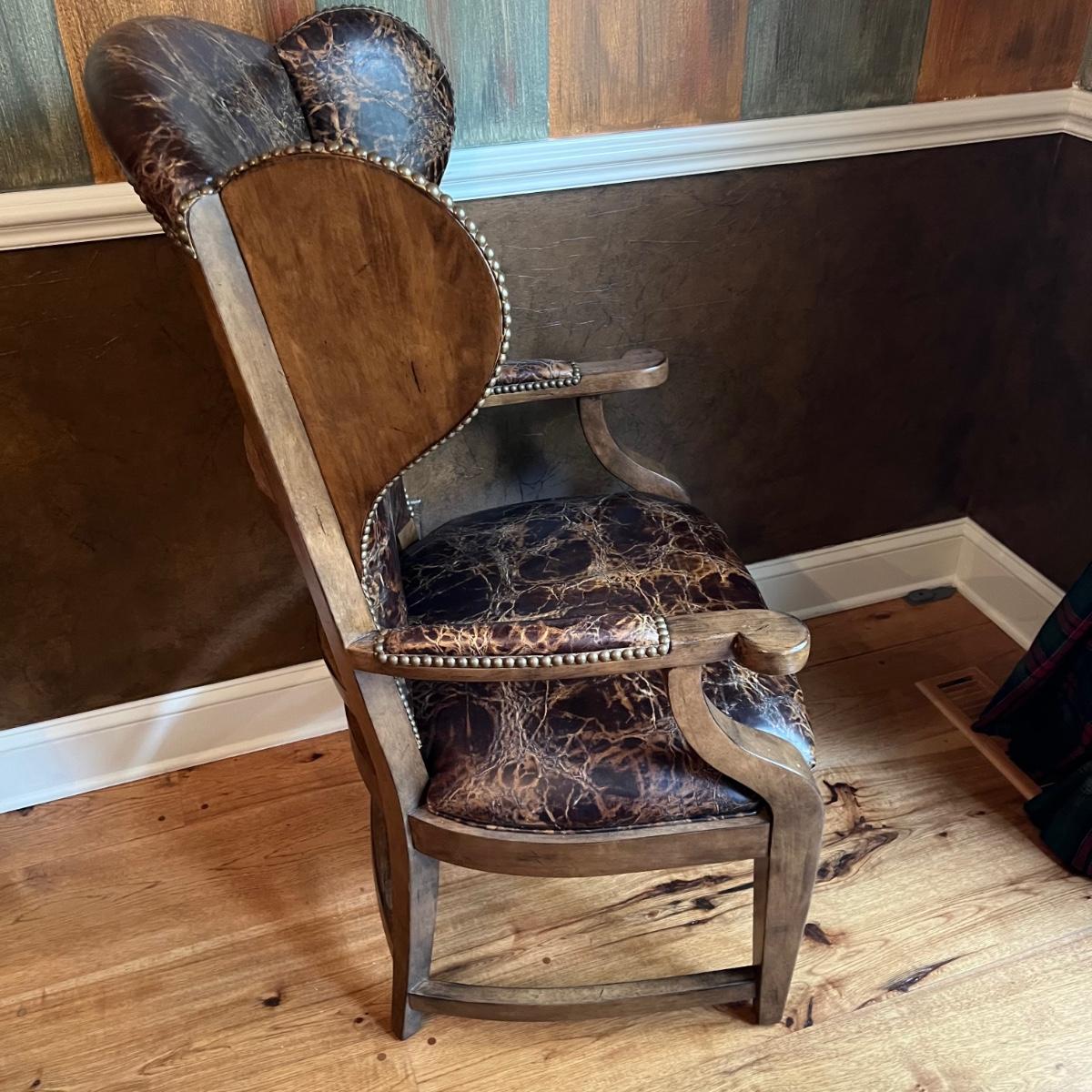 Two very distinct distressed leather, wing back style, arm chairs by Century Furniture. Each chair is styled with riveted edges and a light brown stained wood. They measure 28.5” x 22” x 47”H with a 20” seat height.