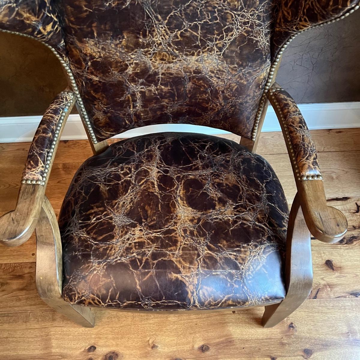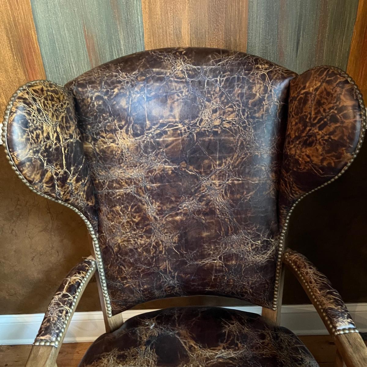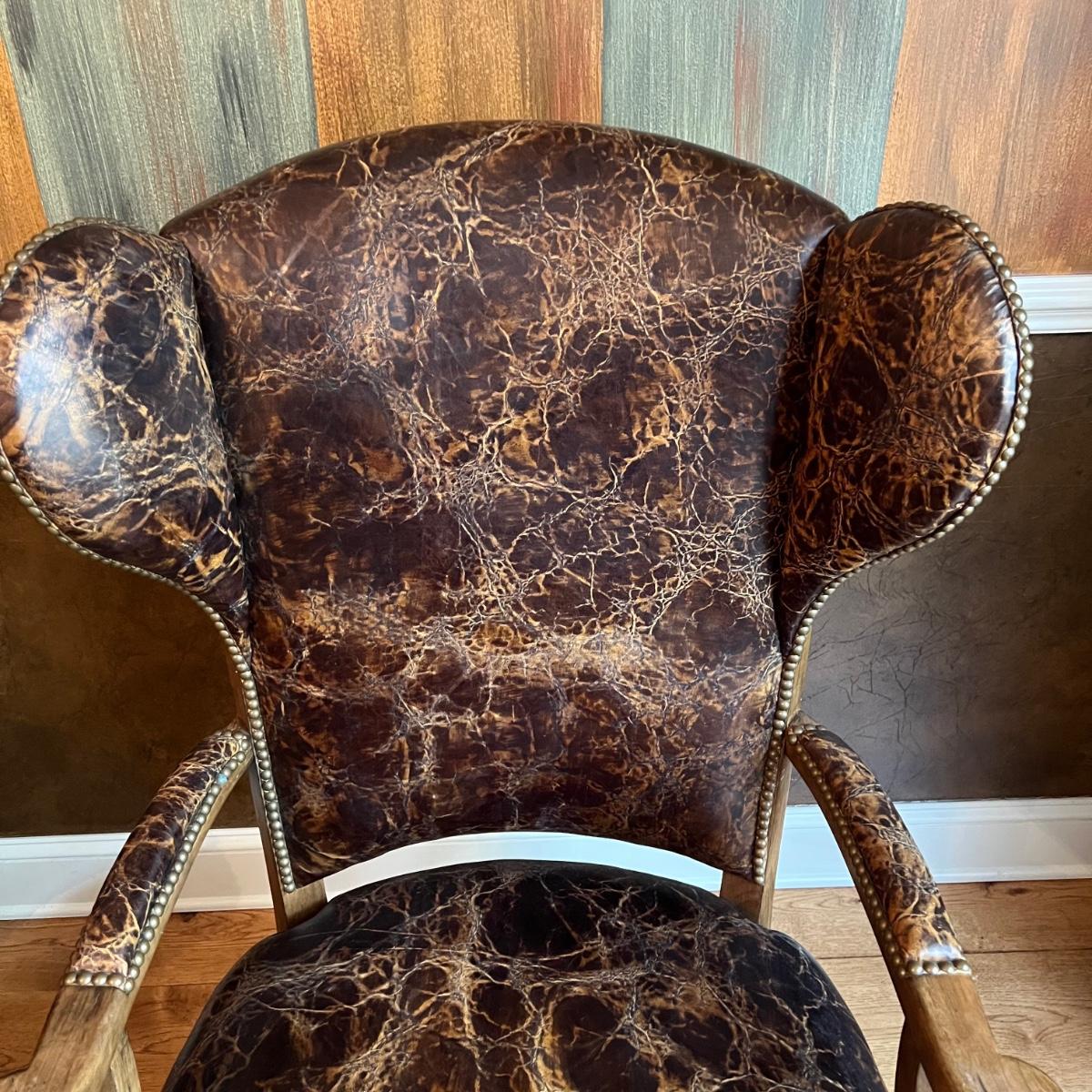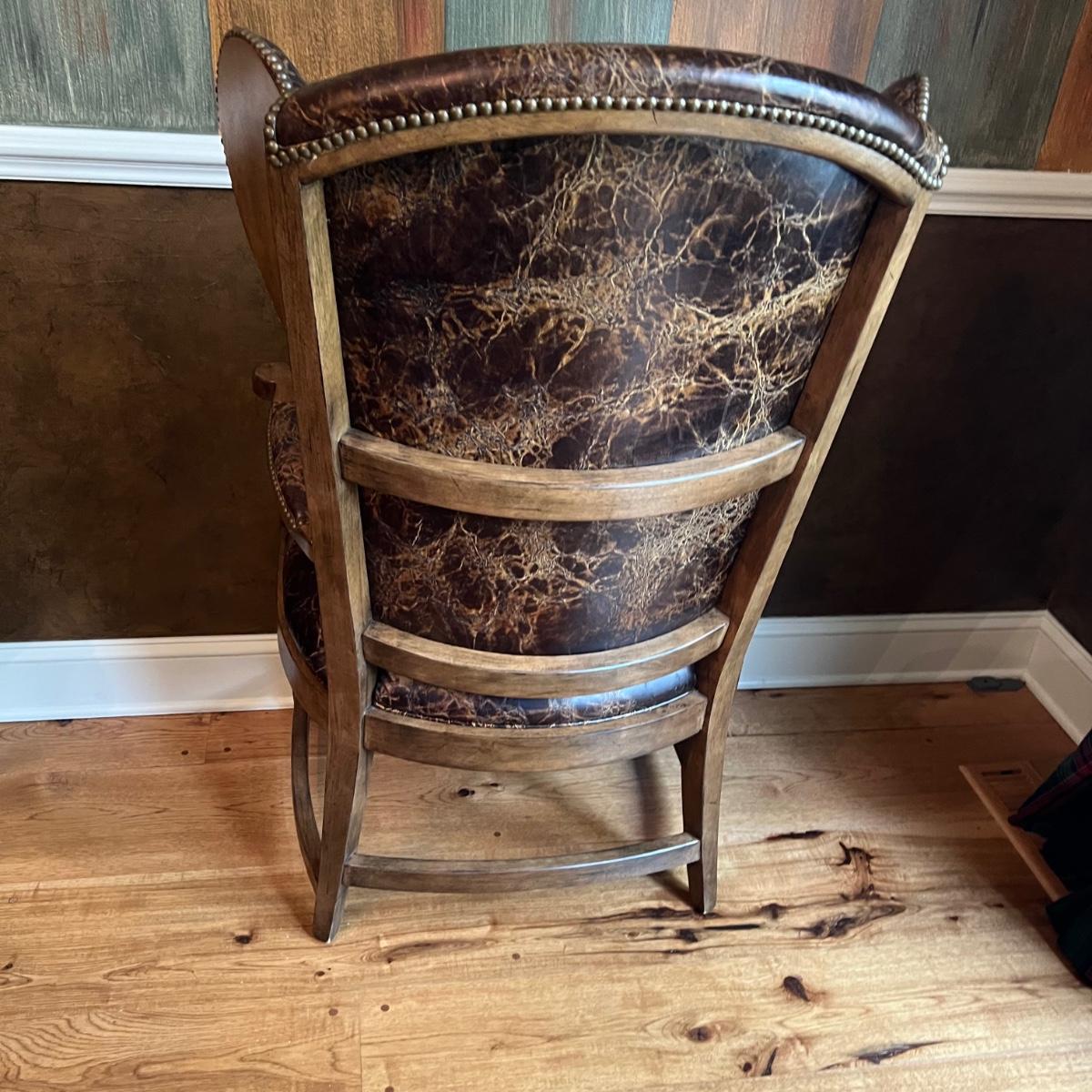 Two very distinct distressed leather, wing back style, arm chairs by Century Furniture. Each chair is styled with riveted edges and a light brown stained wood. They measure 28.5” x 22” x 47”H with a 20” seat height.