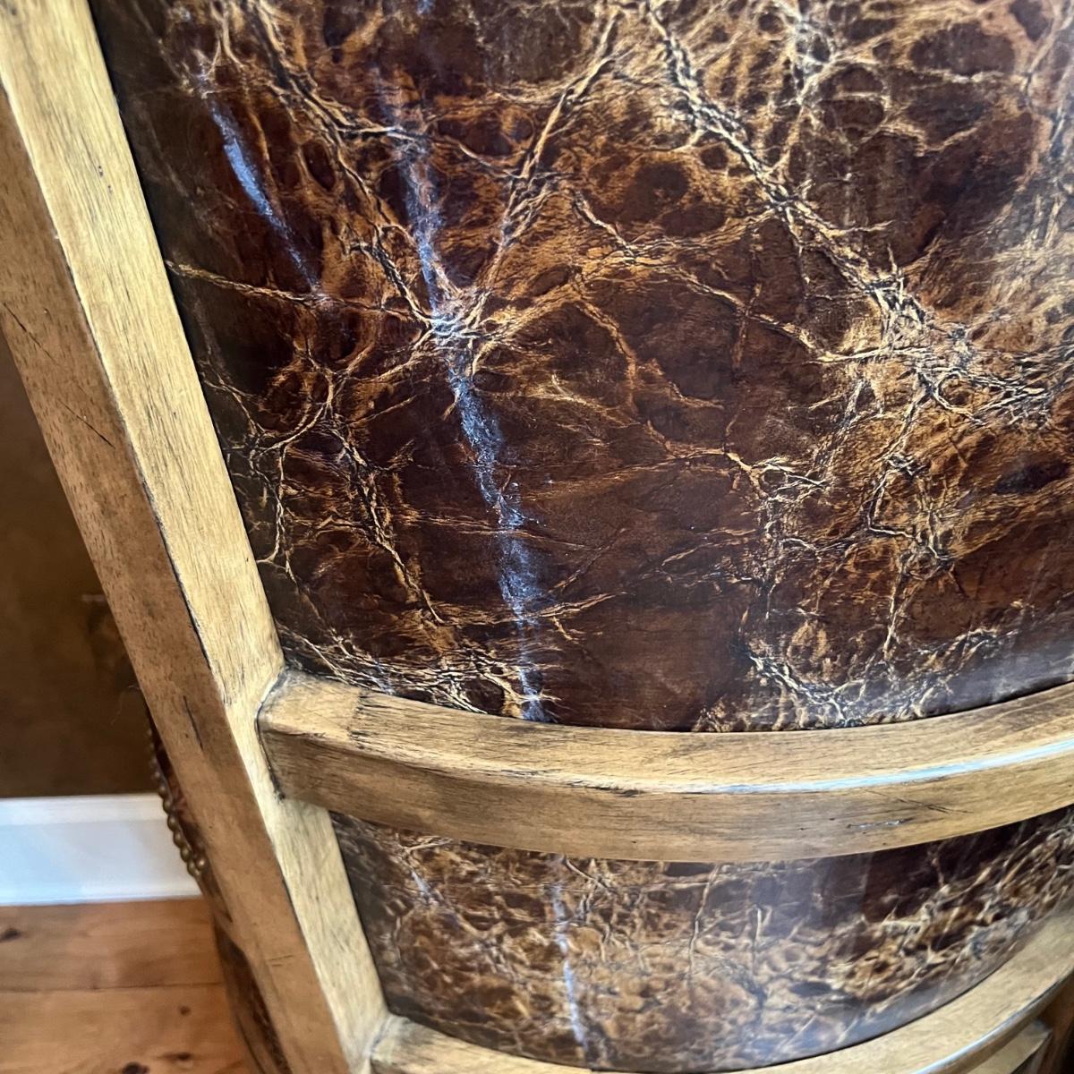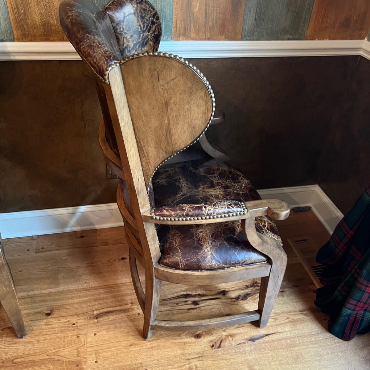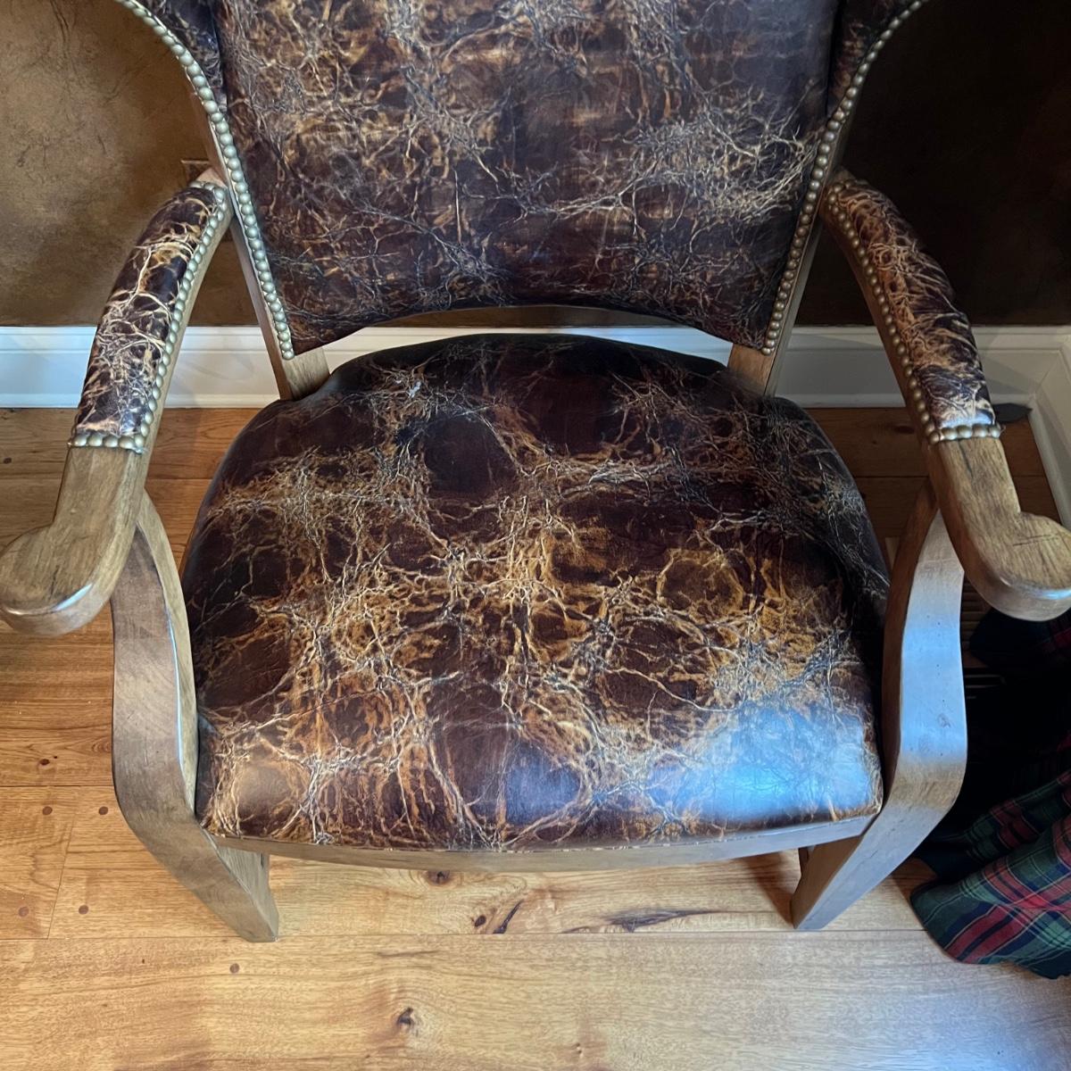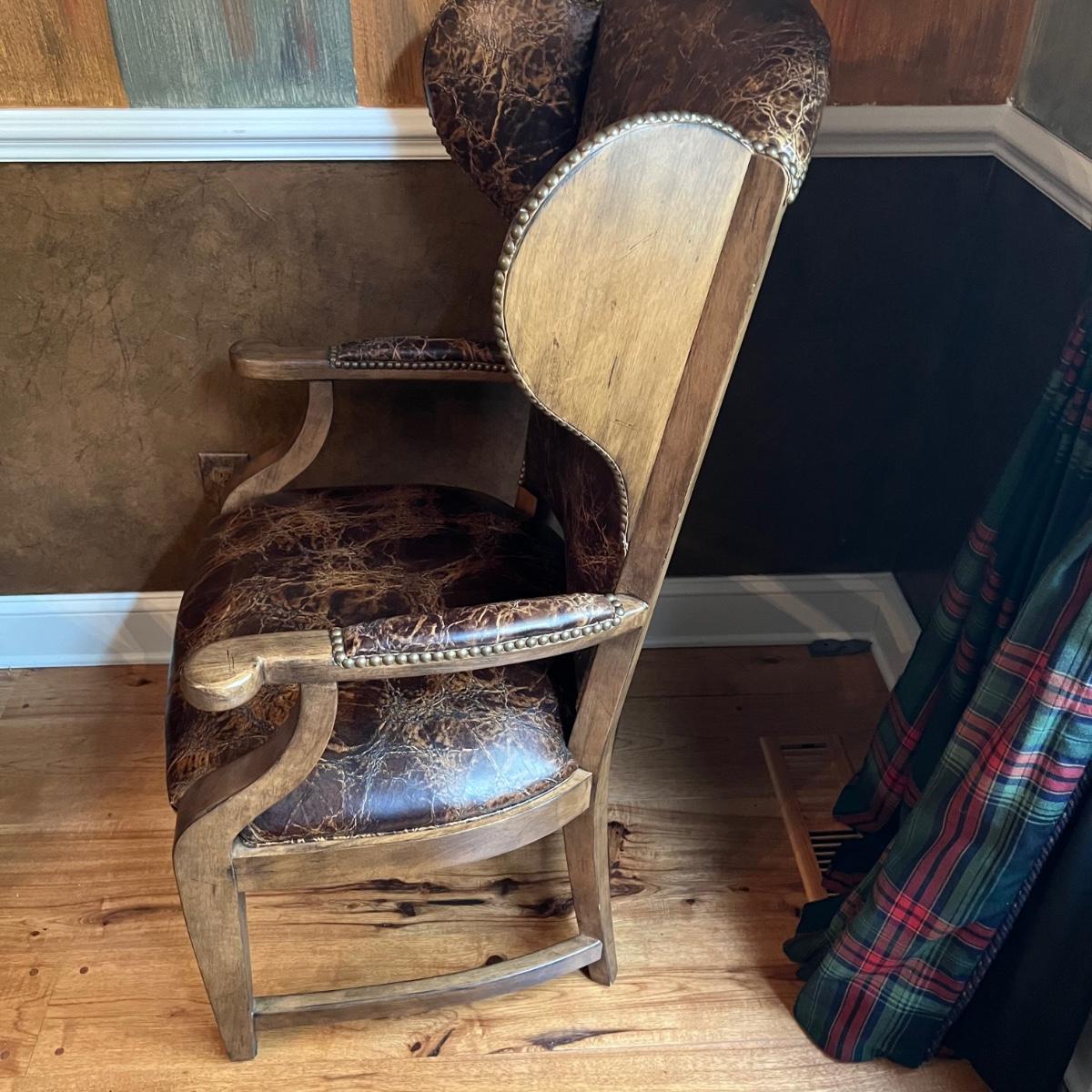 Two very distinct distressed leather, wing back style, arm chairs by Century Furniture. Each chair is styled with riveted edges and a light brown stained wood. They measure 28.5” x 22” x 47”H with a 20” seat height.