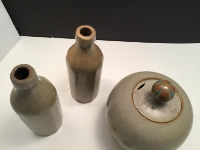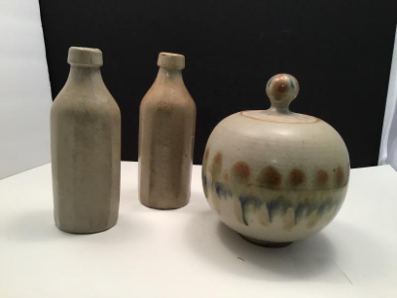 Two ceramic bottles vintage unsigned and one ceramic signed pot with lid Cannot make out the signature on the pot. Please note lid on the pot has large chip