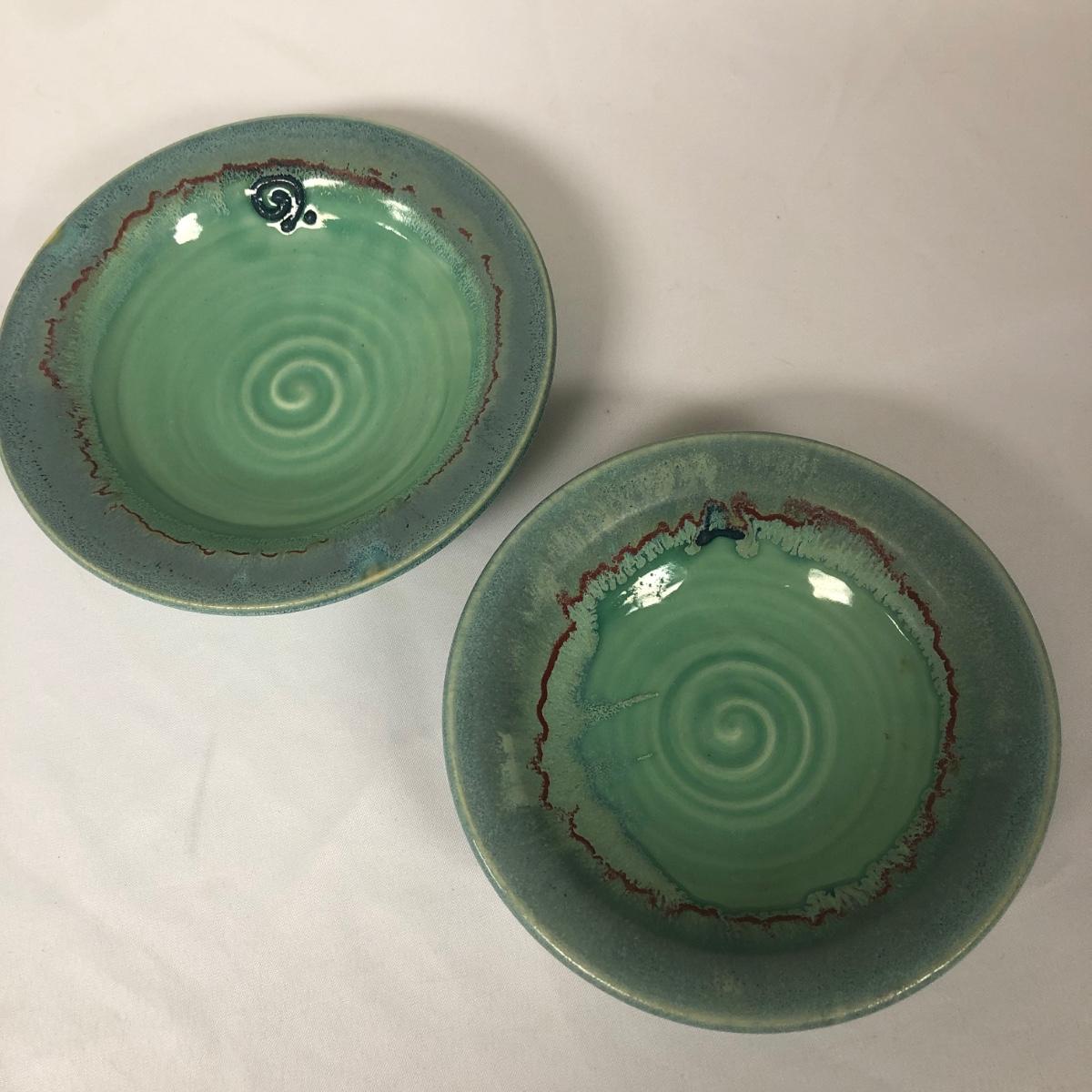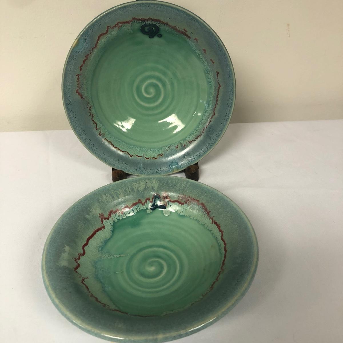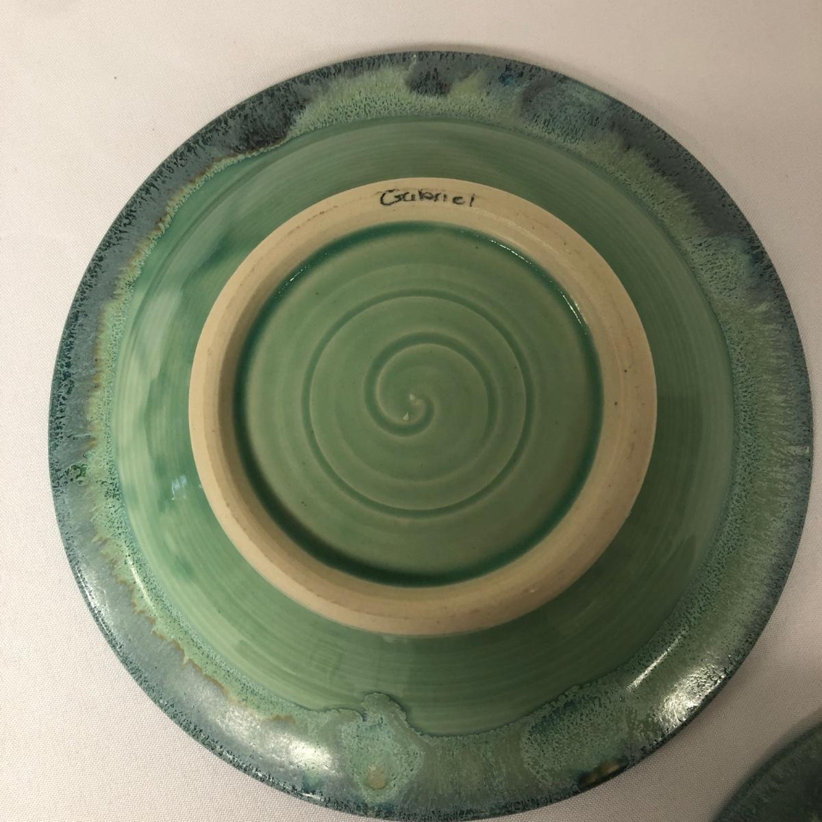 These two handcrafted ceramic bowls measure 8” and 7” in diameter. Both have a mark on the front and “Gabriel” is written on the back of both bowls. Both bowls are in excellent condition with no chips or cracks. Shipping Available.