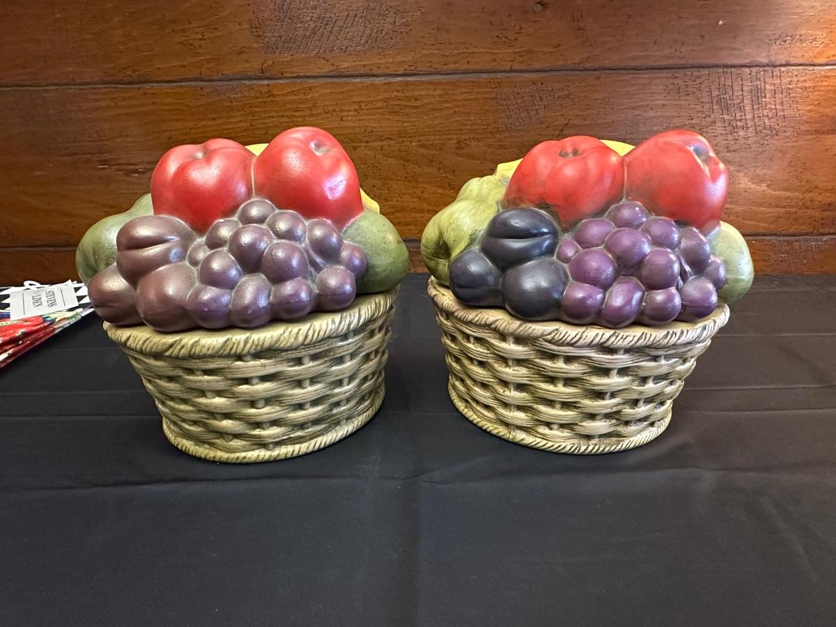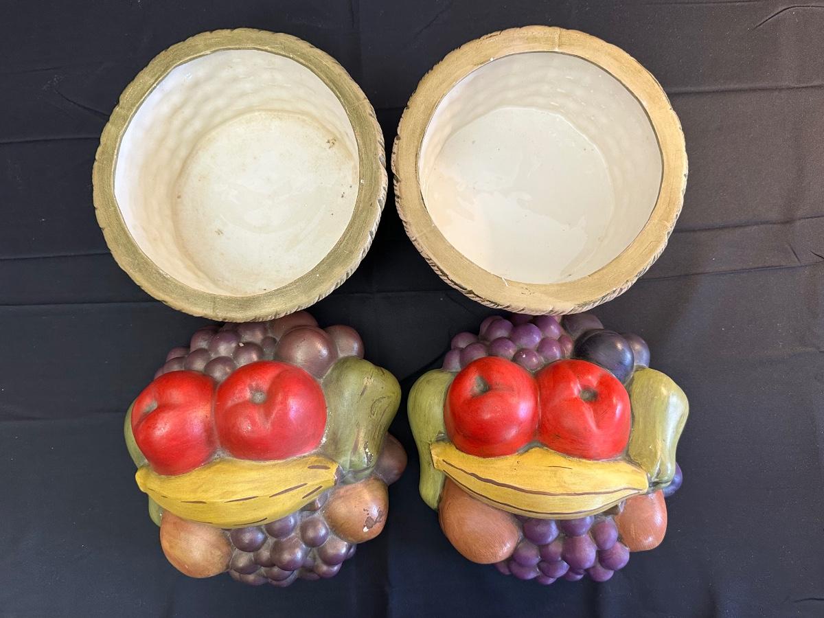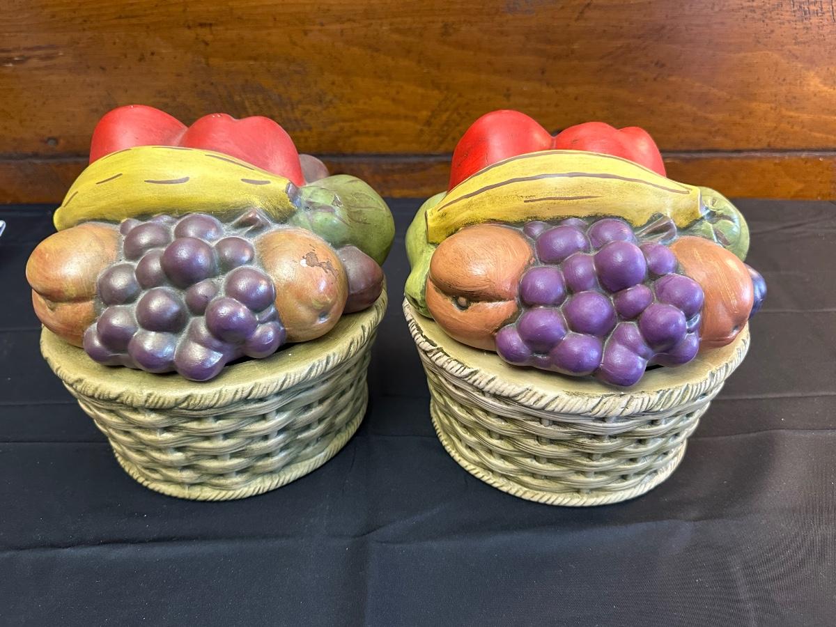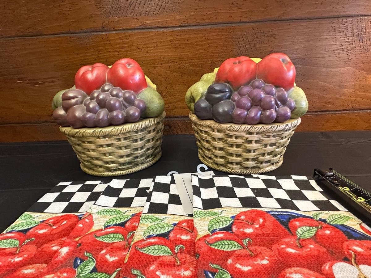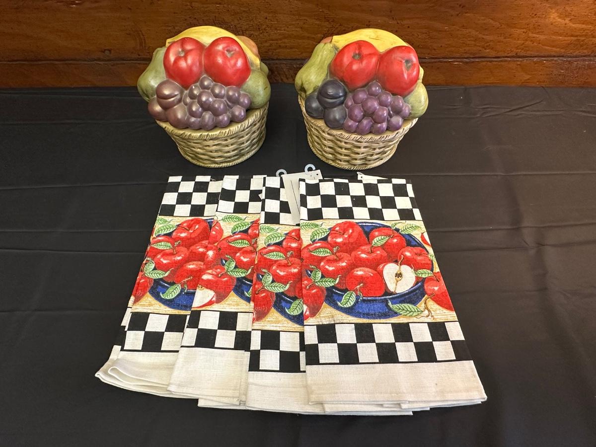 Two Ceramic Fruit Holders with Removable Lids & Dish Towels