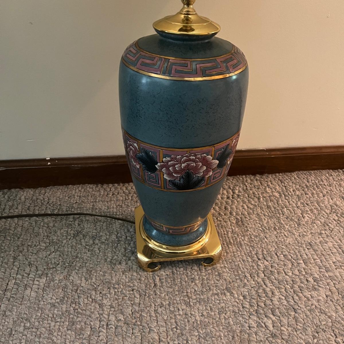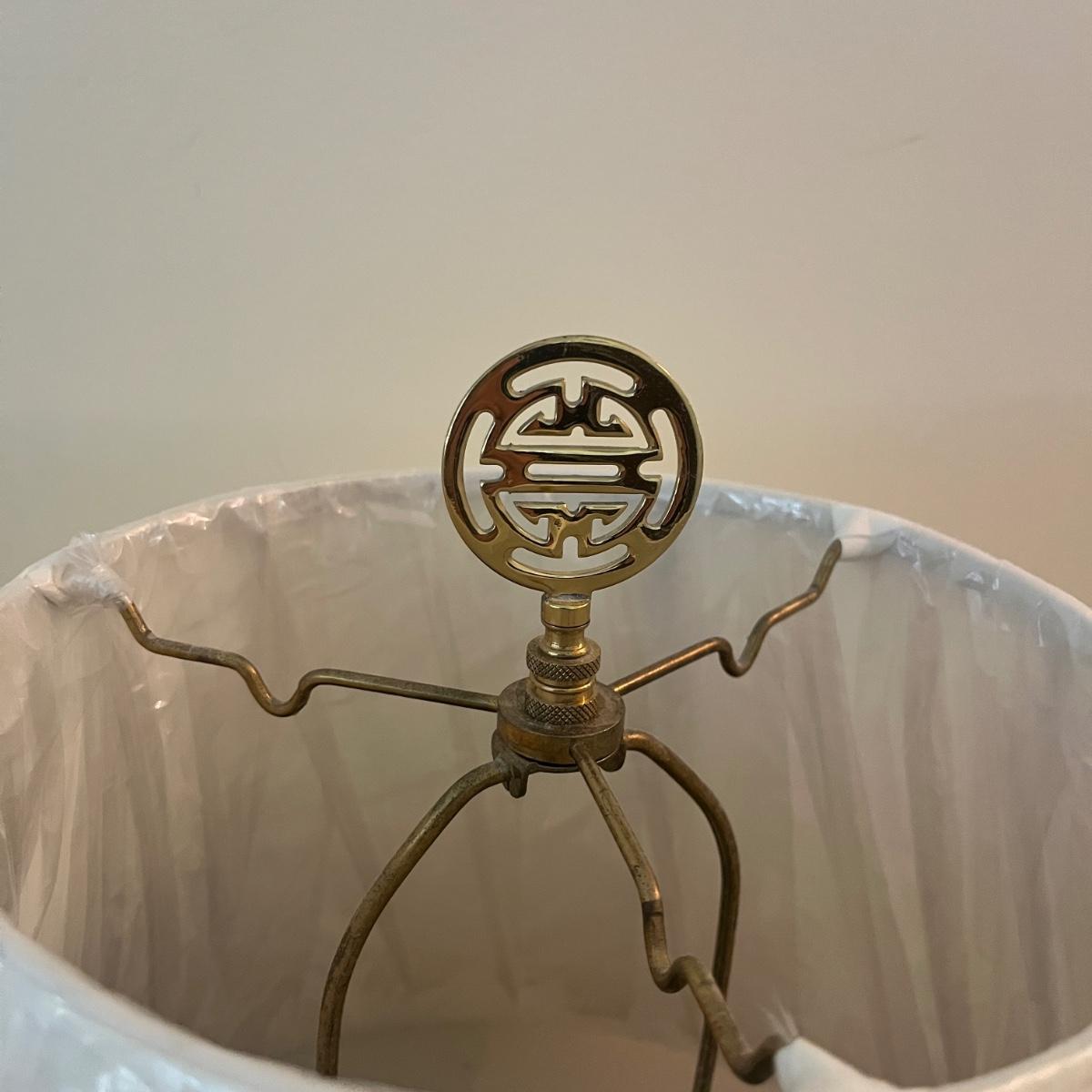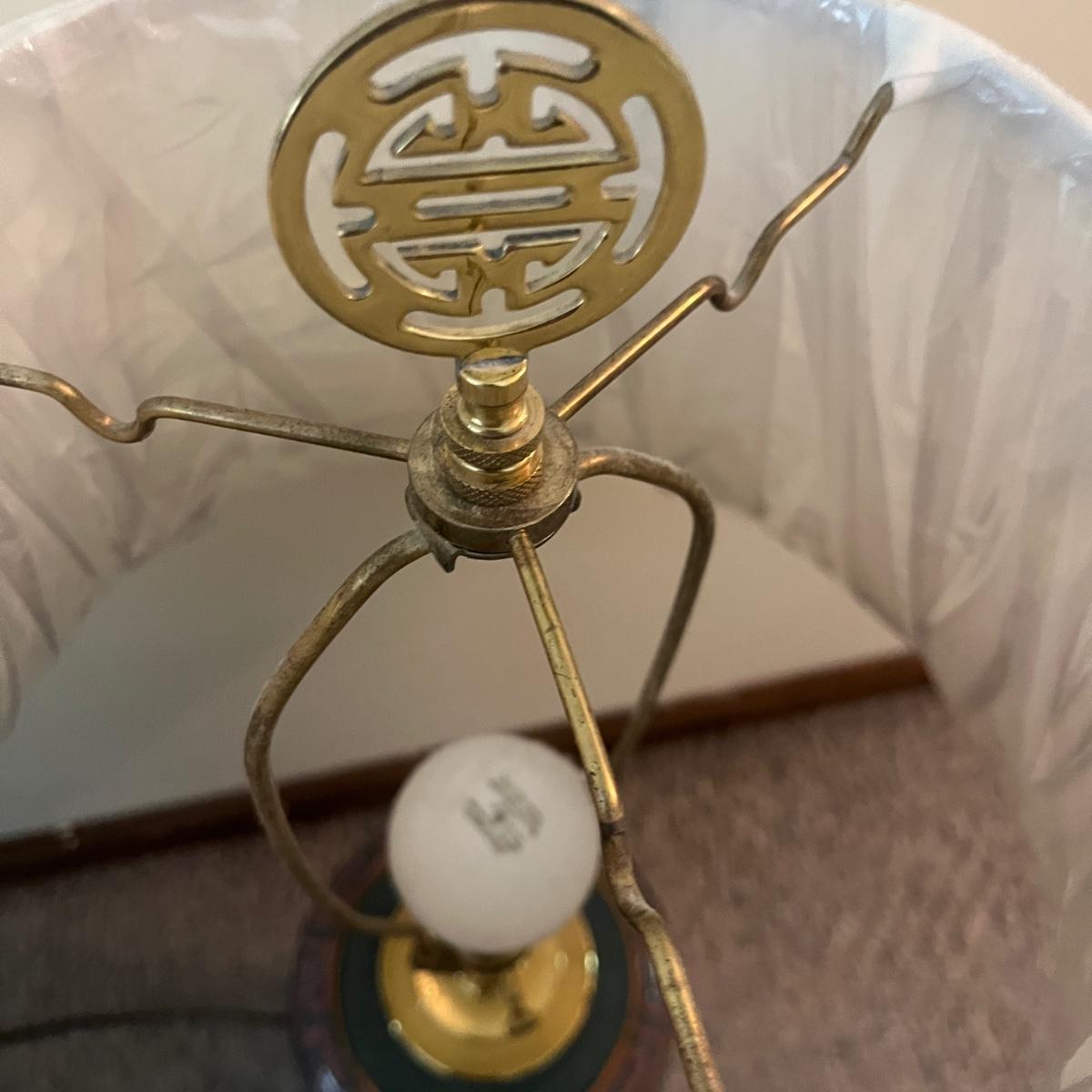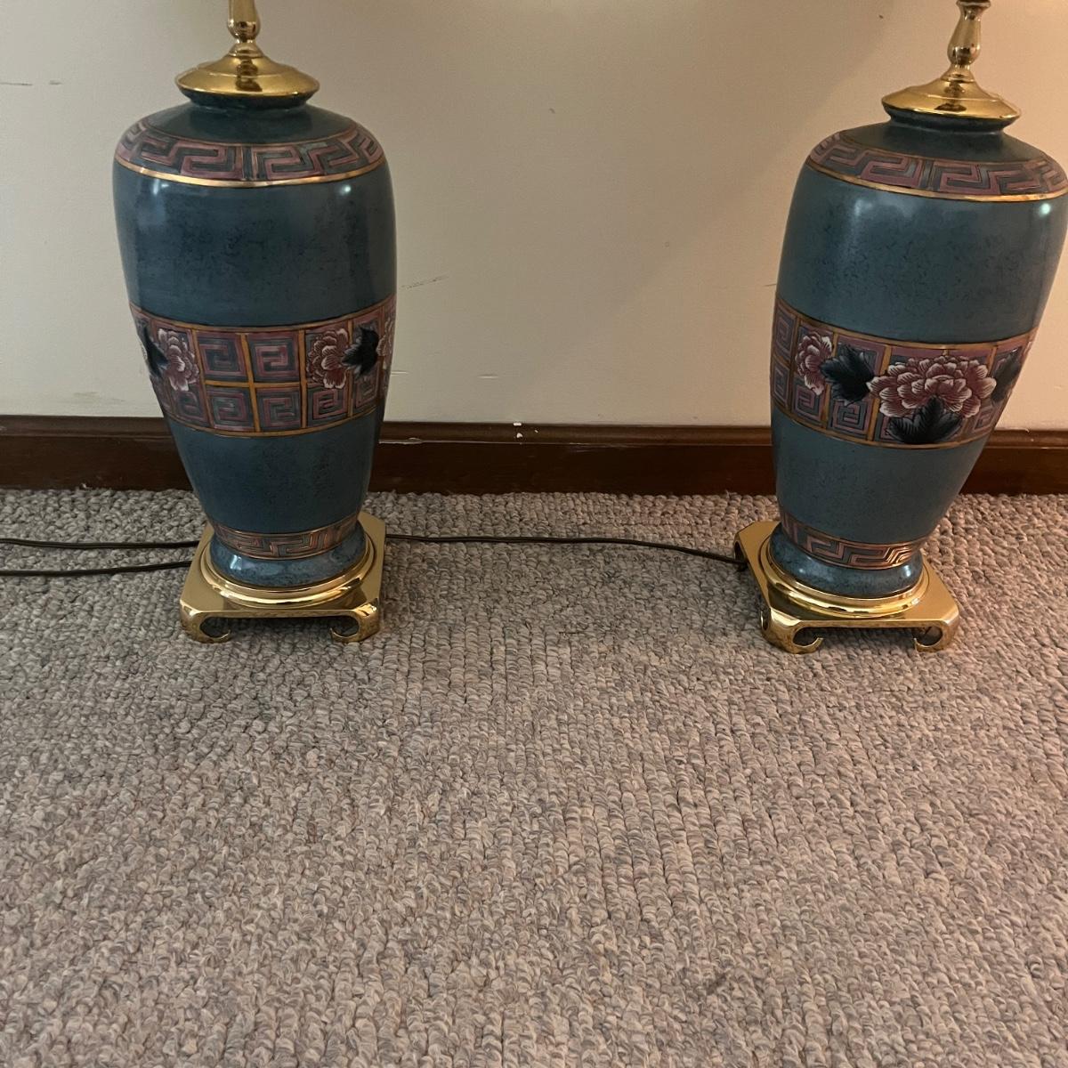 Lot includes two Asian style ceramic lamps with brass base and accents. Lamps measure 7”D x 34”H with 18”D shades.