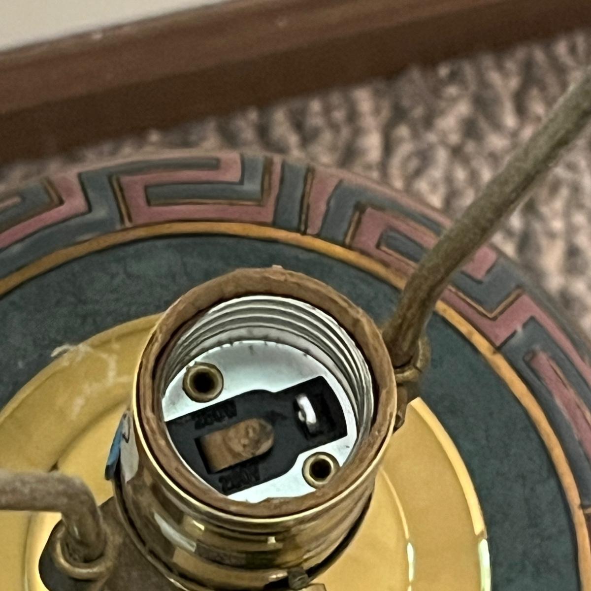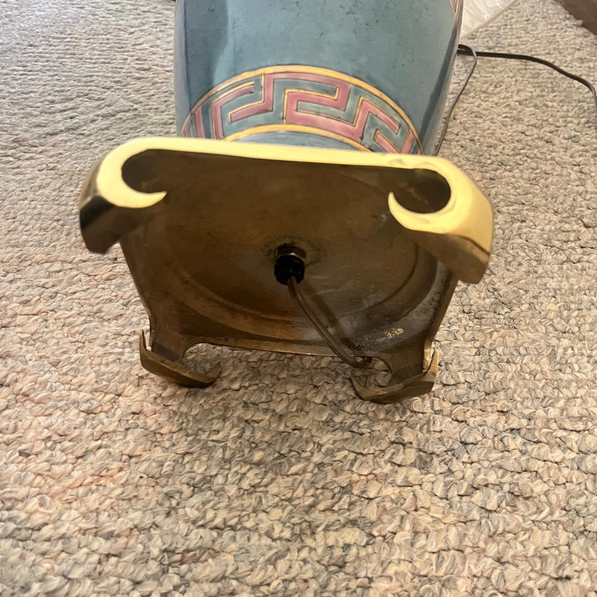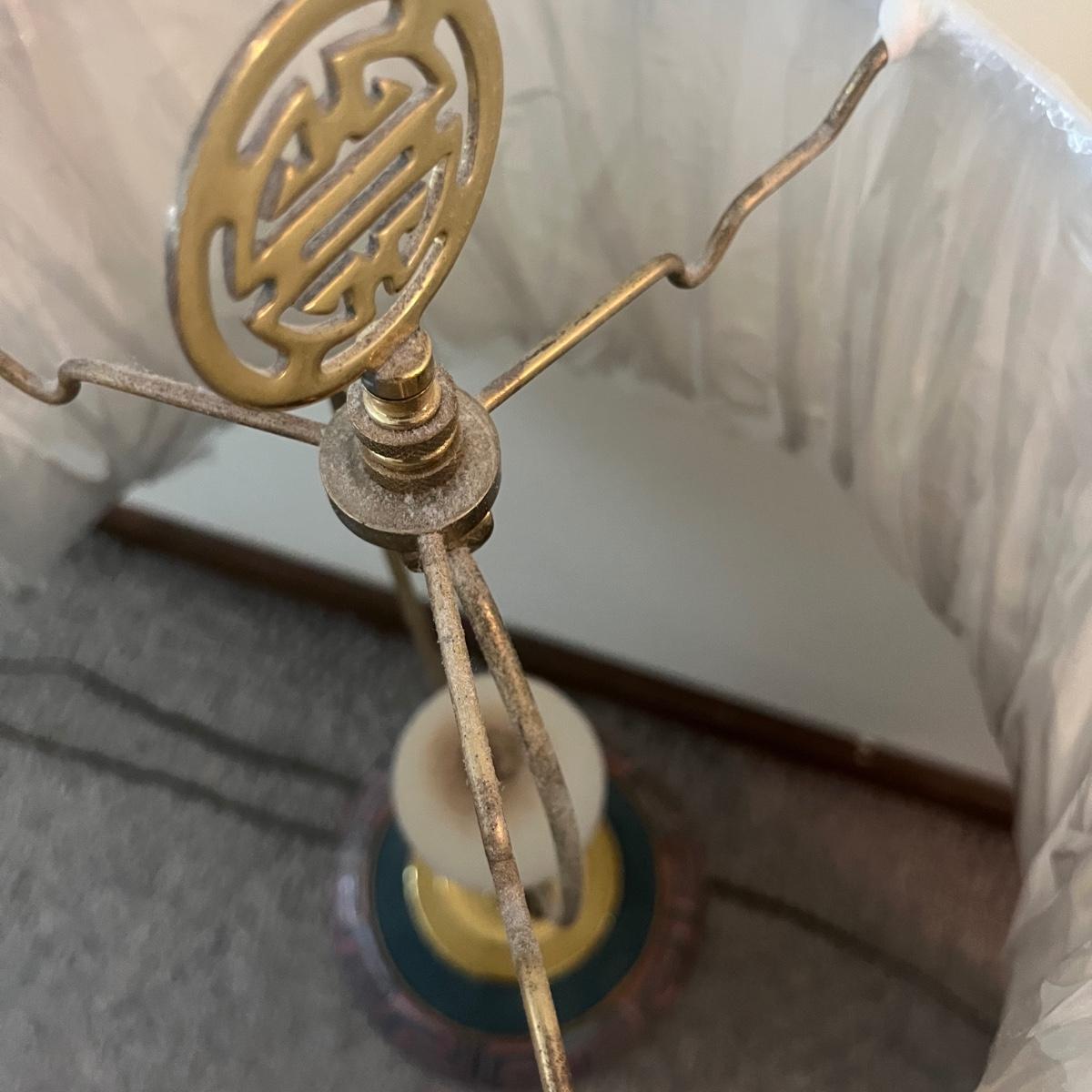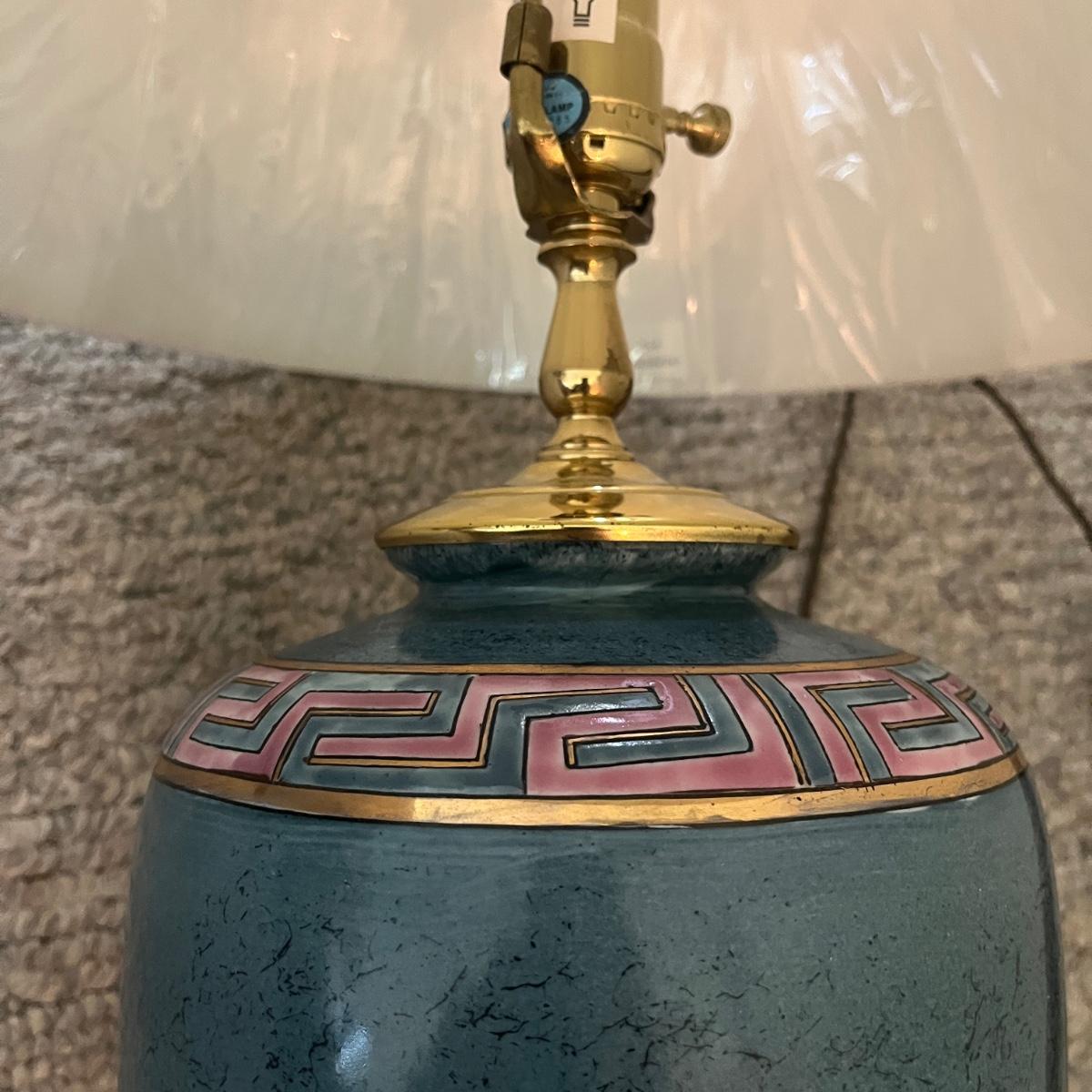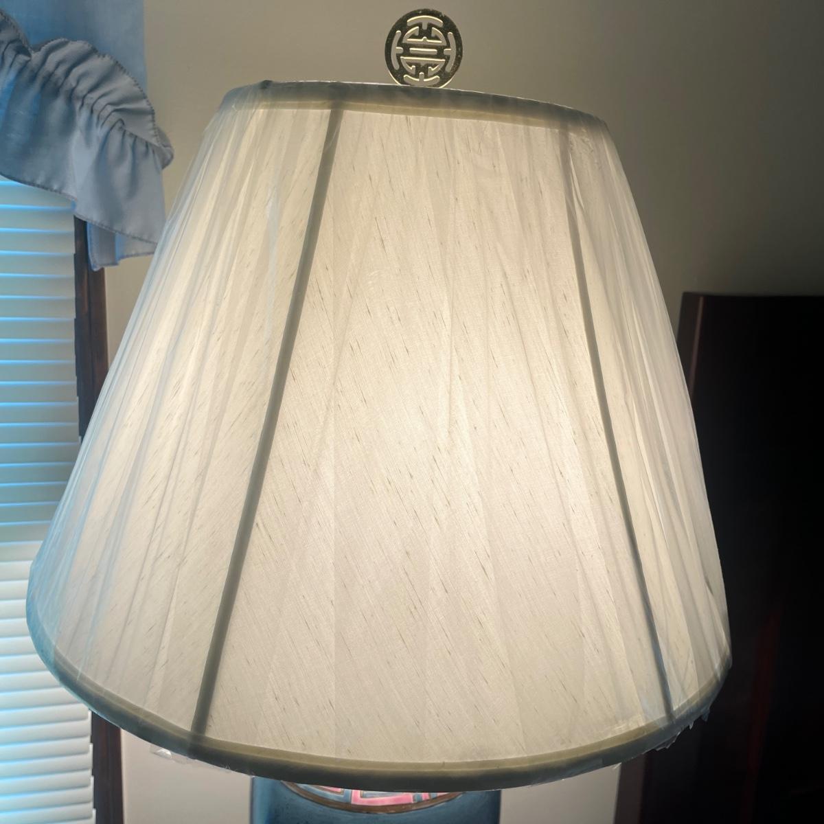 Lot includes two Asian style ceramic lamps with brass base and accents. Lamps measure 7”D x 34”H with 18”D shades.