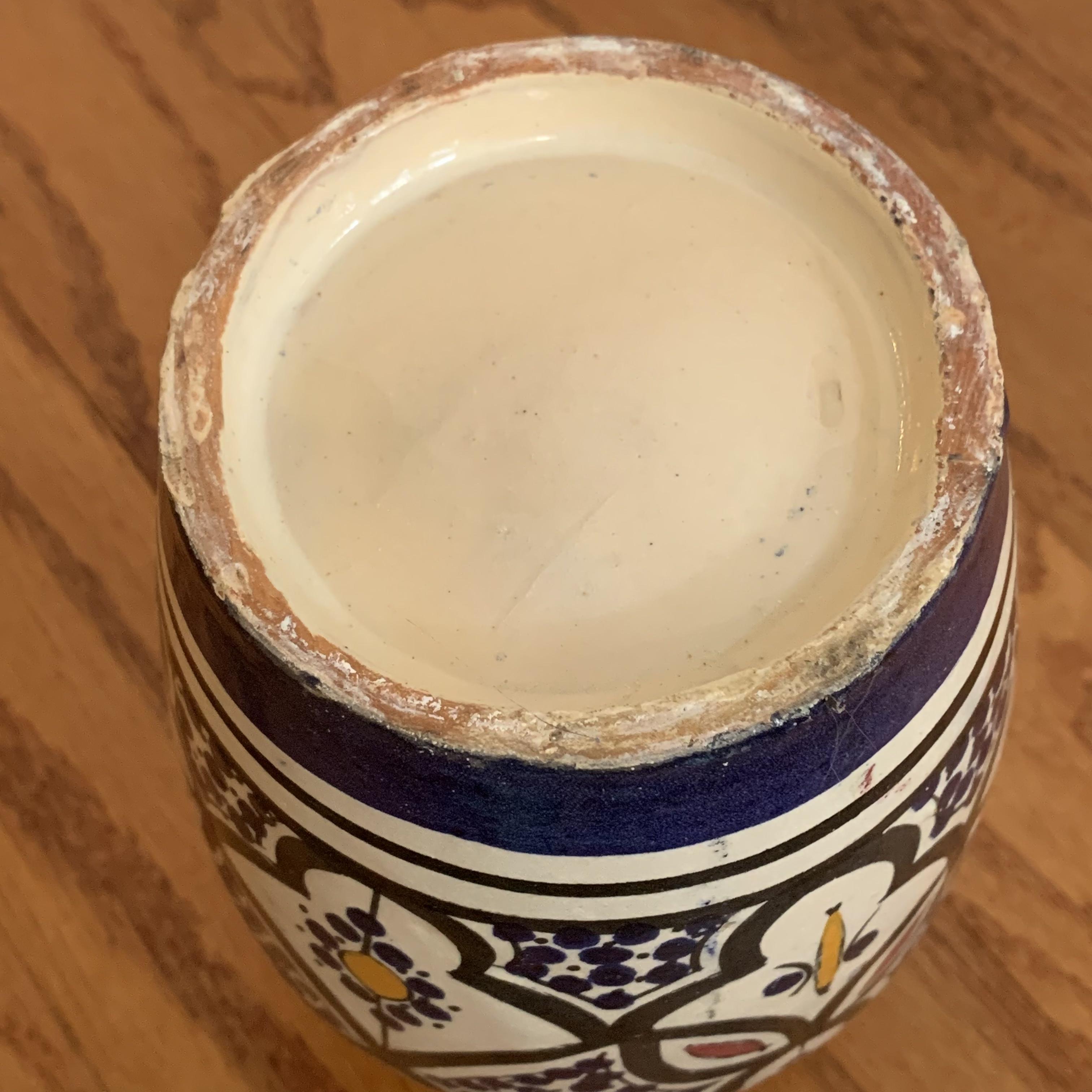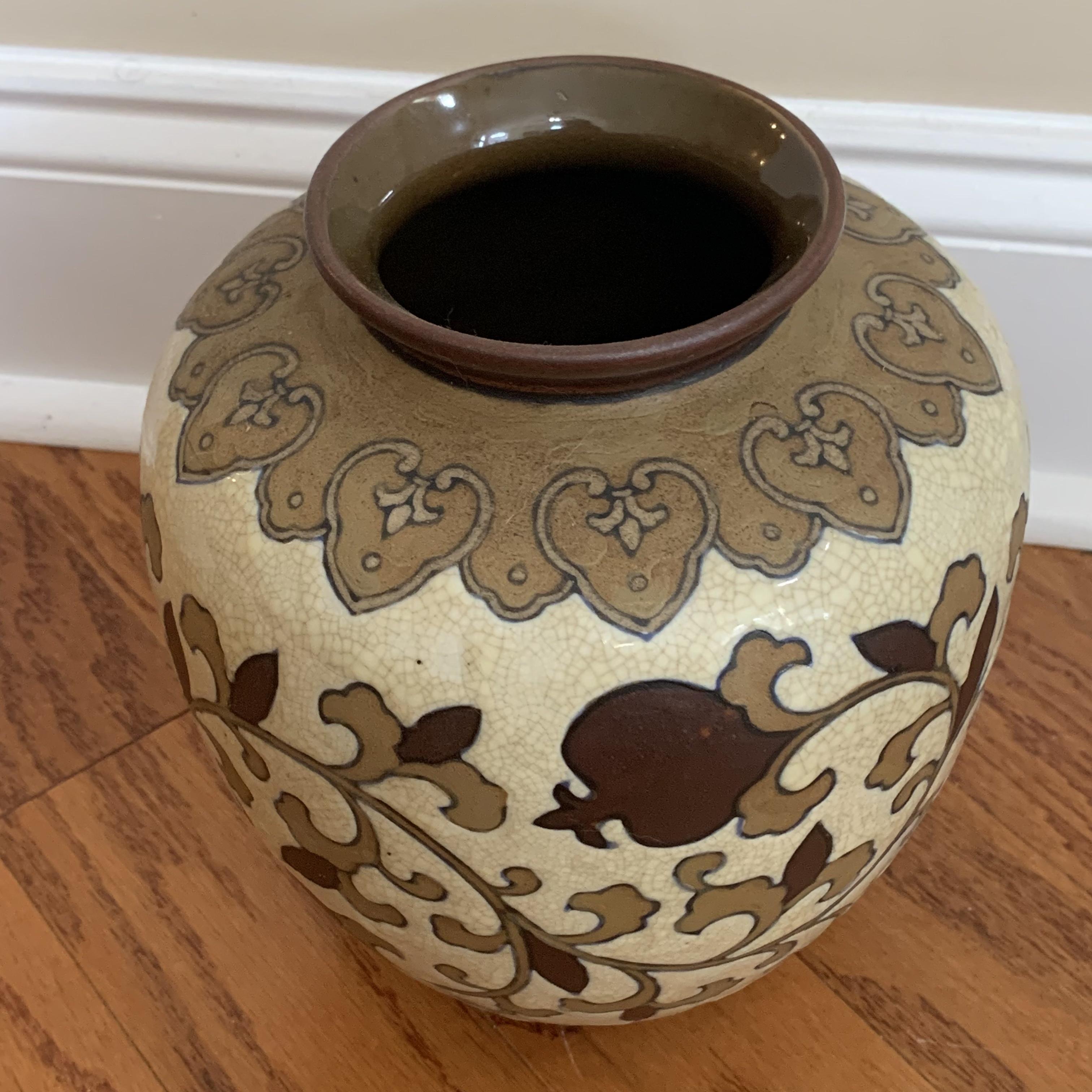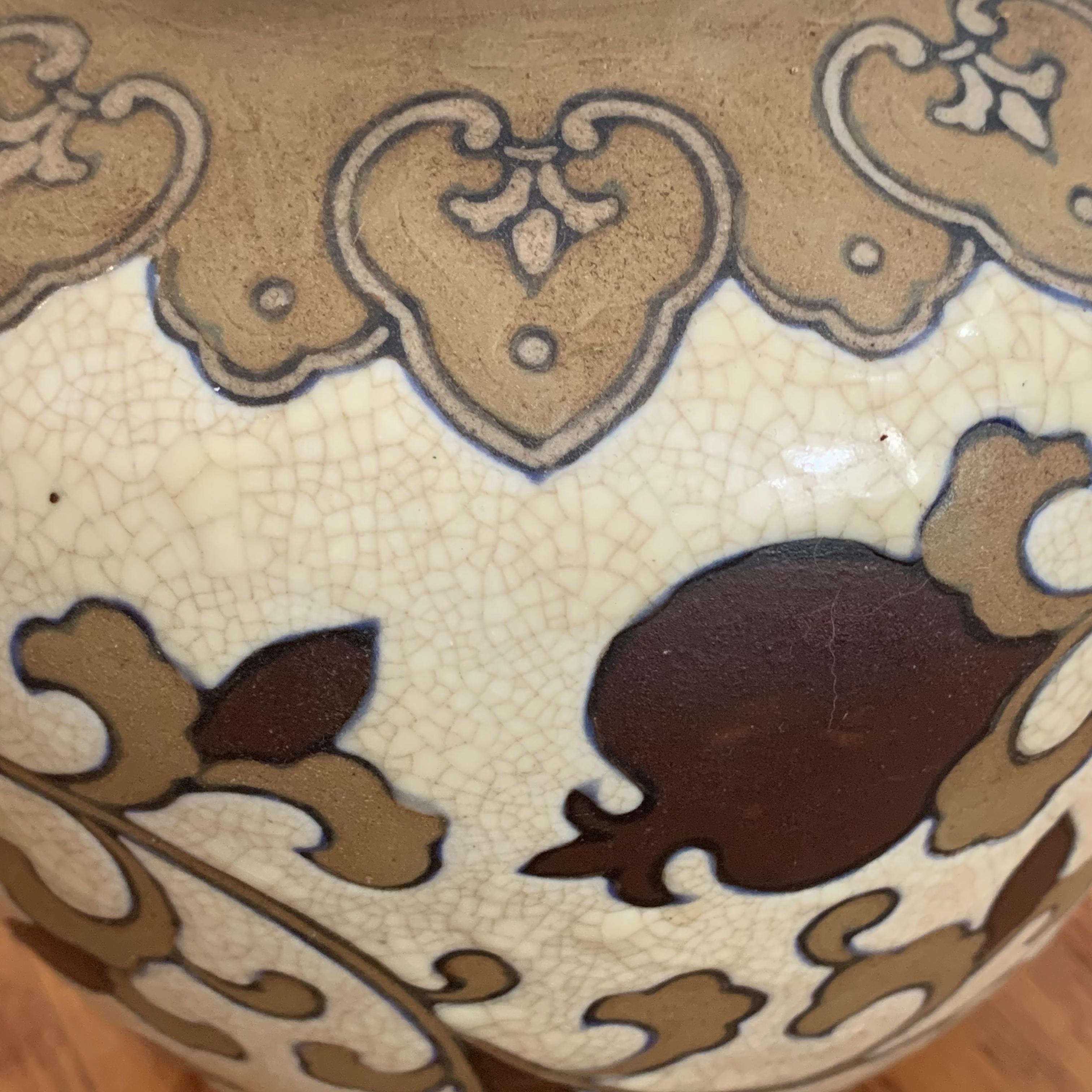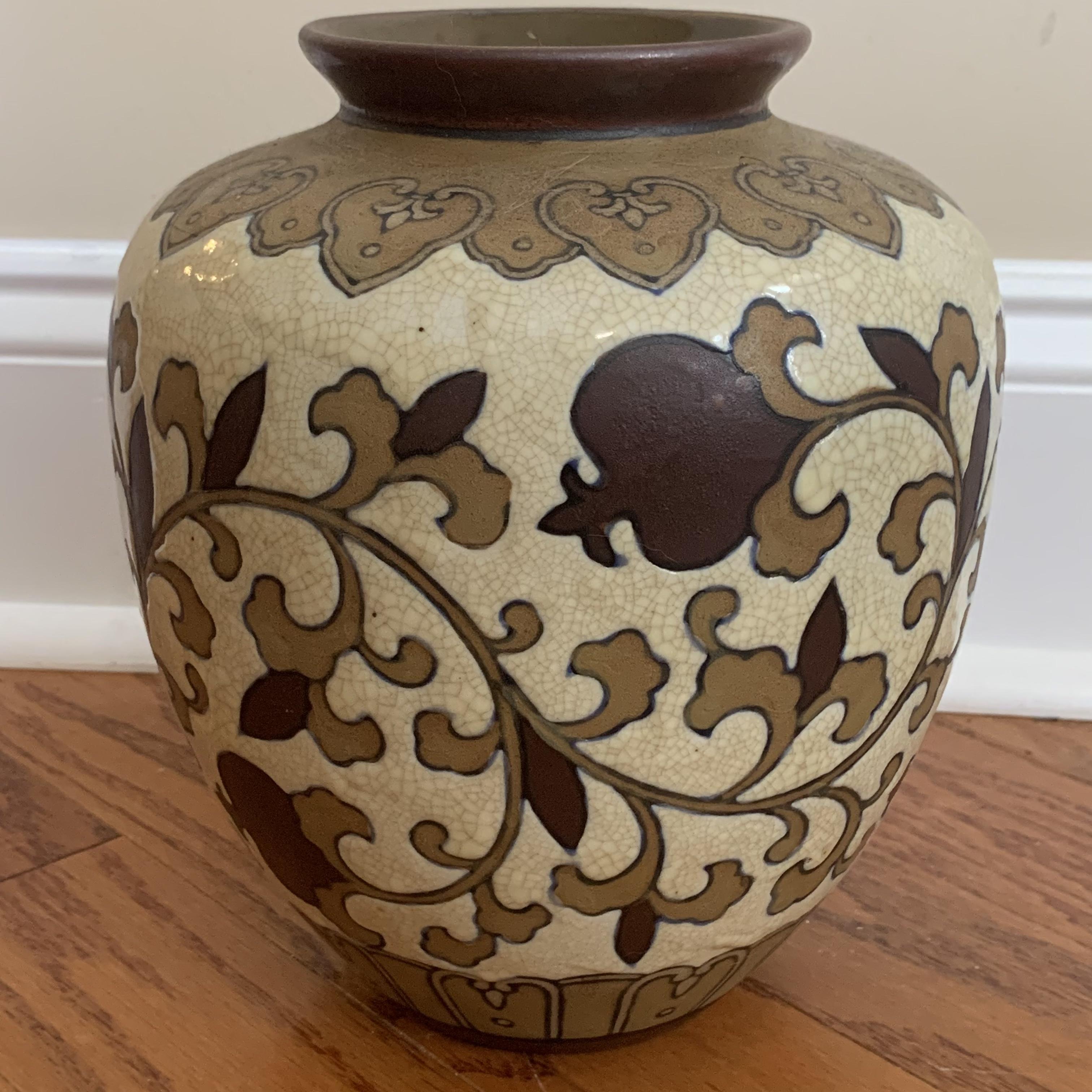 Two beautiful ceramic vases. The larger one is textured with a cream colored crazed base design. It is about 8”D at its widest point and 9” tall. The smaller vase is smooth and appears to be hand painted.