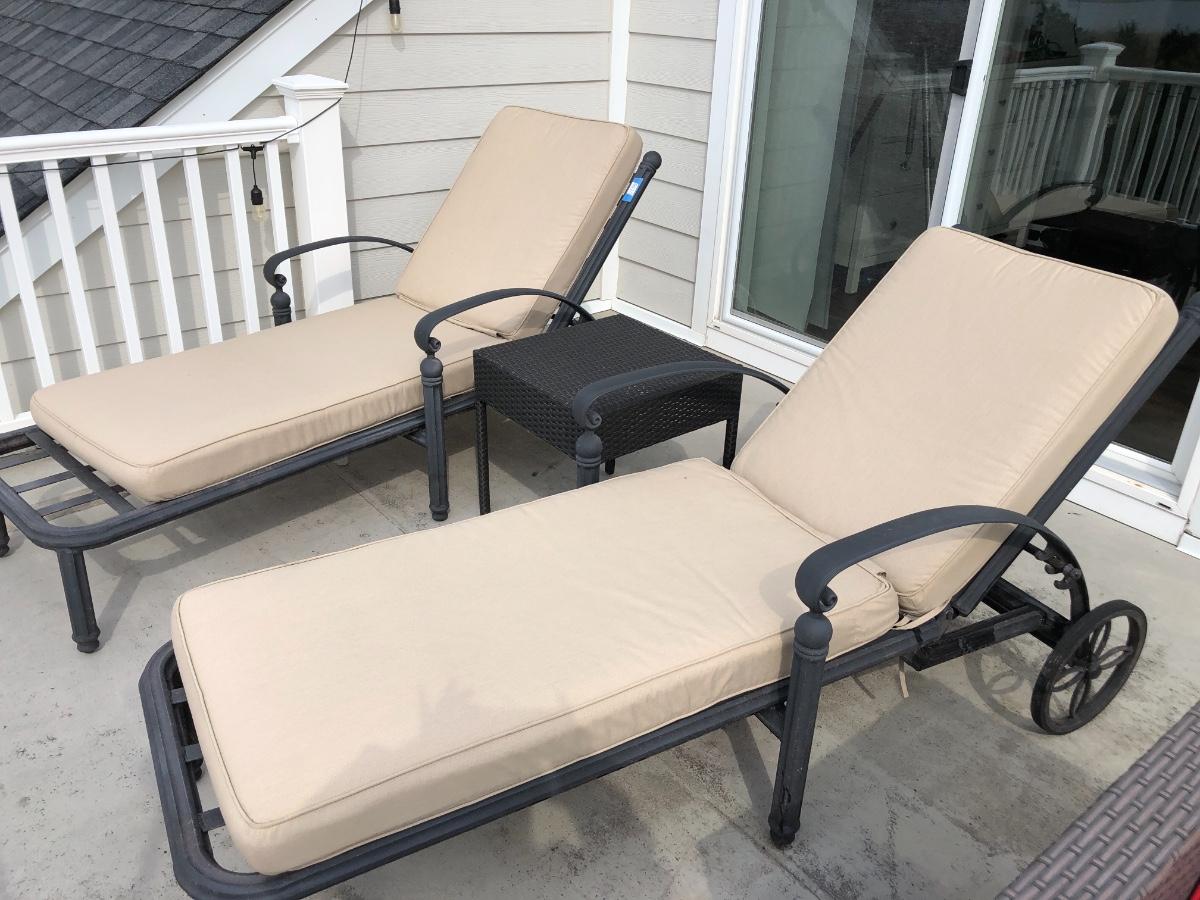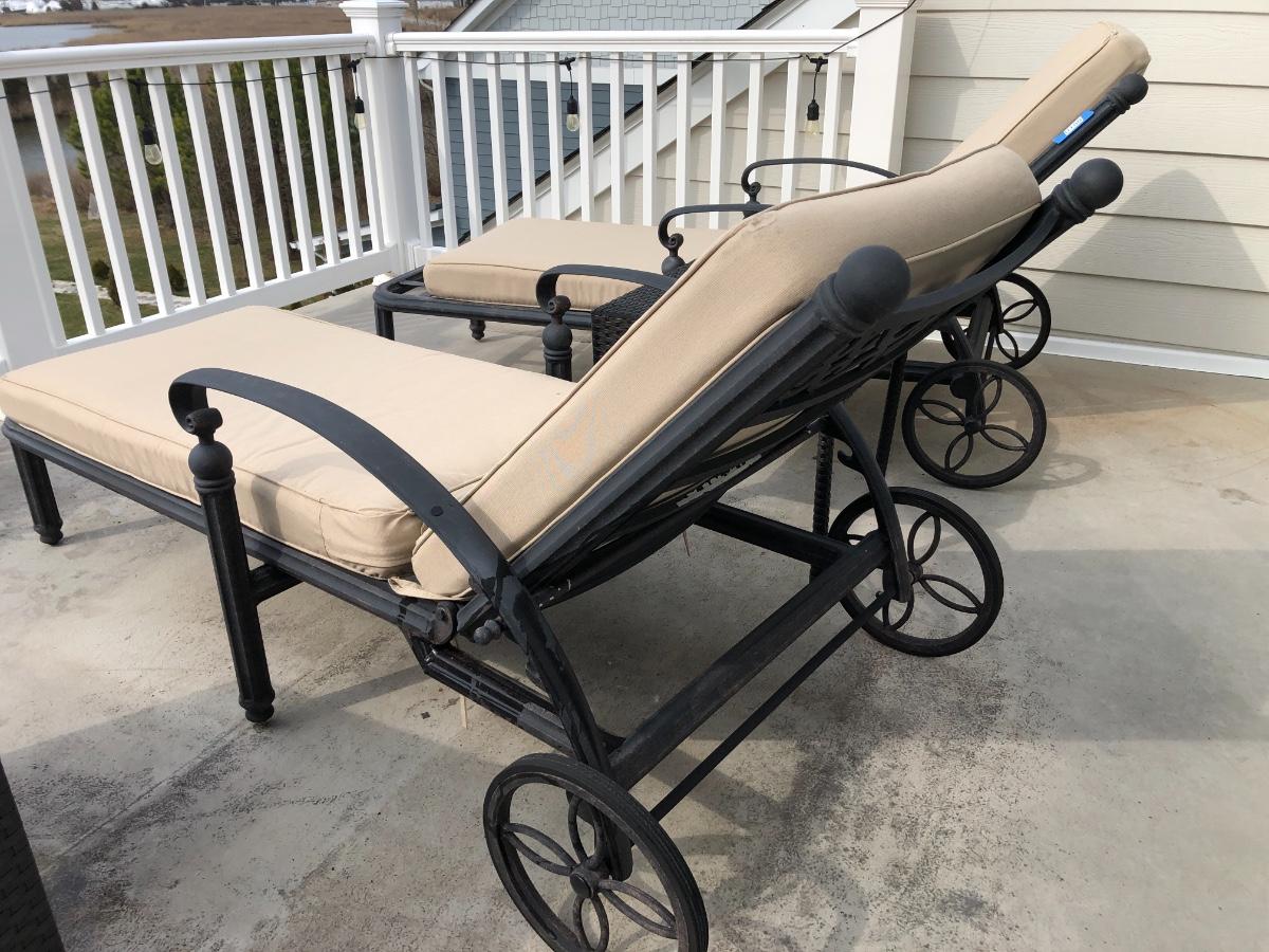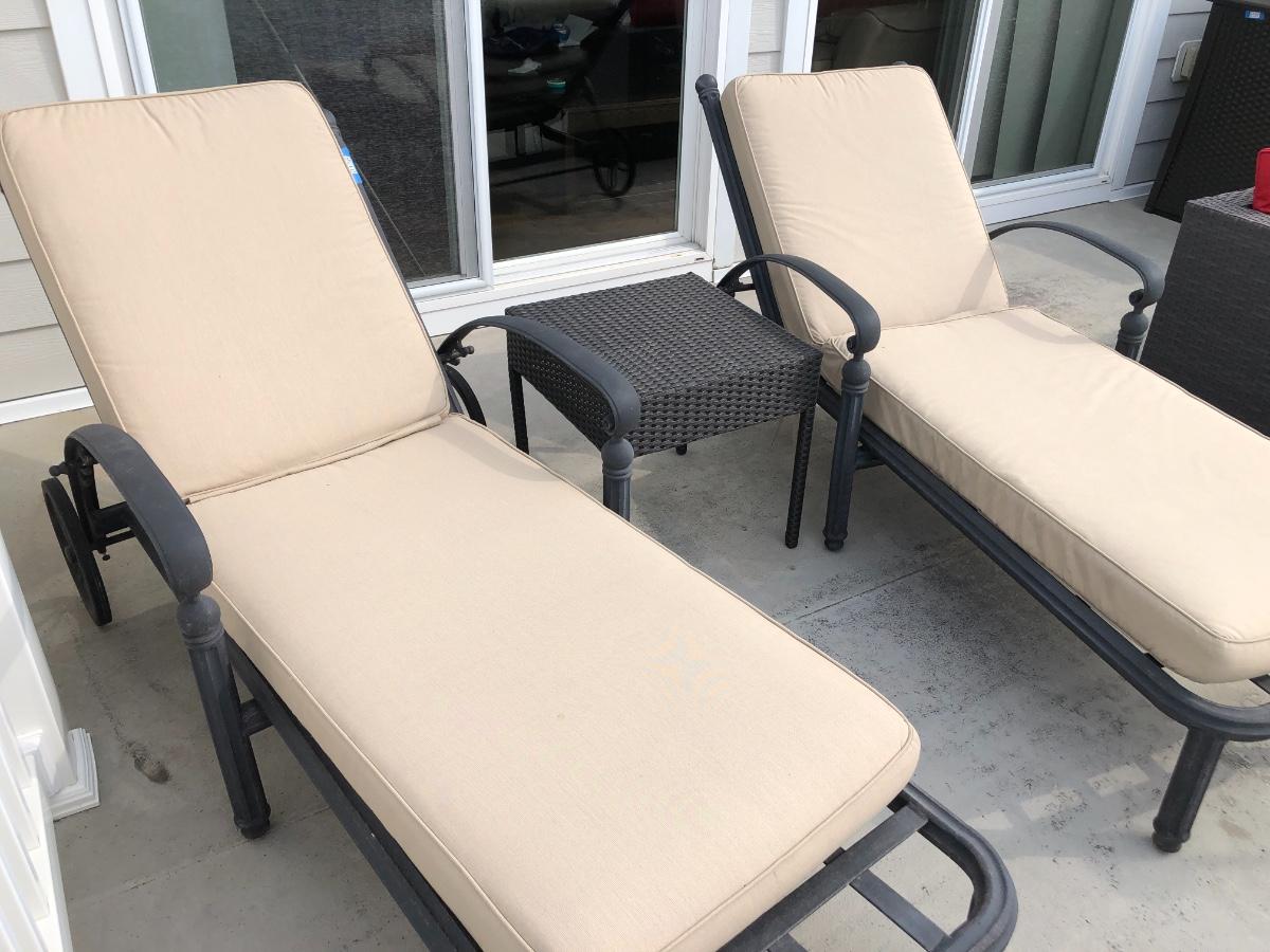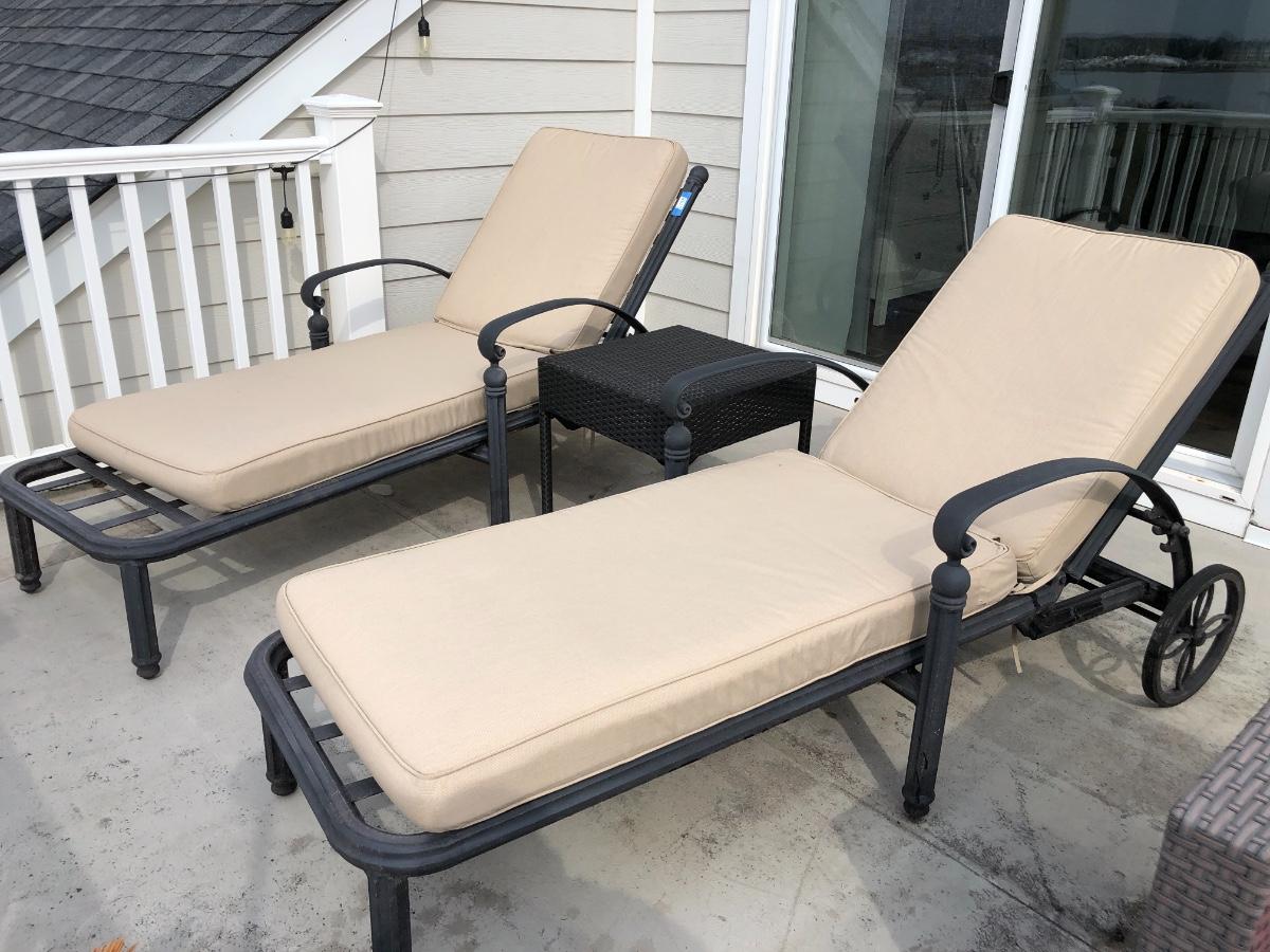 Two Chaise Outdoor Lounge Chairs w/ Frontgate Cushions and Table