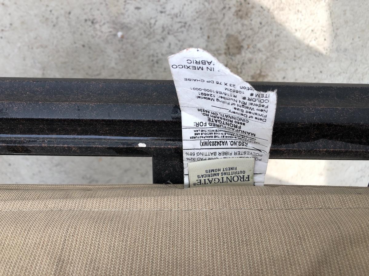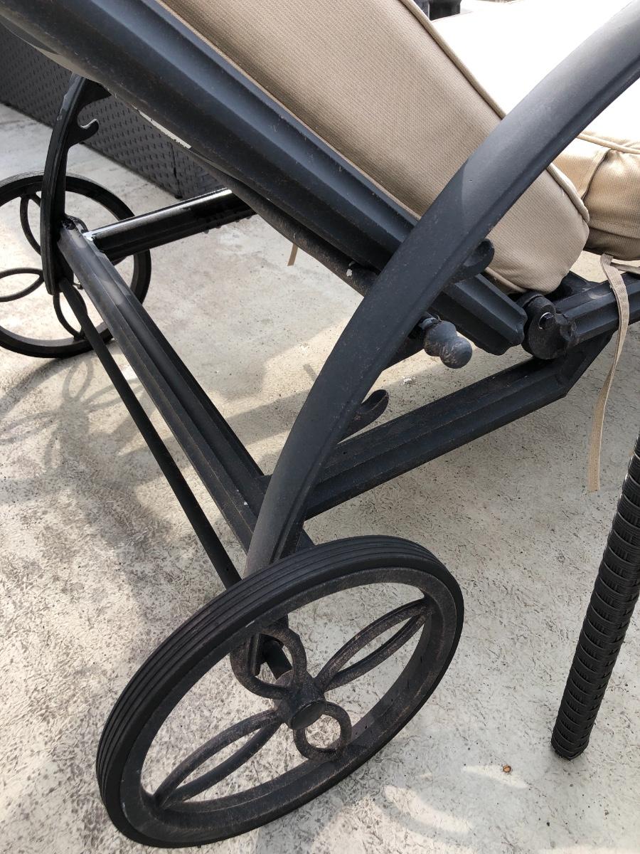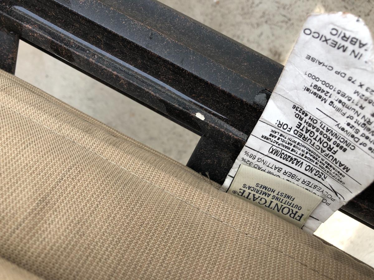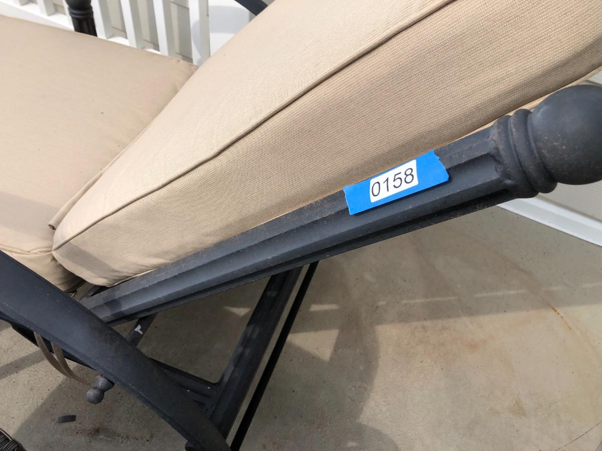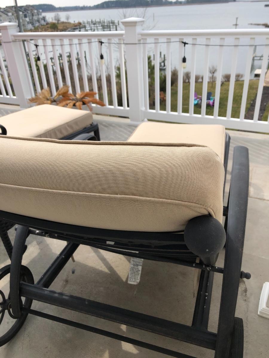 Two Chaise Outdoor Lounge Chairs w/ Frontgate Cushions and Table