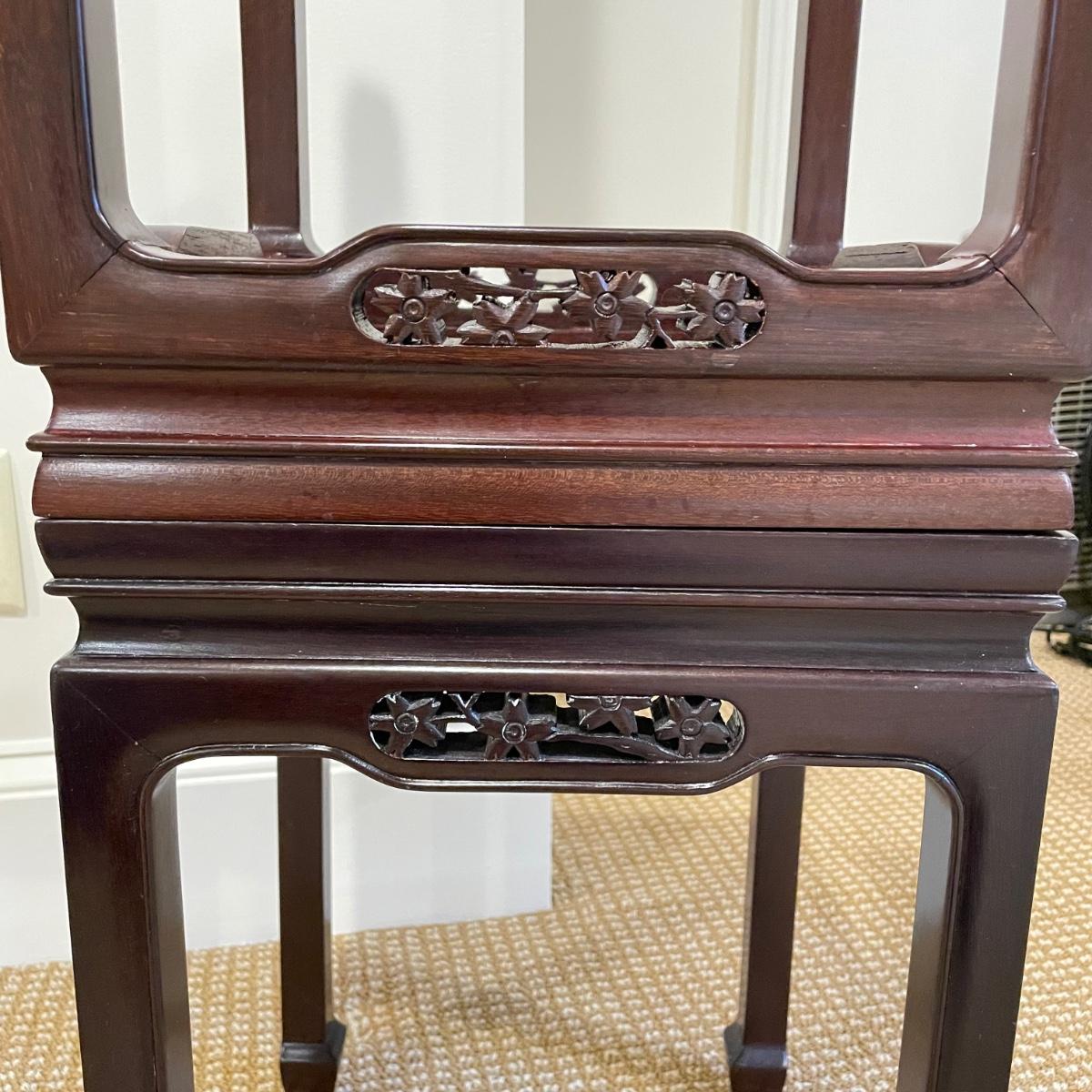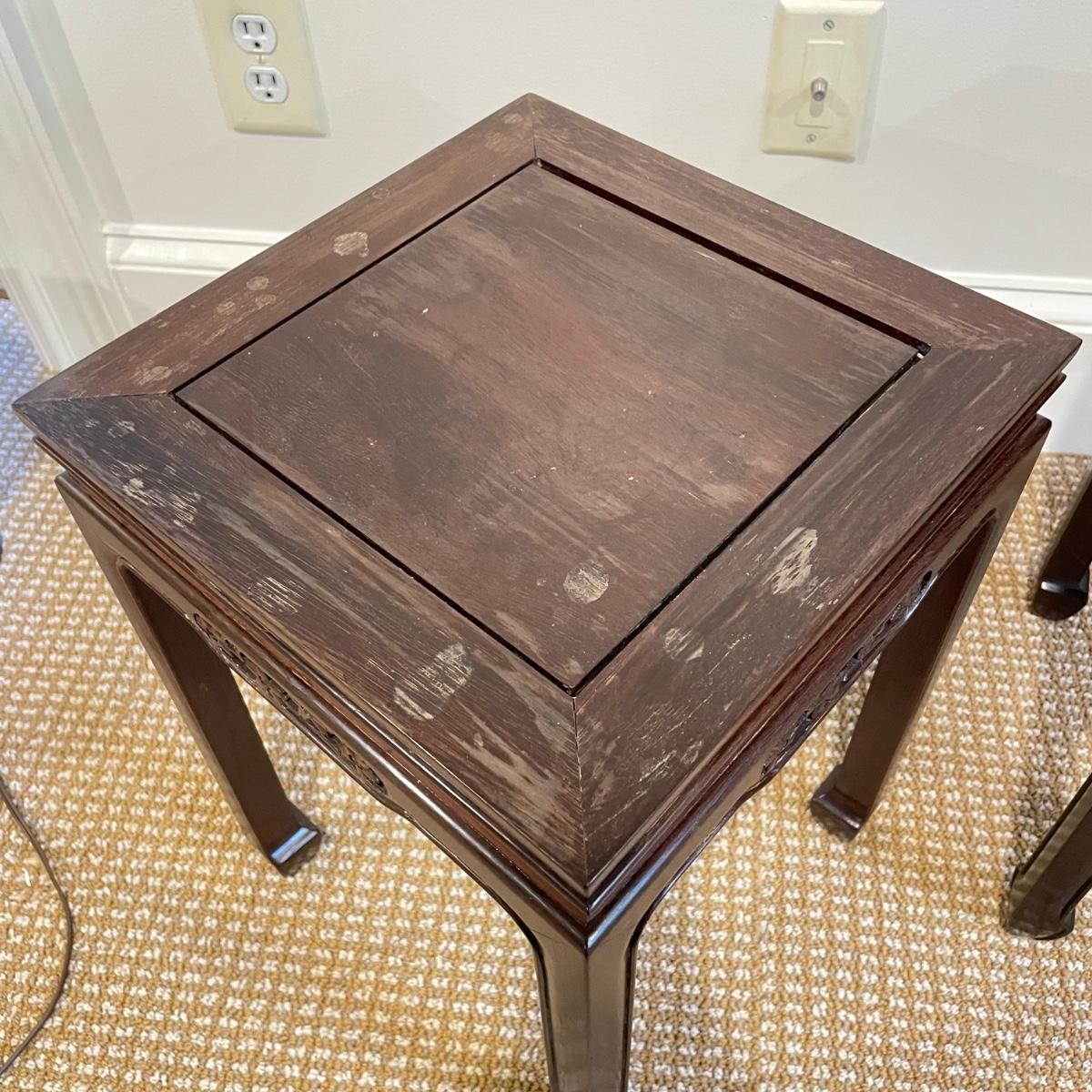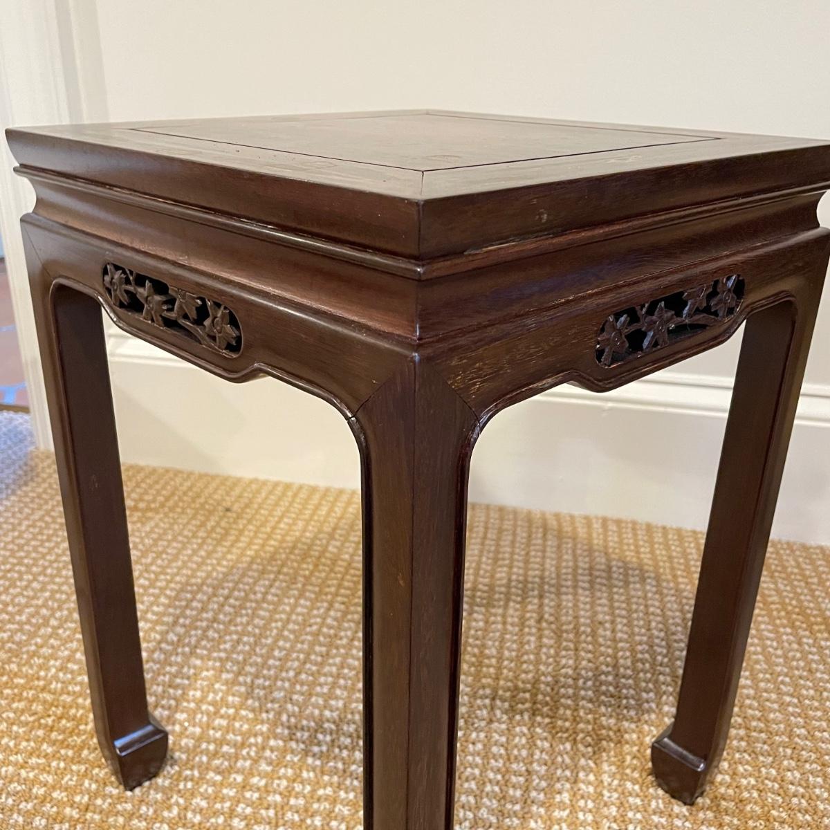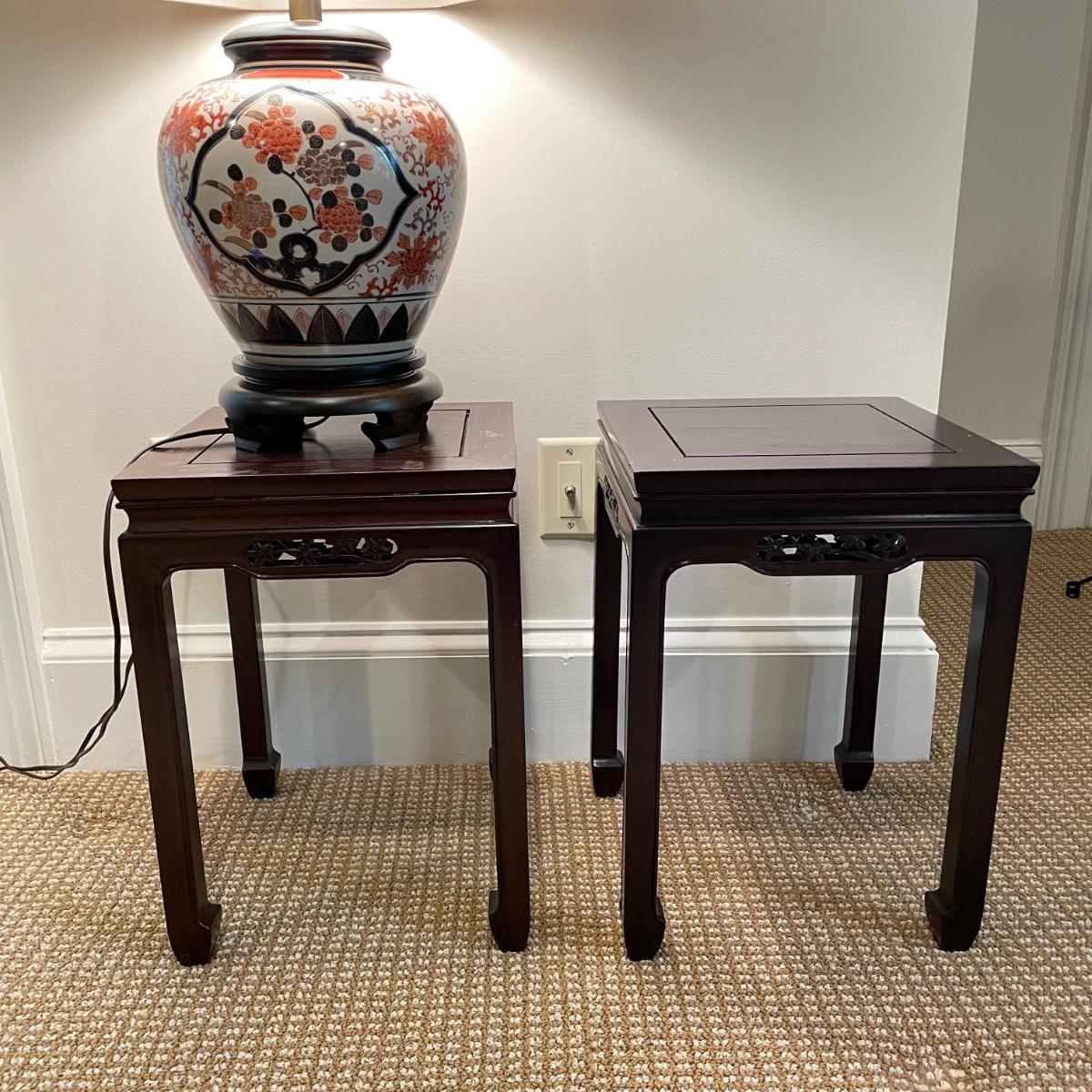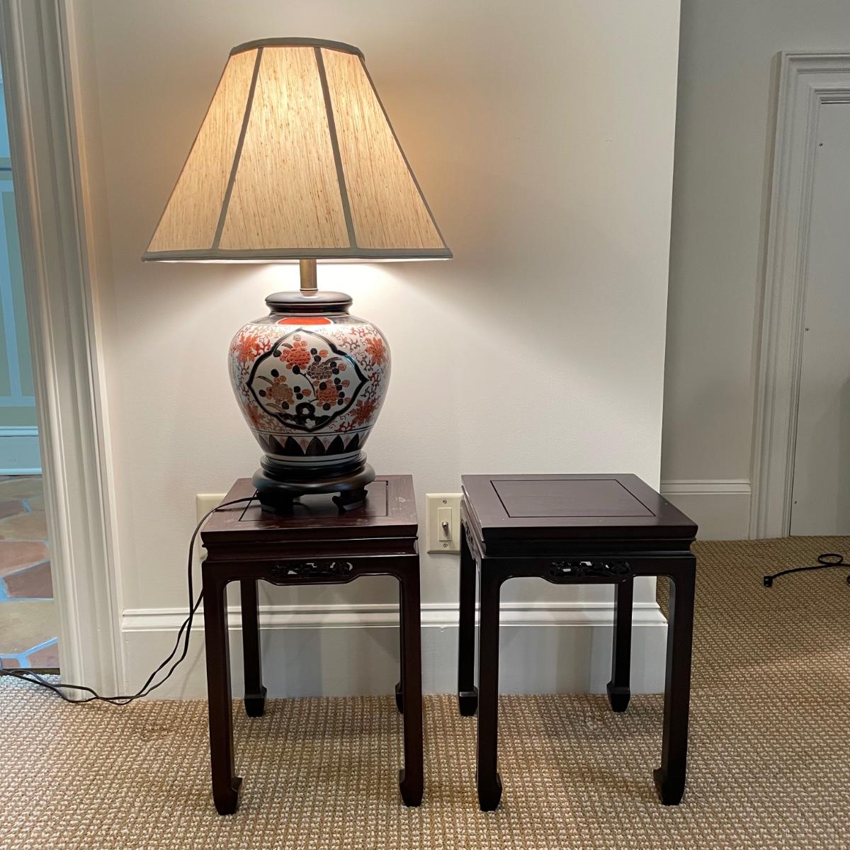Two solid wood small tables with cherry blossoms carved on all four sides. One table shows more wear on top and it’s a slightly lighter/warmer brown wood stain. The lamp appears to be hand painted porcelain with wood feet and jar top. Lamp has a unique finial and its shade is nice and clean. Lamp turned on when plugged in, it has a 3-way switch, it’s finial stands at 27”H. Tables are each the same size, measuring 12”sq x 16”H. See images. Local pick up only.