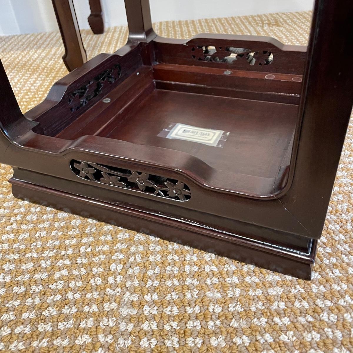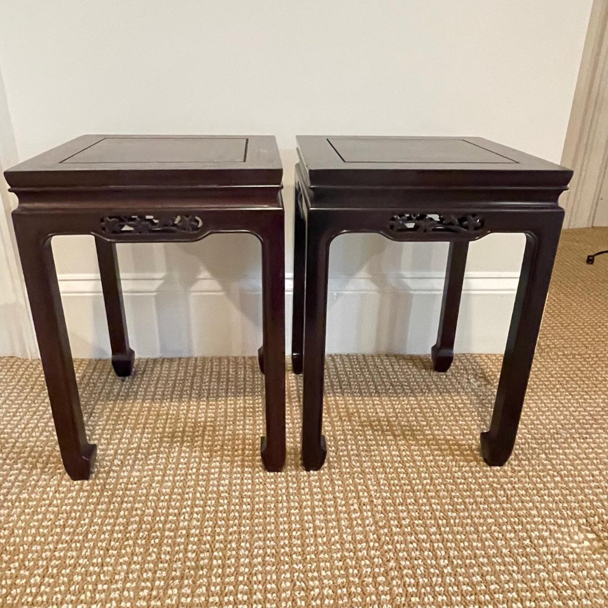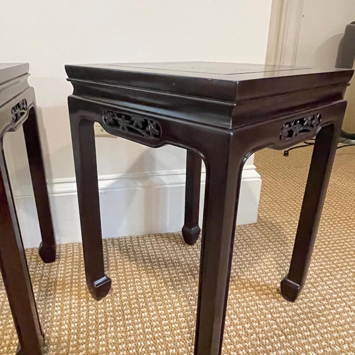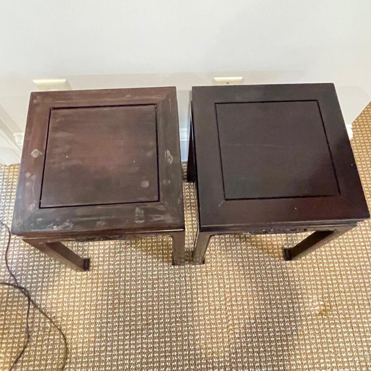 Two solid wood small tables with cherry blossoms carved on all four sides. One table shows more wear on top and it’s a slightly lighter/warmer brown wood stain. The lamp appears to be hand painted porcelain with wood feet and jar top. Lamp has a unique finial and its shade is nice and clean. Lamp turned on when plugged in, it has a 3-way switch, it’s finial stands at 27”H. Tables are each the same size, measuring 12”sq x 16”H. See images. Local pick up only.
