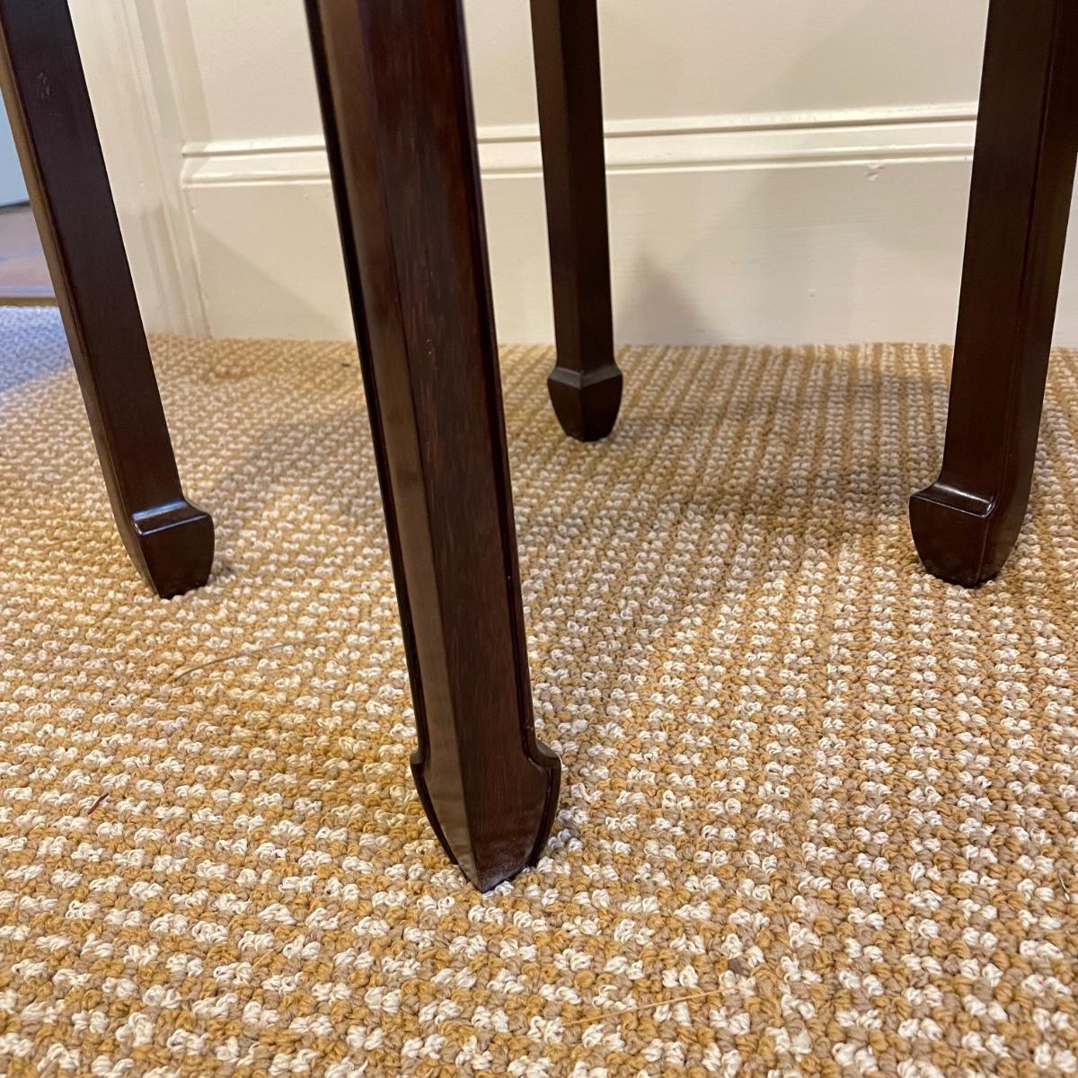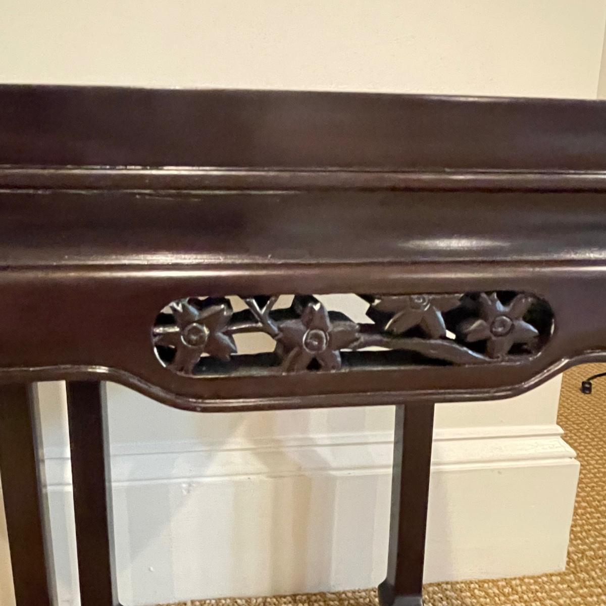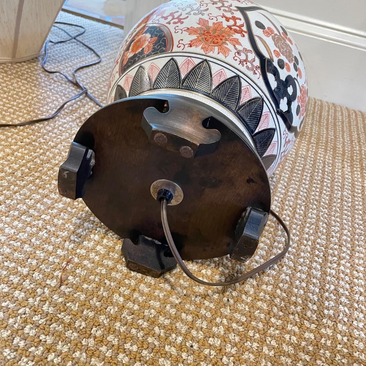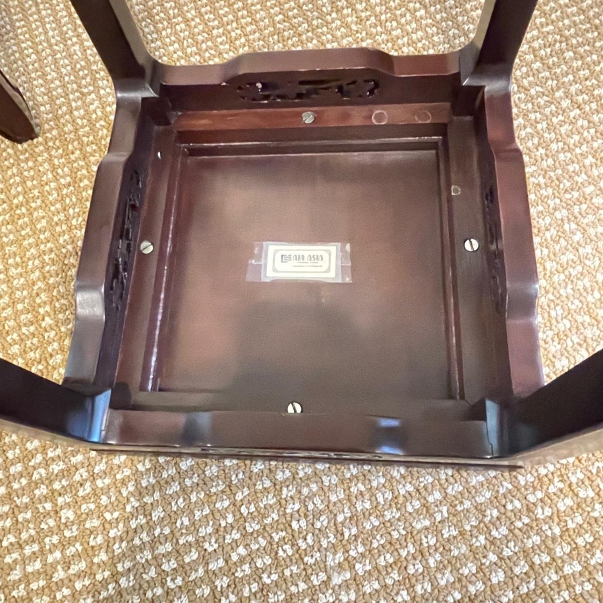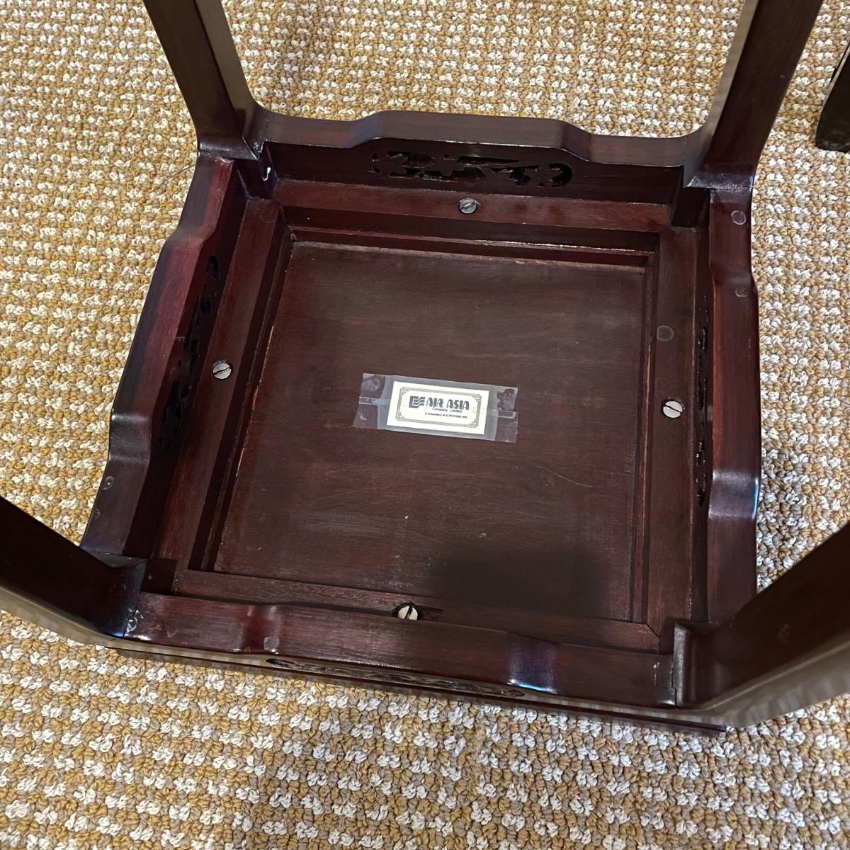 Two solid wood small tables with cherry blossoms carved on all four sides. One table shows more wear on top and it’s a slightly lighter/warmer brown wood stain. The lamp appears to be hand painted porcelain with wood feet and jar top. Lamp has a unique finial and its shade is nice and clean. Lamp turned on when plugged in, it has a 3-way switch, it’s finial stands at 27”H. Tables are each the same size, measuring 12”sq x 16”H. See images. Local pick up only.