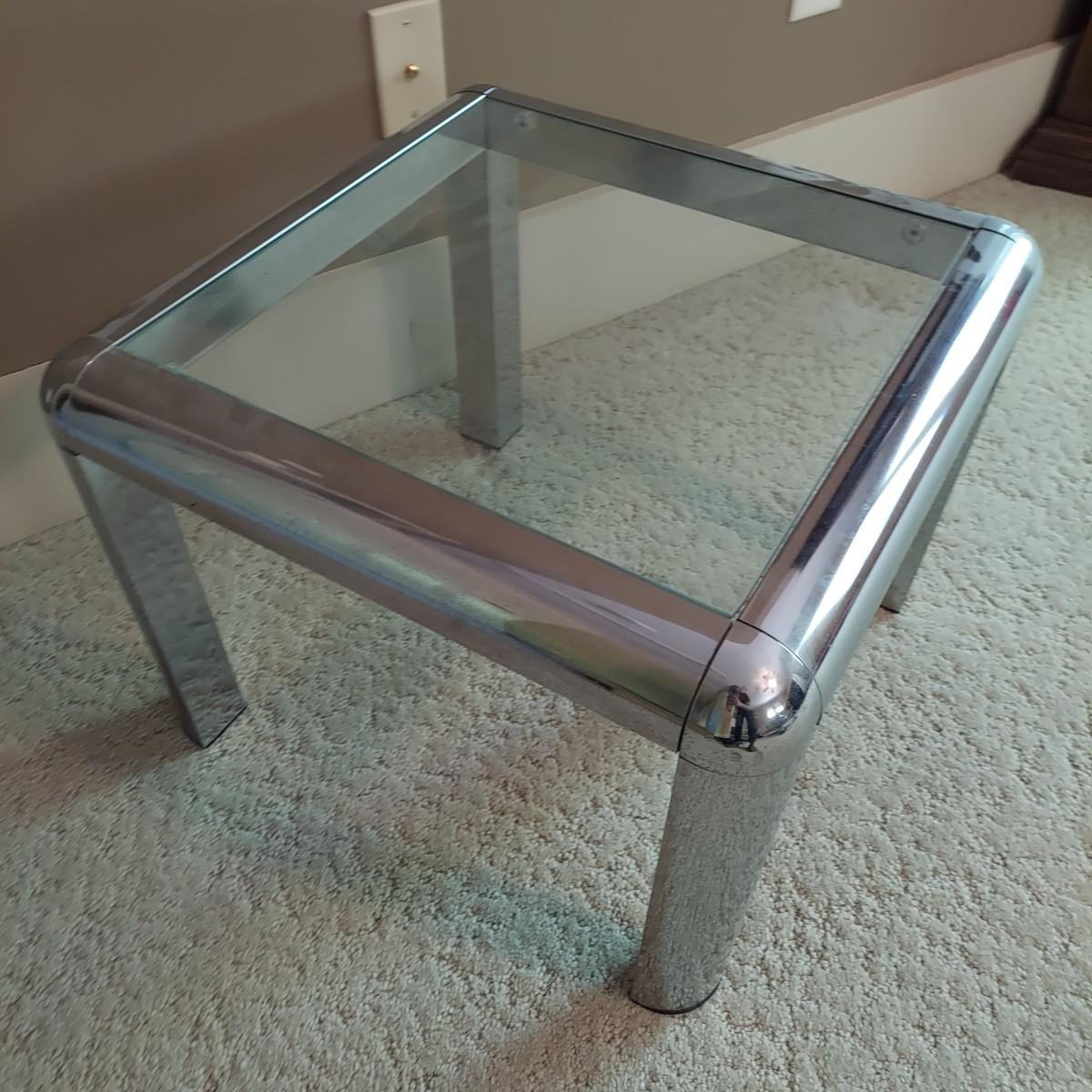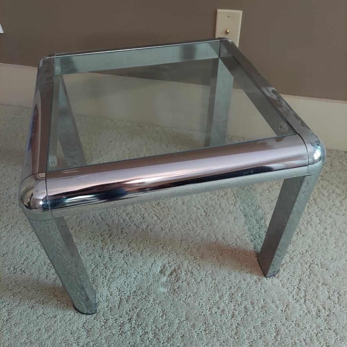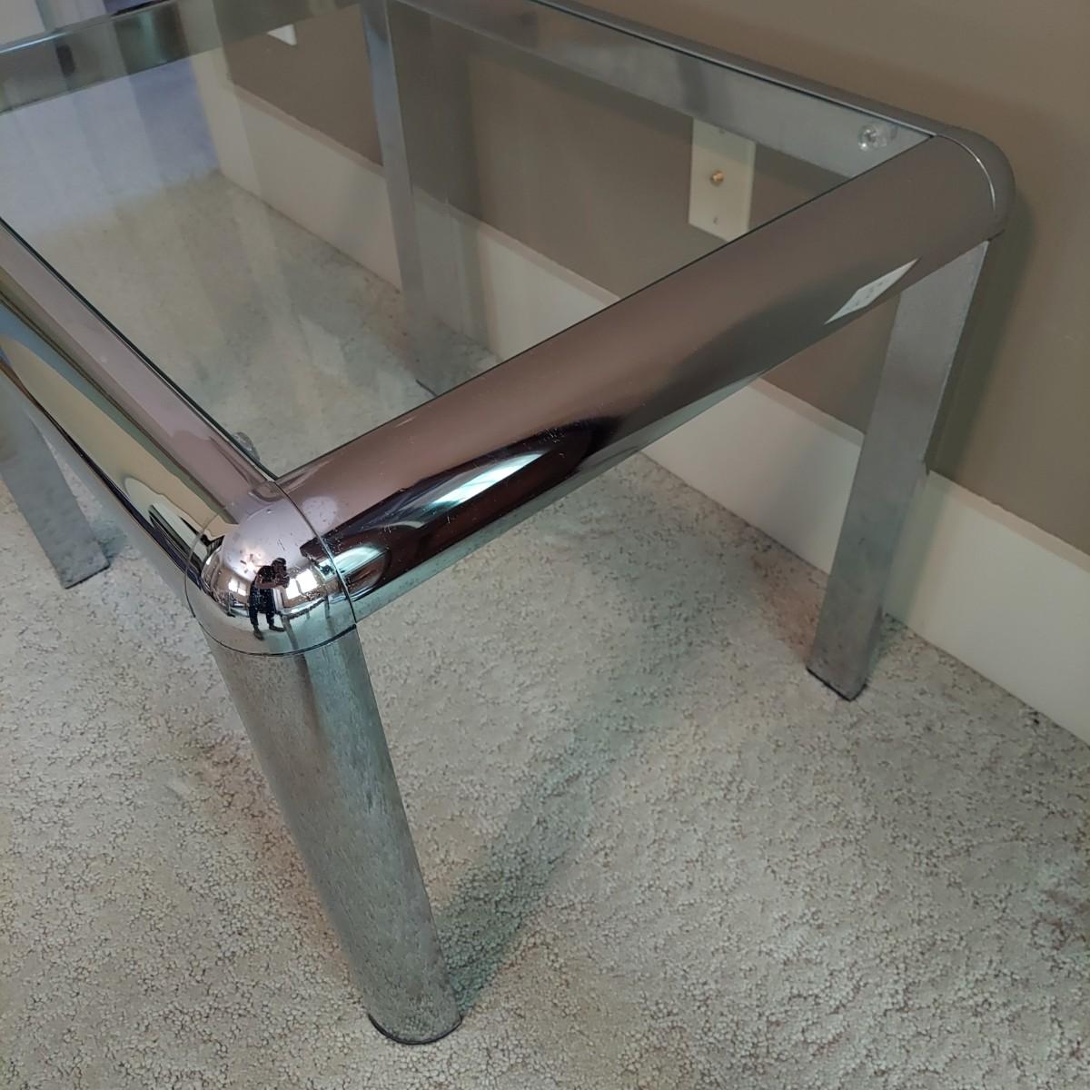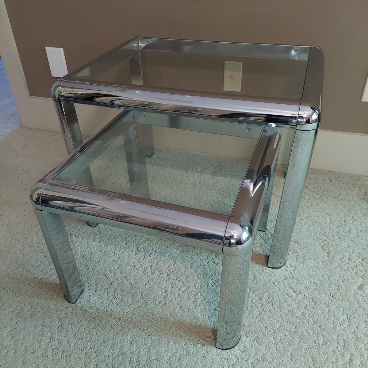Two modern style chrome and glass side tables. One stacks over the other. They appear to be vintage based on the overall build but there are no visible makers' marks. Small table is approximately 20" x 20" x 15"H. The large table is approximately 28" x 22" x 20"H. There is some rust speckle on the chrome. Local Pickup Only.