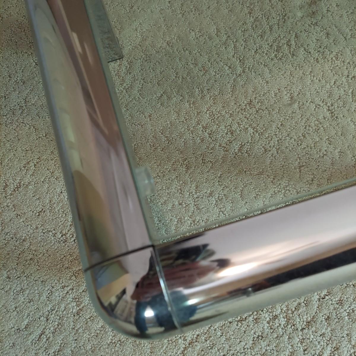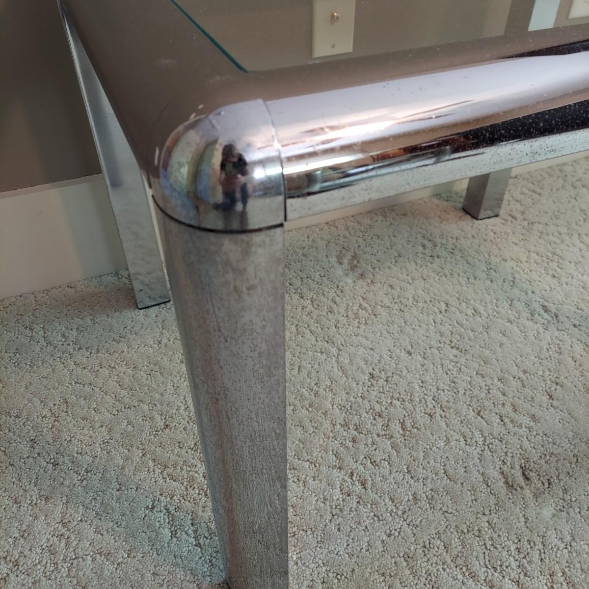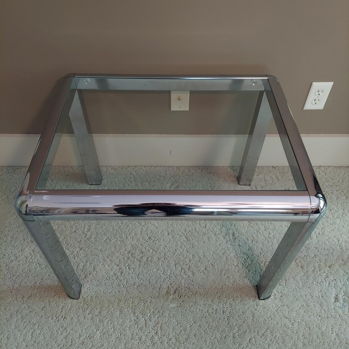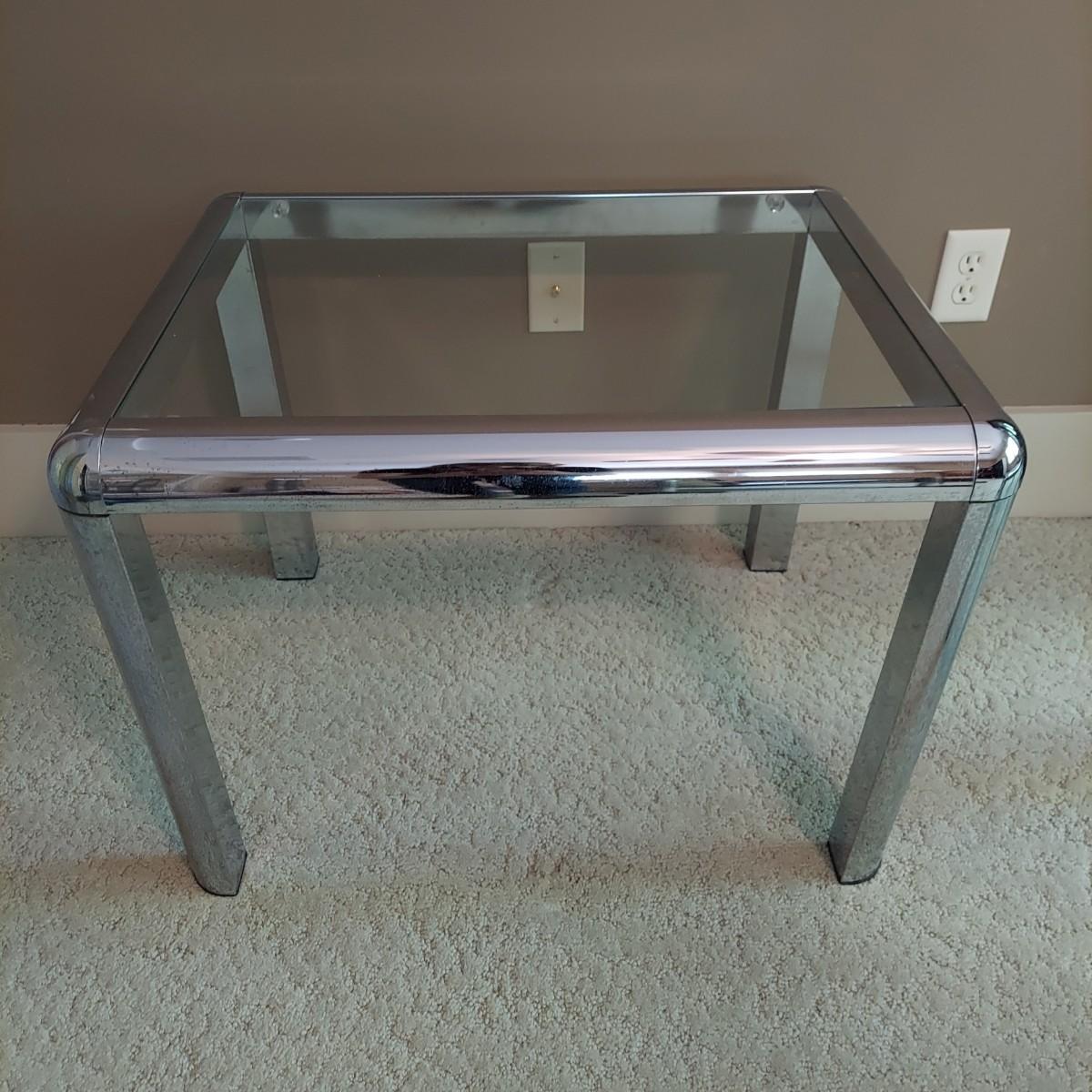 Two modern style chrome and glass side tables. One stacks over the other. They appear to be vintage based on the overall build but there are no visible makers' marks. Small table is approximately 20" x 20" x 15"H. The large table is approximately 28" x 22" x 20"H. There is some rust speckle on the chrome. Local Pickup Only.
