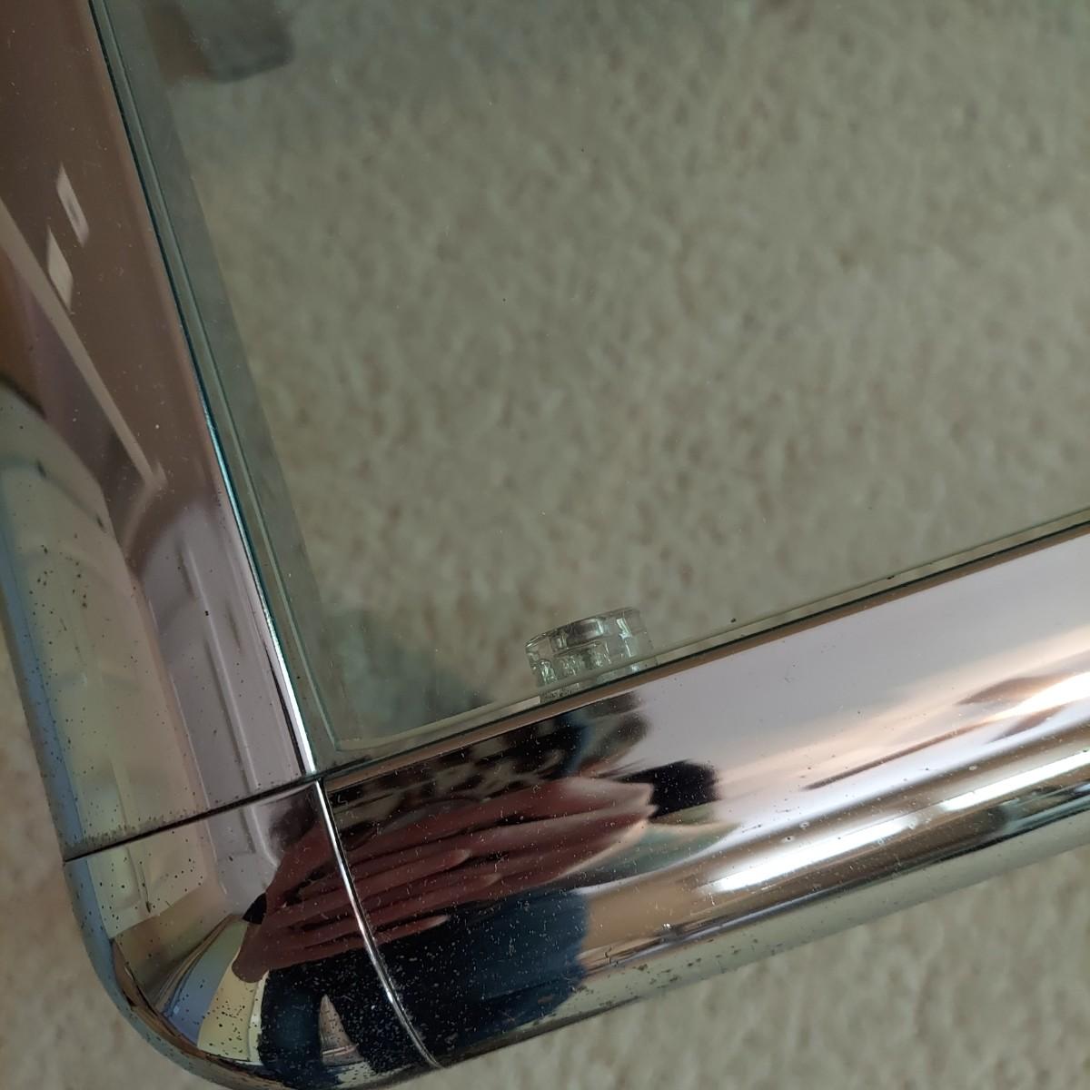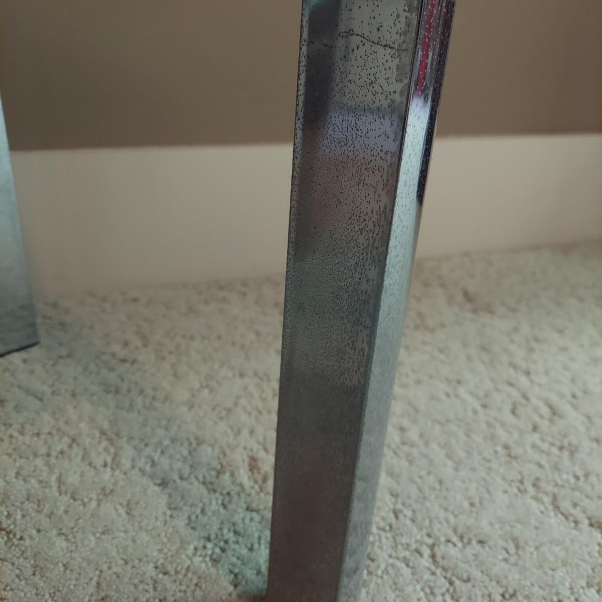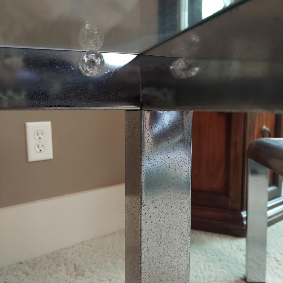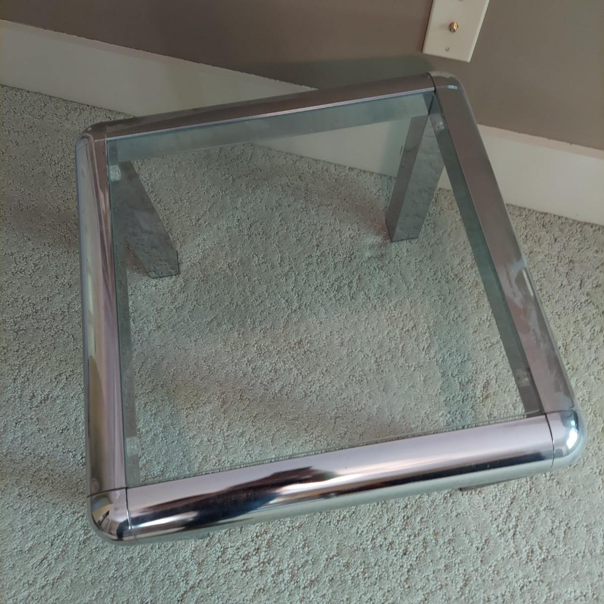 Two modern style chrome and glass side tables. One stacks over the other. They appear to be vintage based on the overall build but there are no visible makers' marks. Small table is approximately 20" x 20" x 15"H. The large table is approximately 28" x 22" x 20"H. There is some rust speckle on the chrome. Local Pickup Only.