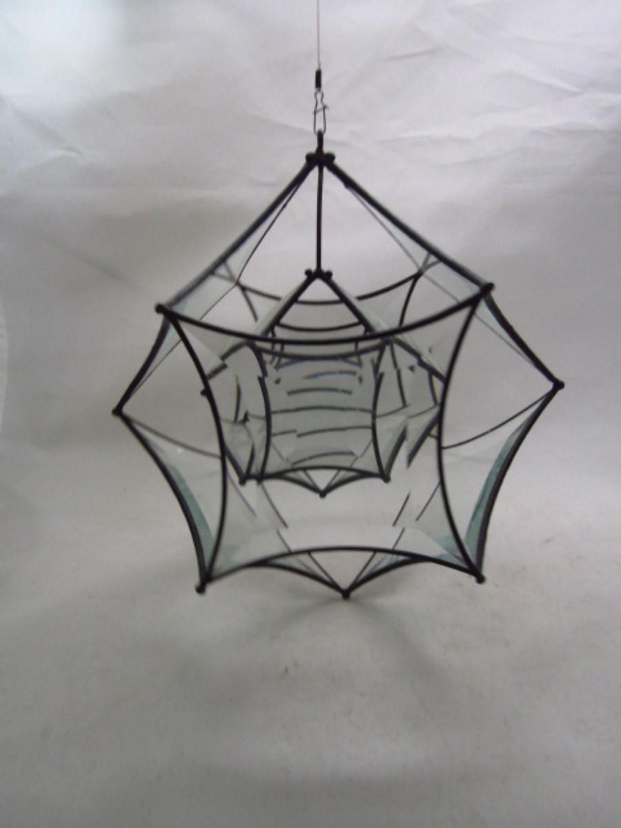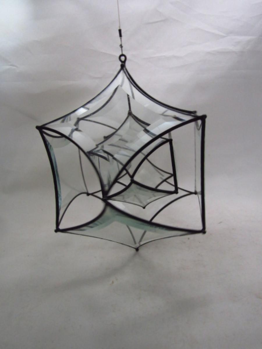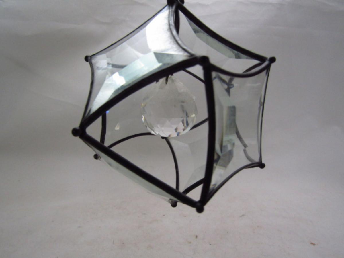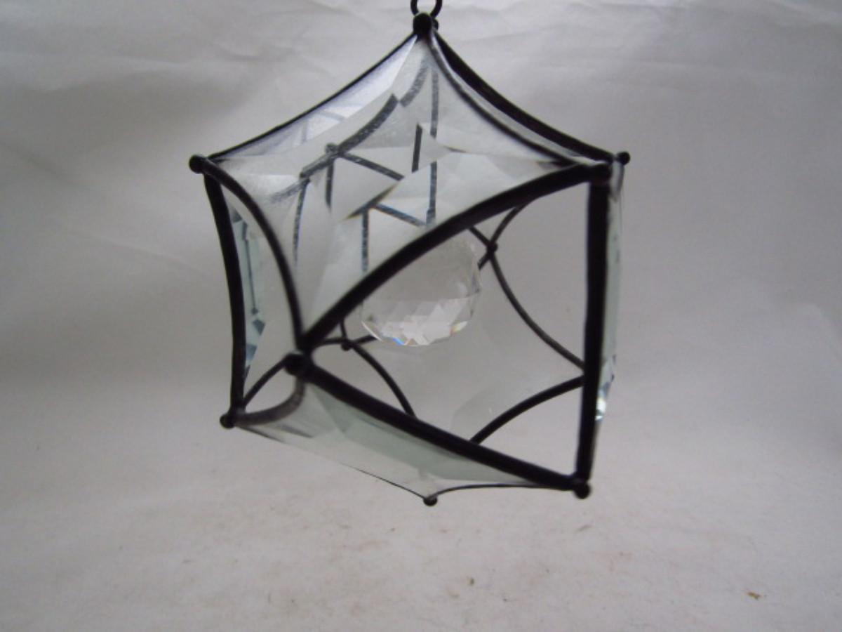 Two Clear Beveled Glass Geometric Hanging Sun Catchers. Two sizes- one is approx 6" across, the other is approx 3" across. The smaller one has a crystal in the middle.