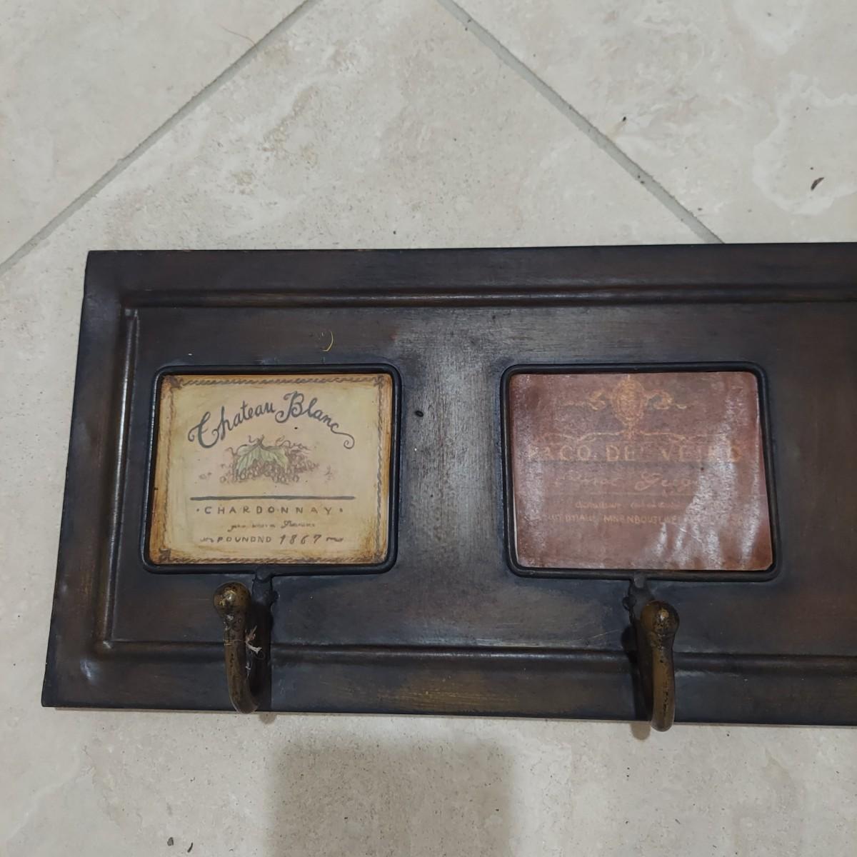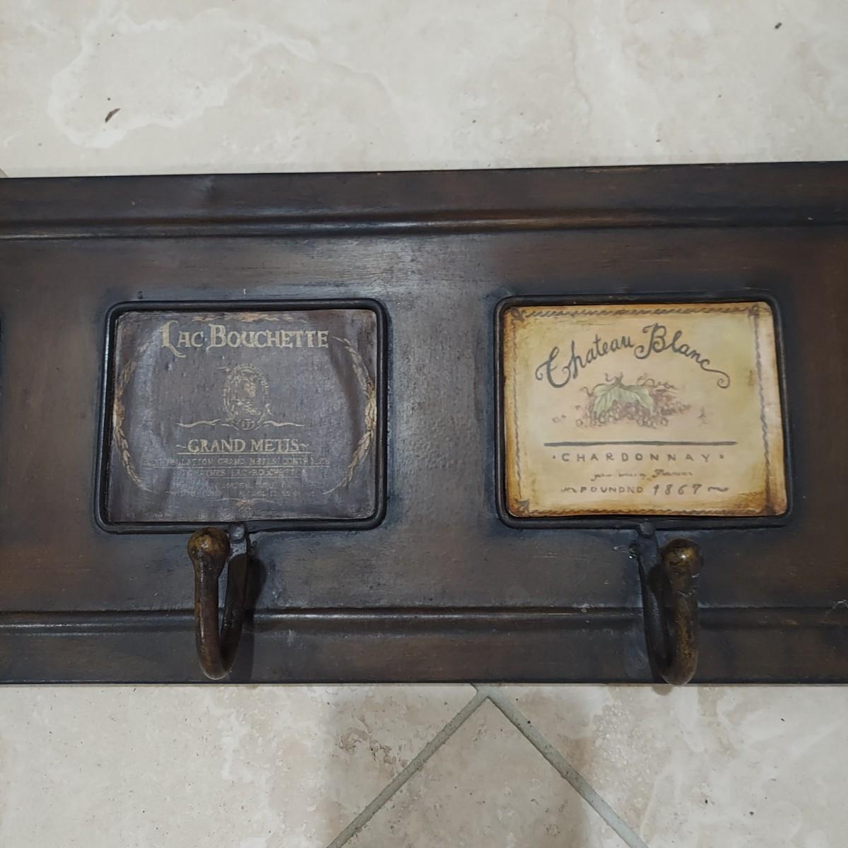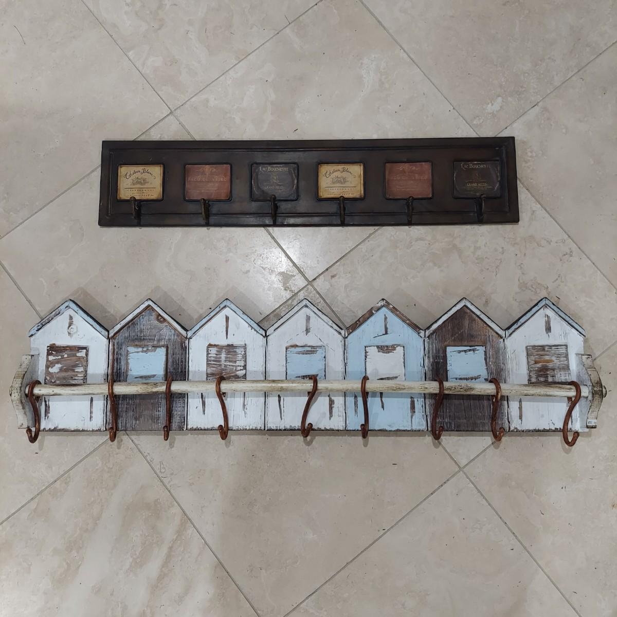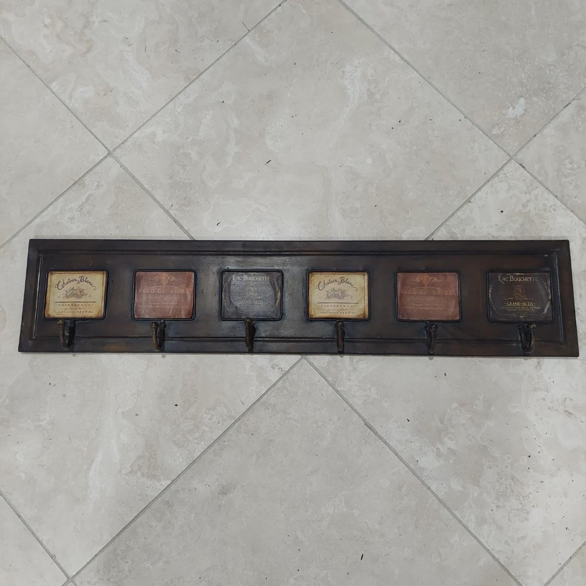 This lot has two wall mounted hook racks. The wooden piece has heavy metal hooks that slide freely. The shabby chic houses are brown, white and pale blue with intentionally chipping paint and rusty looking hooks. It measures approximately 42.5" x 3" x10"H. The metal piece is lightweight with a faux bronze color. The wine labels are stickers and some are starting to peel up. Please see photos. This measures approximately 33" x 0.5" x 7"H. Shipping available. Shipping can be costly. We suggest contacting our preferred local shipping provider, Postage Express, with dimensions and getting an estimate before bidding: (828) 670-5501or postageexpress@yahoo.com.