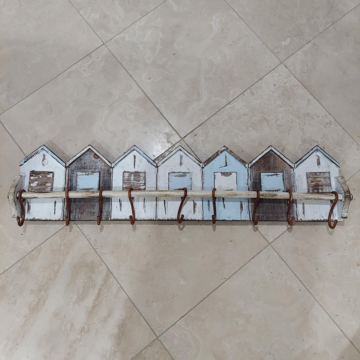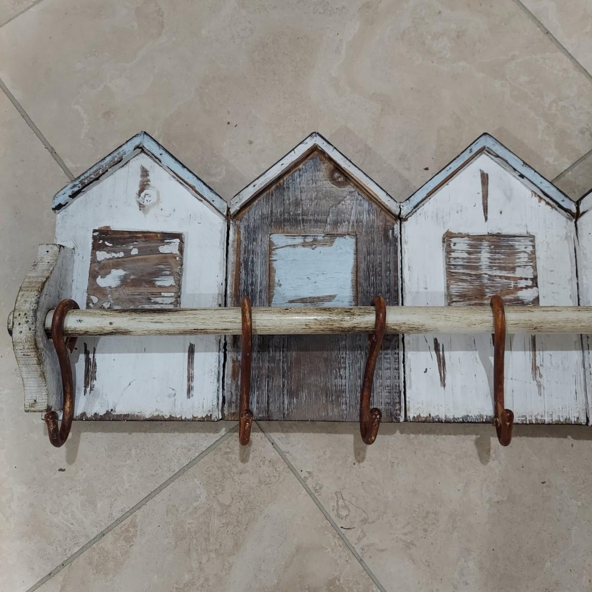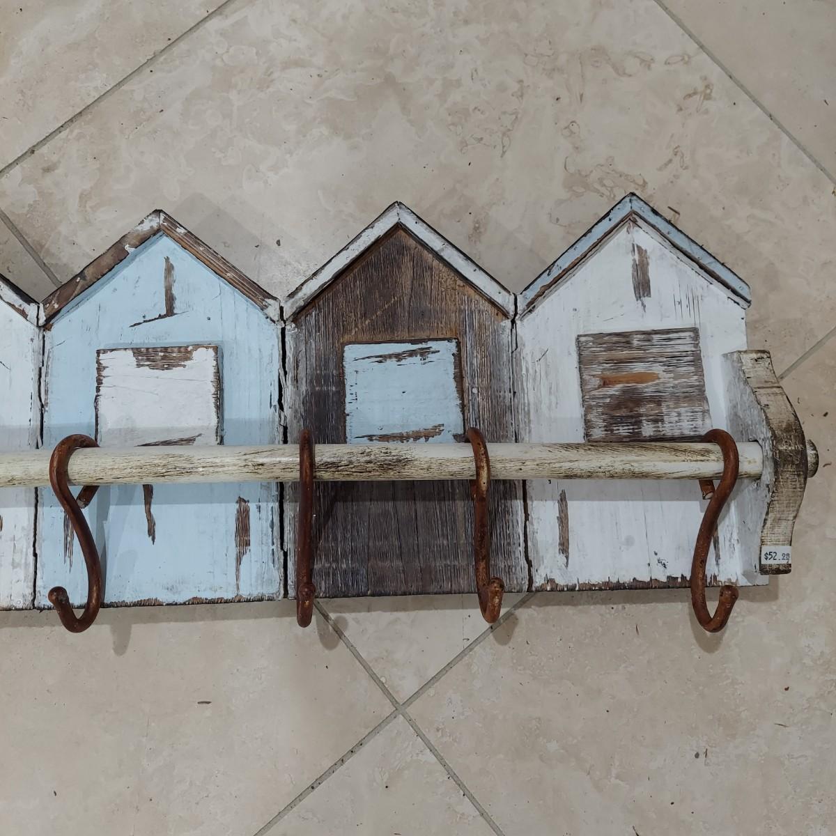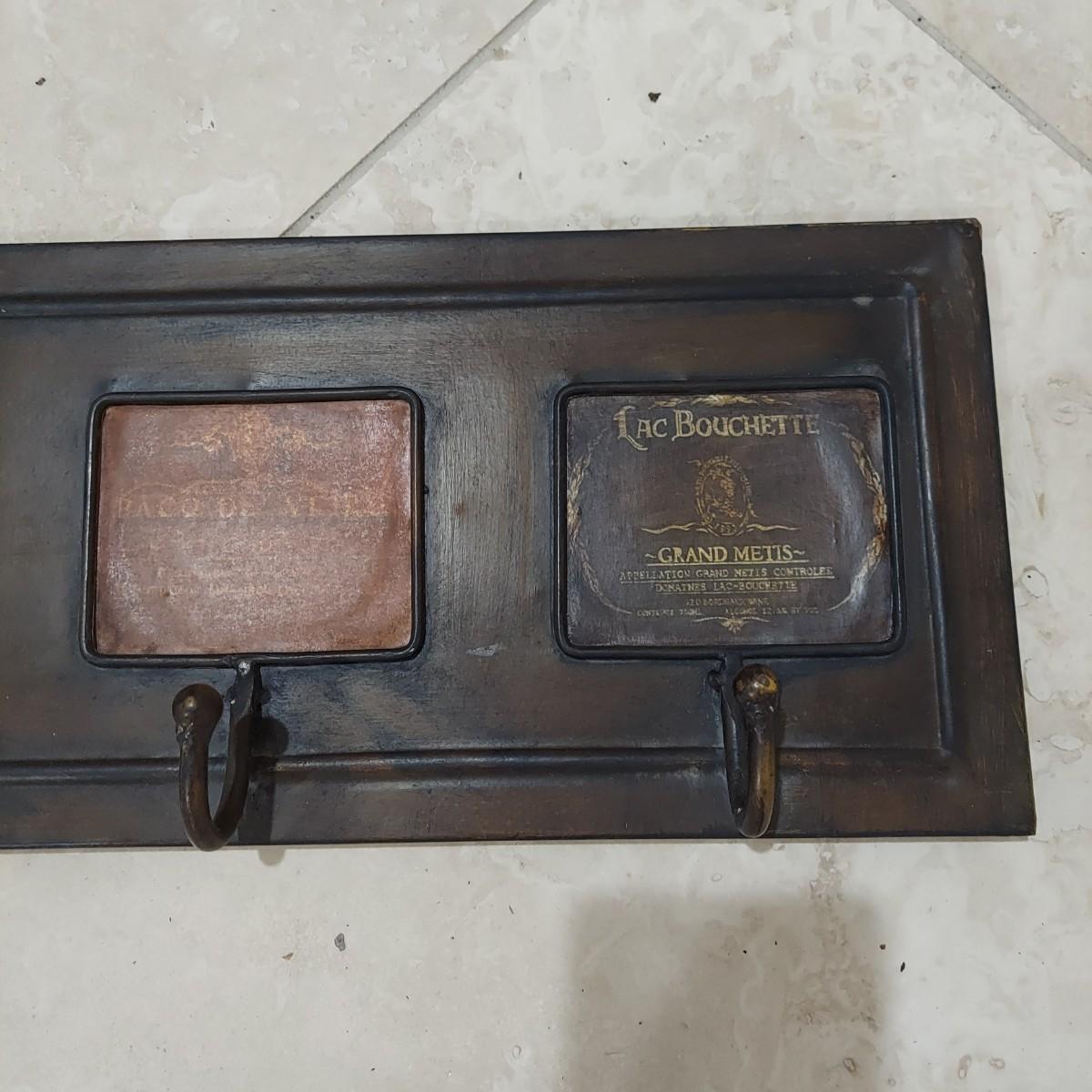 This lot has two wall mounted hook racks. The wooden piece has heavy metal hooks that slide freely. The shabby chic houses are brown, white and pale blue with intentionally chipping paint and rusty looking hooks. It measures approximately 42.5" x 3" x10"H. The metal piece is lightweight with a faux bronze color. The wine labels are stickers and some are starting to peel up. Please see photos. This measures approximately 33" x 0.5" x 7"H. Shipping available. Shipping can be costly. We suggest contacting our preferred local shipping provider, Postage Express, with dimensions and getting an estimate before bidding: (828) 670-5501or postageexpress@yahoo.com.