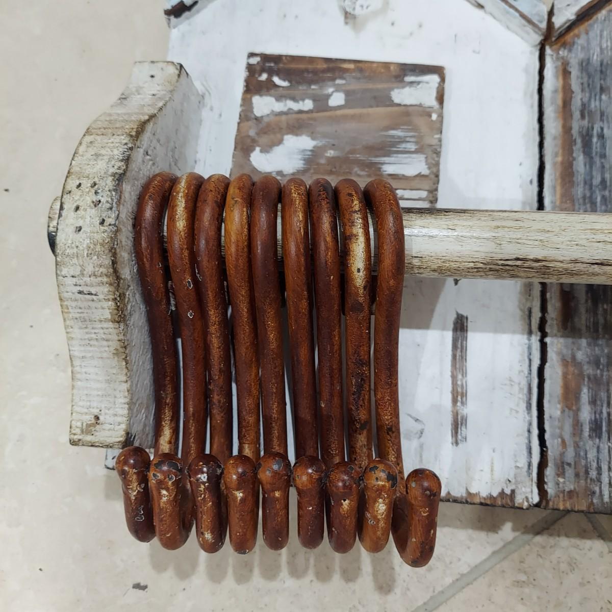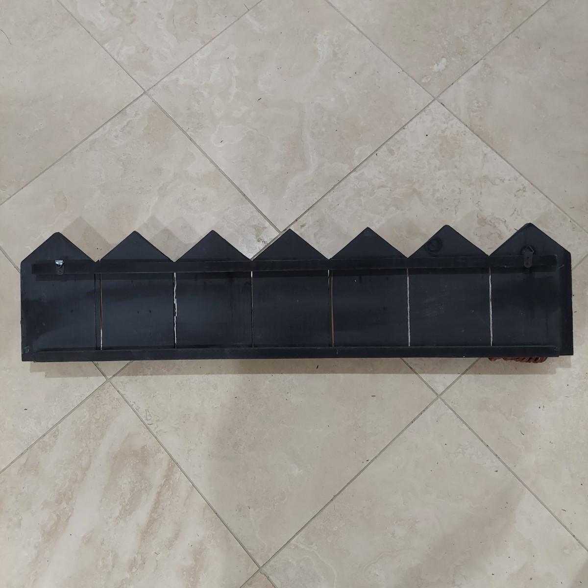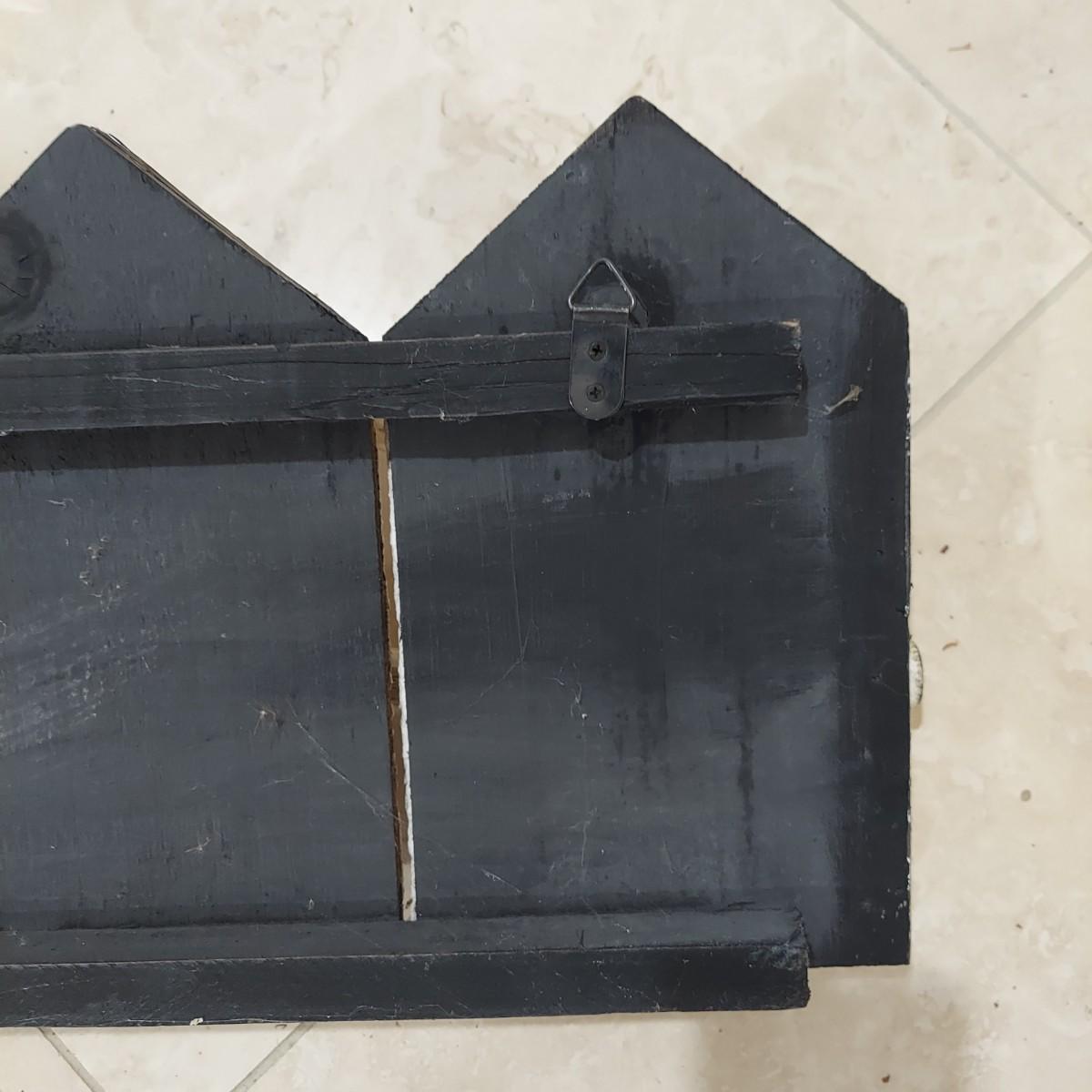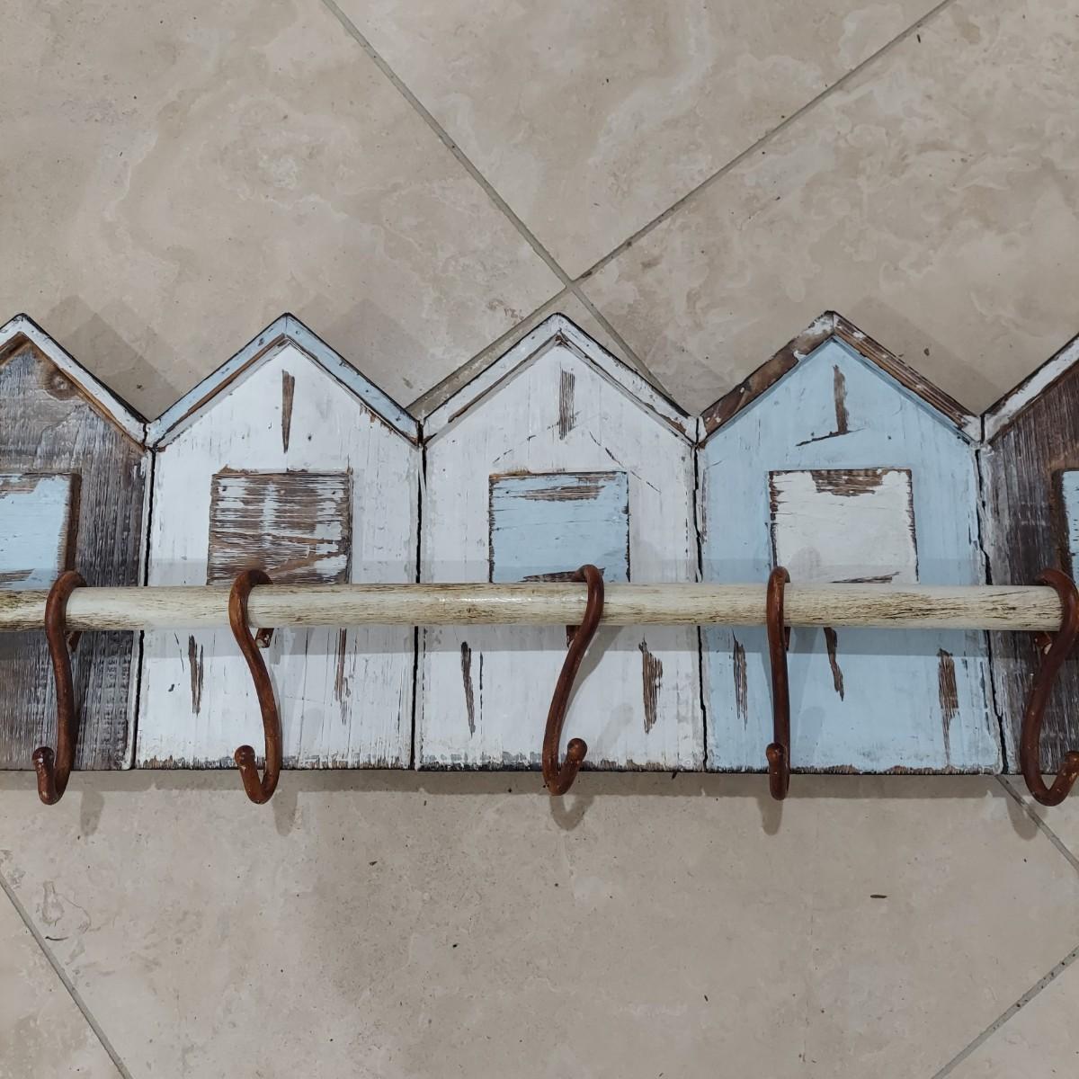 This lot has two wall mounted hook racks. The wooden piece has heavy metal hooks that slide freely. The shabby chic houses are brown, white and pale blue with intentionally chipping paint and rusty looking hooks. It measures approximately 42.5" x 3" x10"H. The metal piece is lightweight with a faux bronze color. The wine labels are stickers and some are starting to peel up. Please see photos. This measures approximately 33" x 0.5" x 7"H. Shipping available. Shipping can be costly. We suggest contacting our preferred local shipping provider, Postage Express, with dimensions and getting an estimate before bidding: (828) 670-5501or postageexpress@yahoo.com.