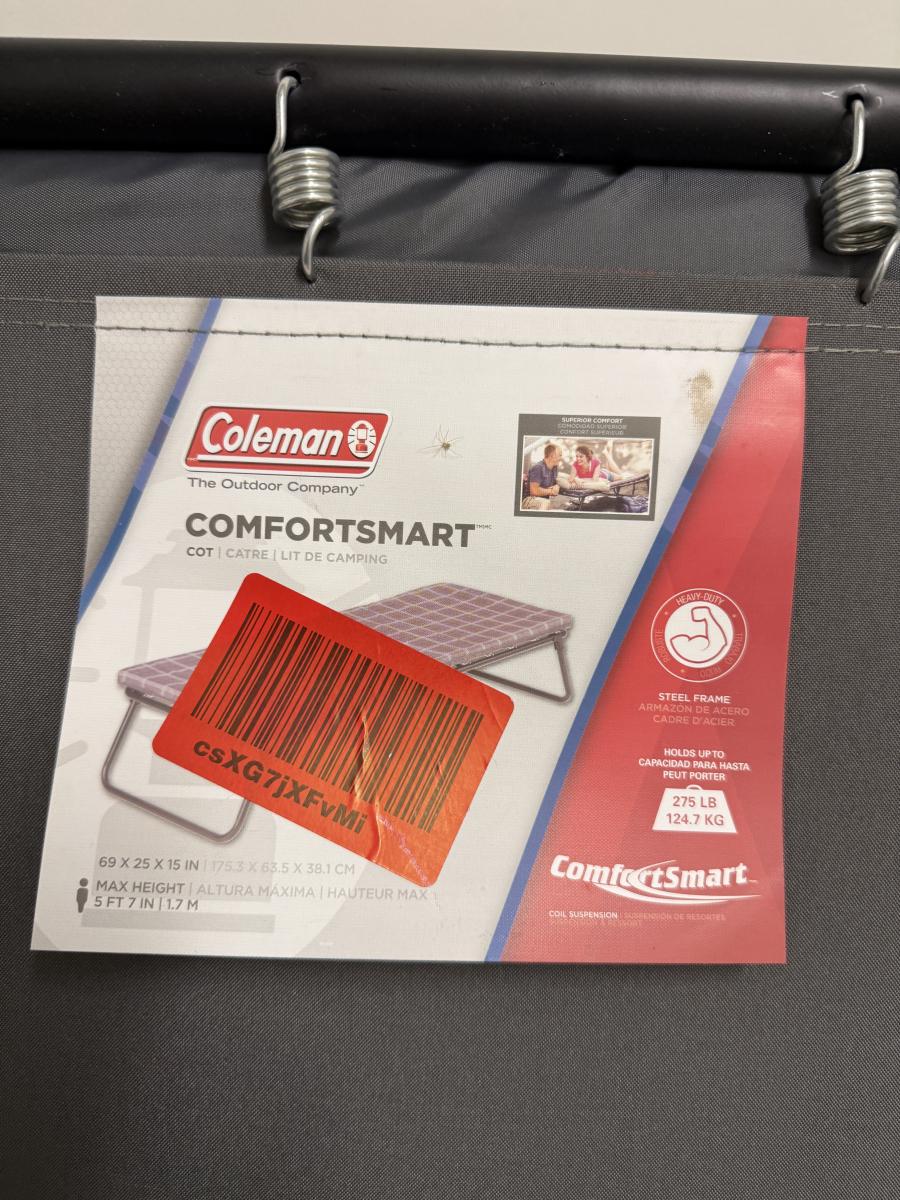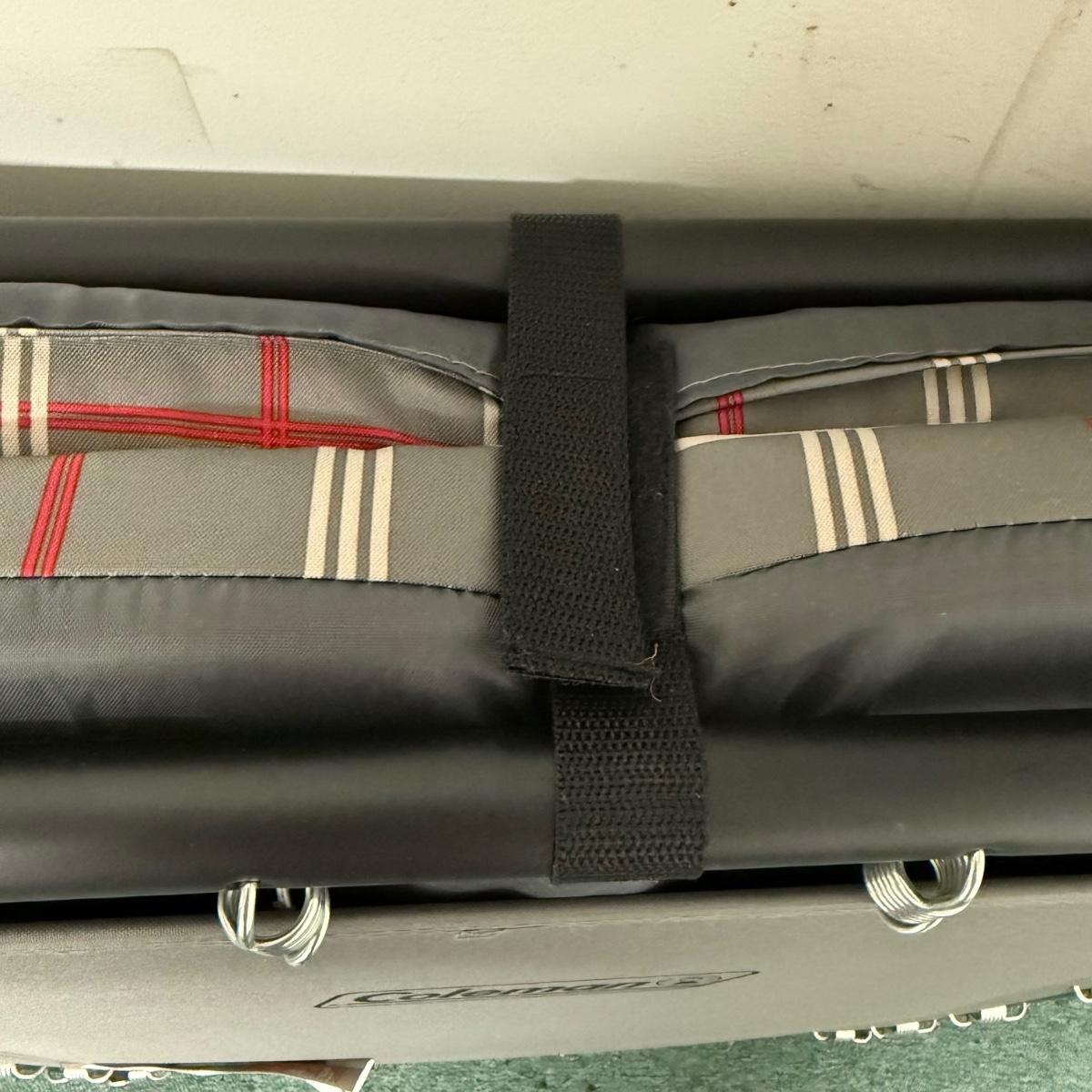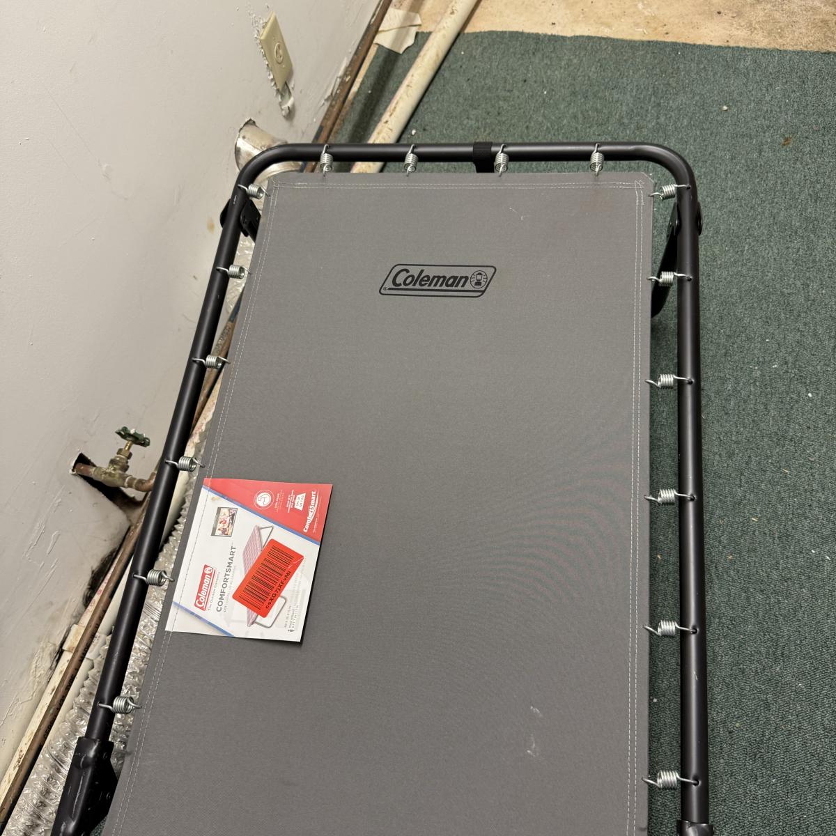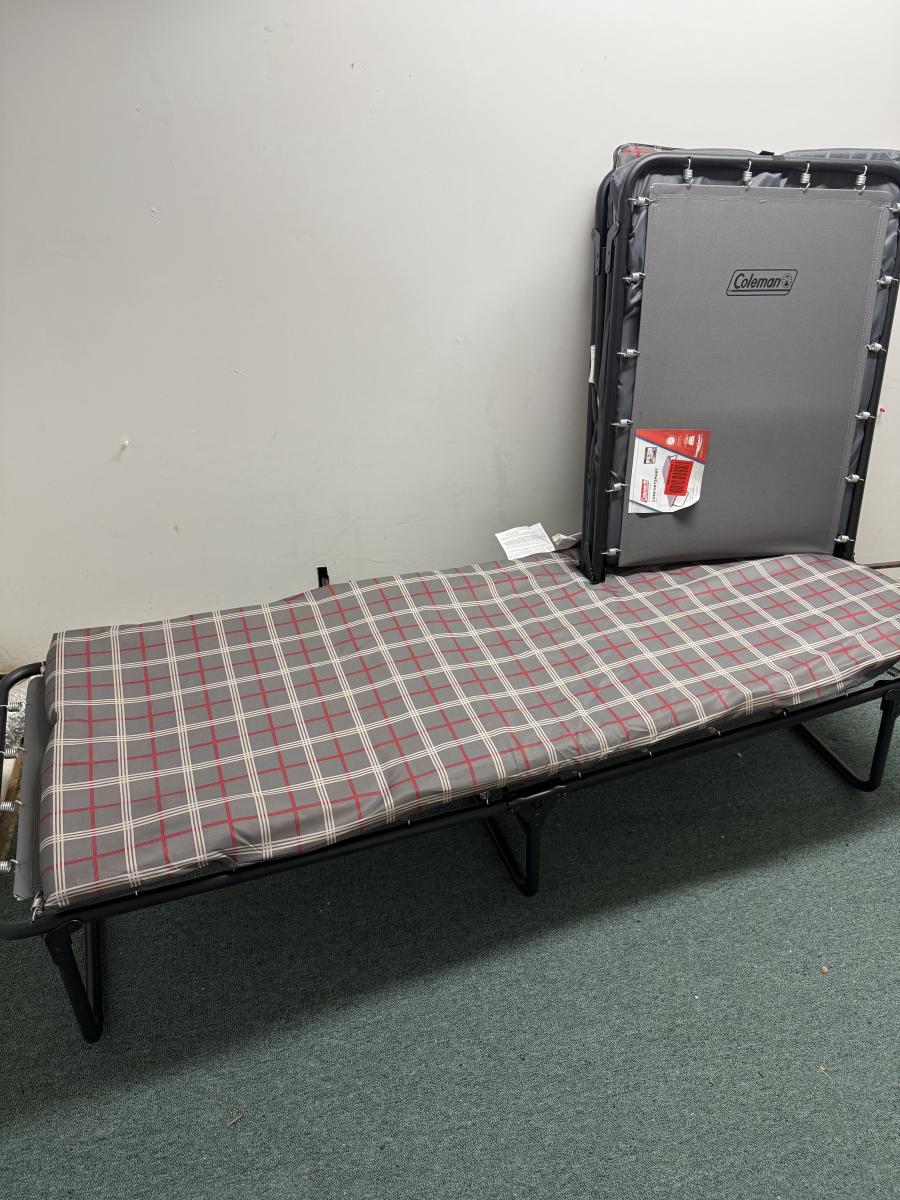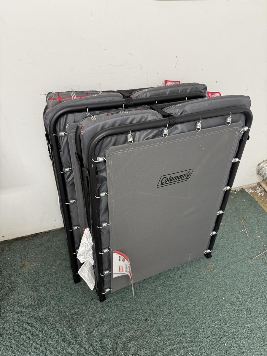 Two collapsible Coleman cots. Each measures 69” X 25” X 14”H. The mattresses are removable. When collapsed they measure. approximately 25” X 35” X 6”H.